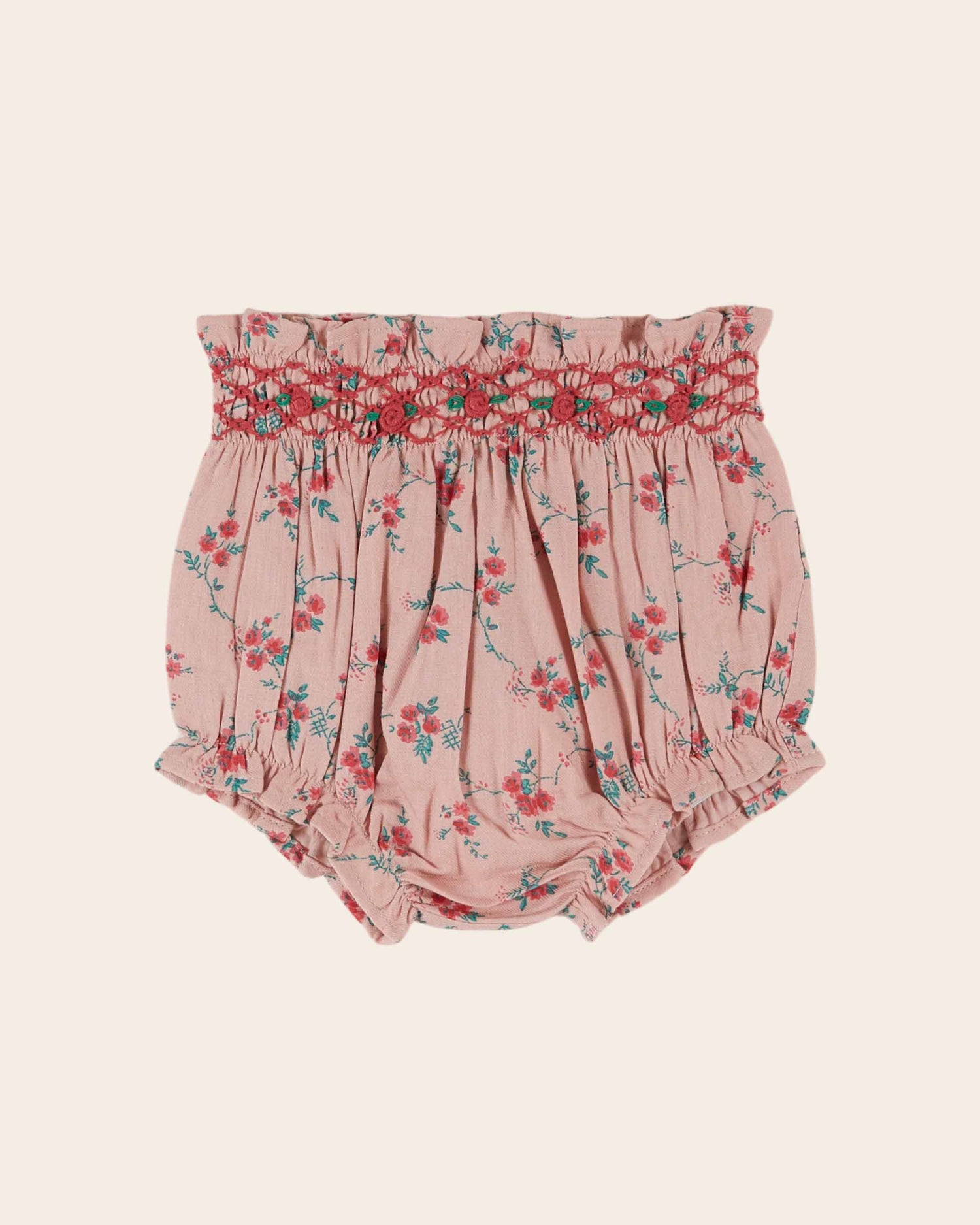 Bloomer à smocks en coton orné de bouquets fleuris sur fond rose.