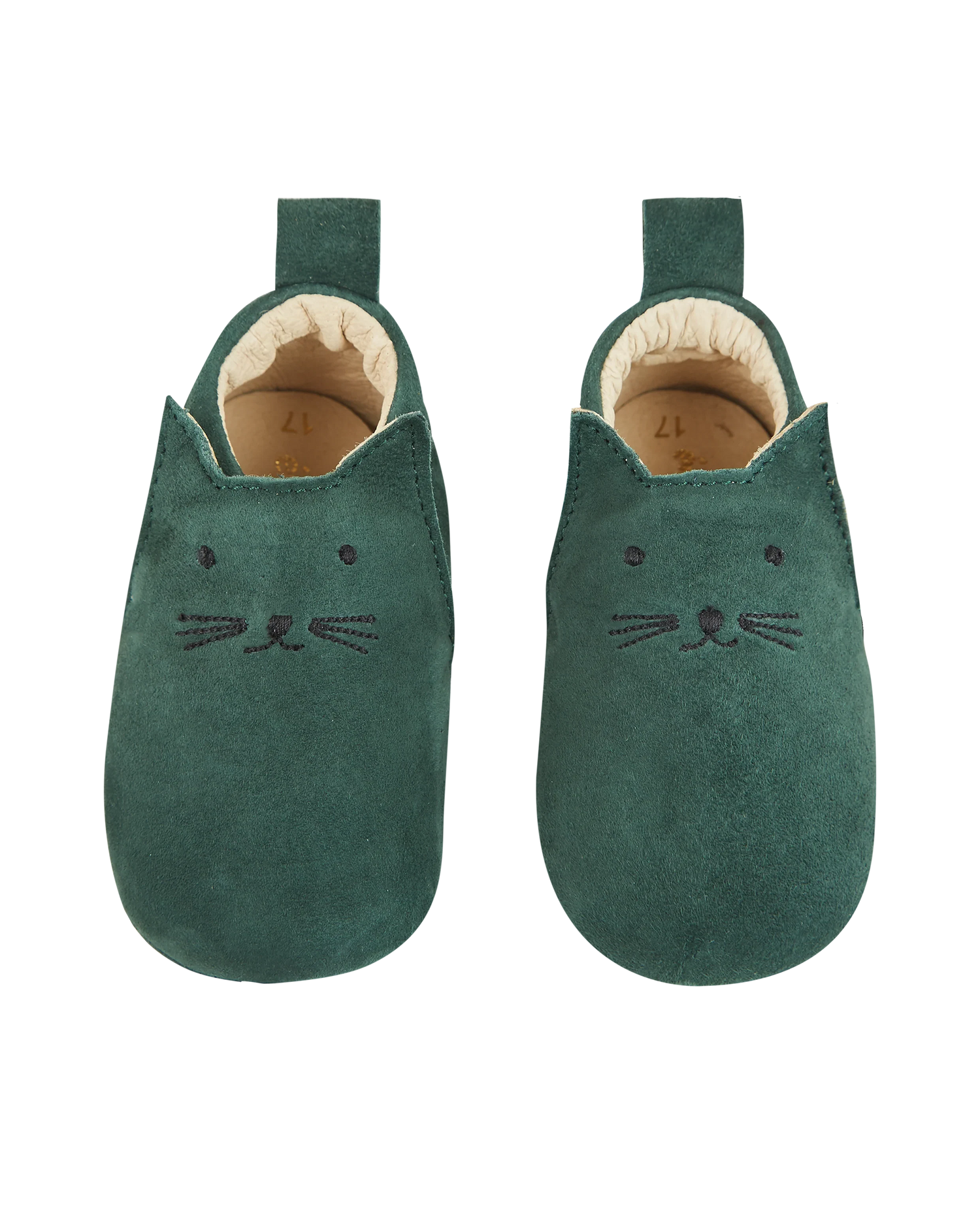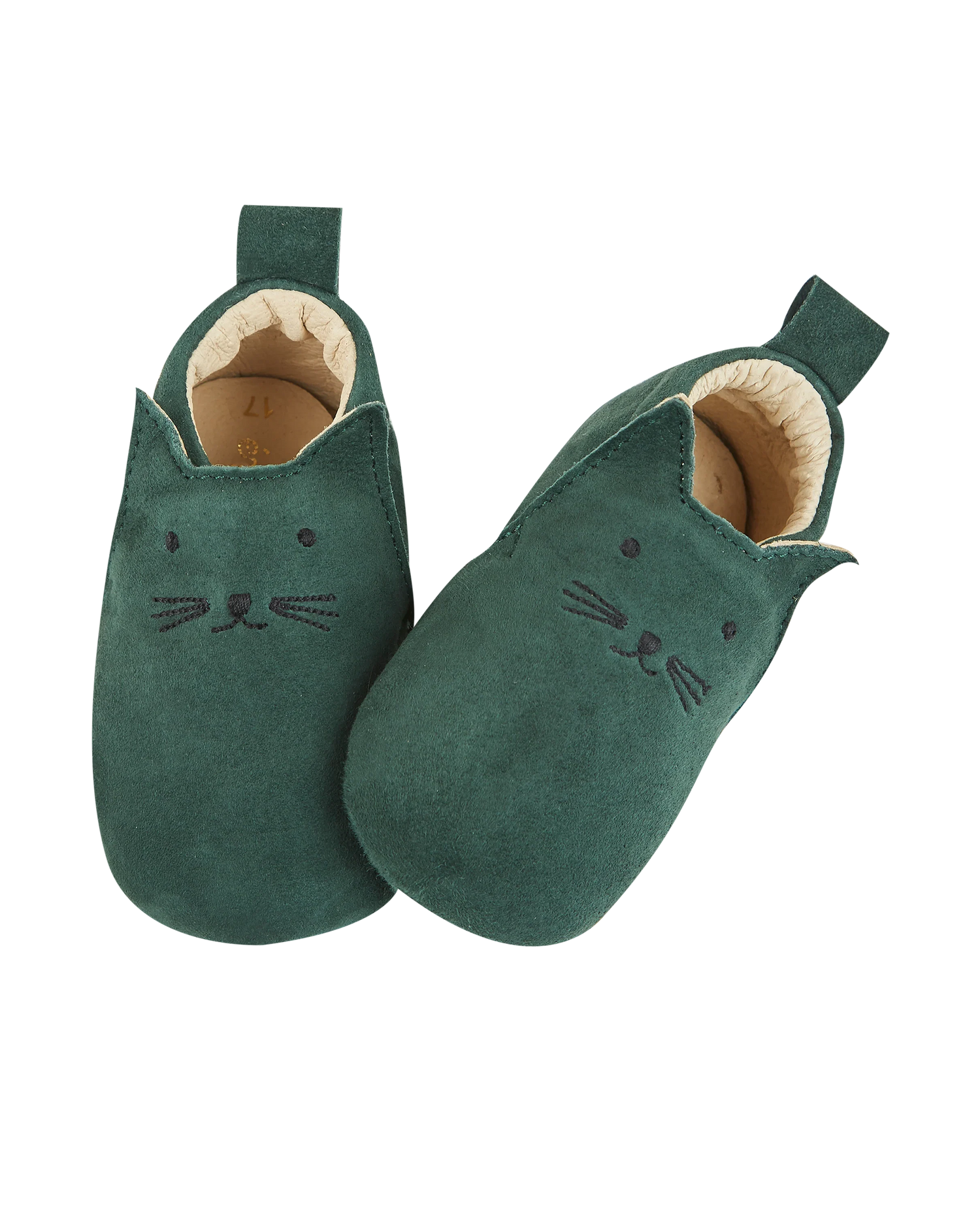 Chaussons chat en cuir velours vert foncé. Chez Emile & Ida, nous ne chaussons pas les bébés, nous déguisons leurs pieds. Charmants chaussons en cuir vert entièrement doublés cuir, souples, avec un élastique sous la languette et une tirette à l’arrière qui facilite l’enfilage. On aime le museau noir brodé sur le coup de pied et les petites oreilles pointues. Des chaussons pour faire patte de velours.