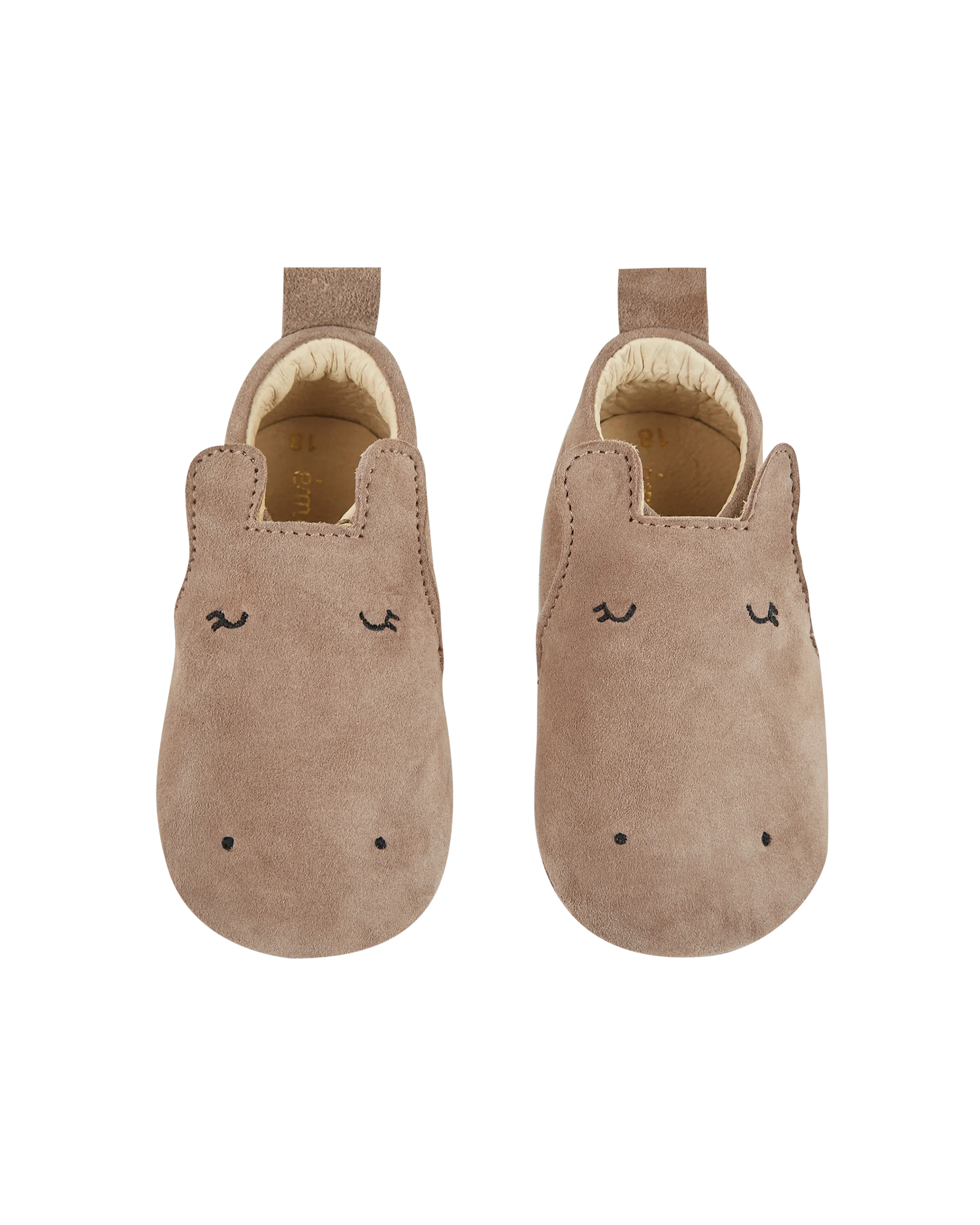 Chaussons hippopotame en cuir velours mastic. Chez Emile & Ida, nous ne chaussons pas les bébés, nous déguisons leurs pieds avec de charmants chaussons entièrement doublés cuir, souples, avec un élastique sous la languette et une tirette à l’arrière pour faciliter l’enfilage. On aime les narines et les yeux brodés sur l’empeigne et les oreilles qui entendent toutes les confidences mais savent garder les secrets.