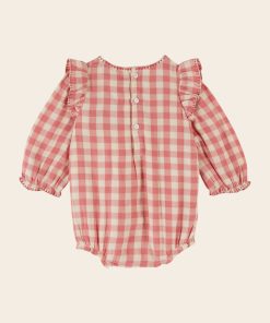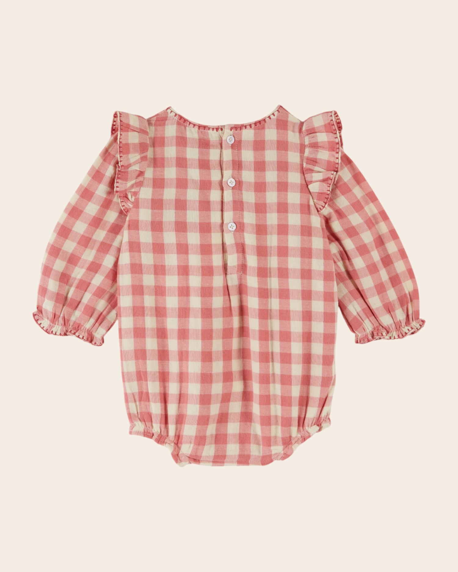 Combibloomer en coton tout doux vichy rose et écru. Il est agrémenté par des points de broderie rose tyrien et des fleurs brodées au point de croix par des artisans indiens.