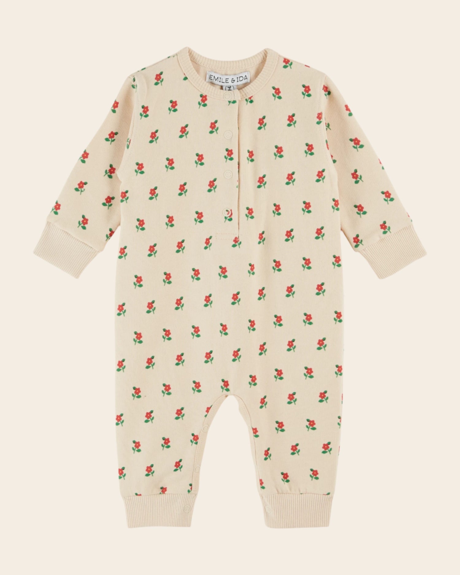 Combinaison en coton biologique molletonné et gratté crème imprimé de coquelicots rouges en all-over.