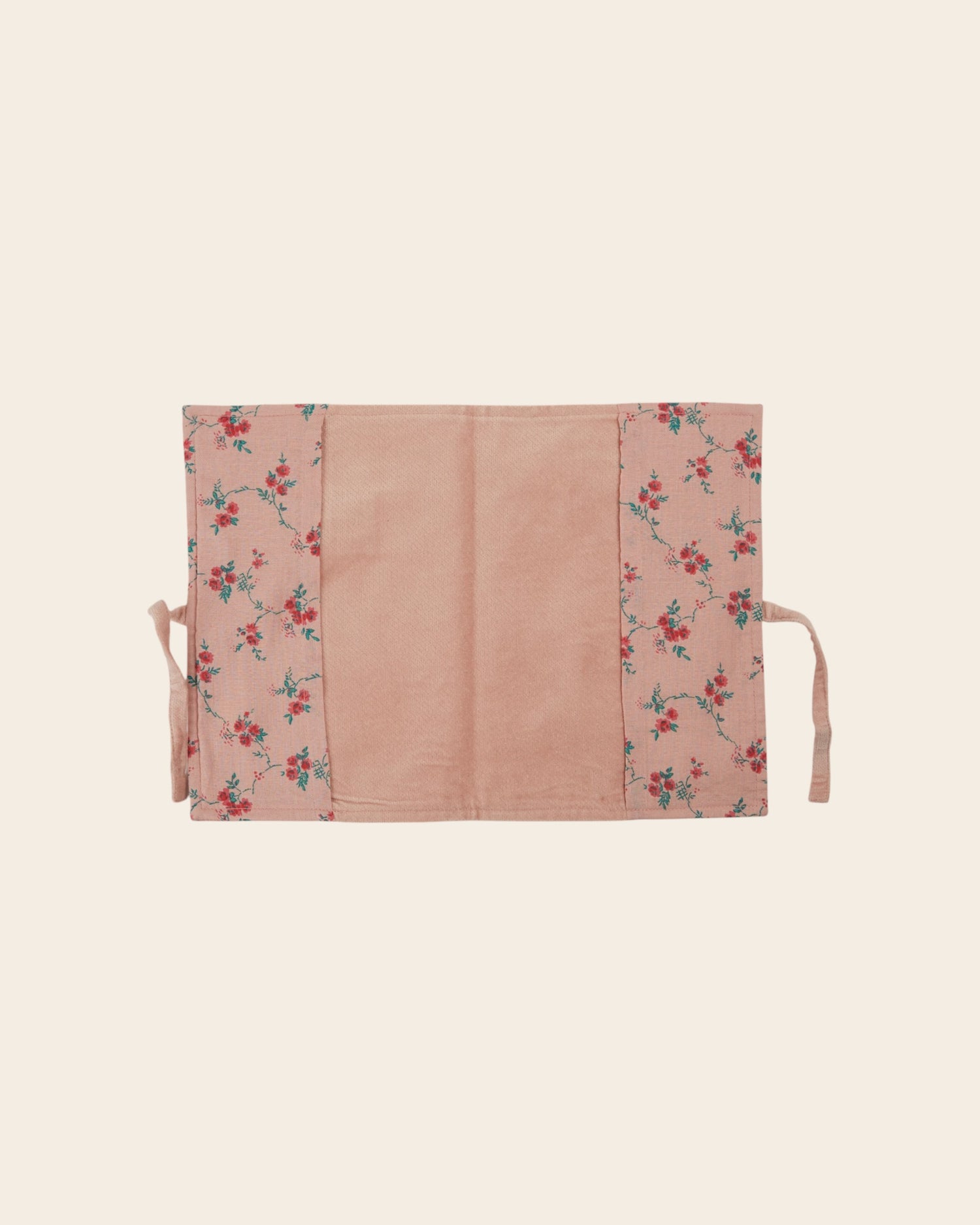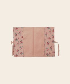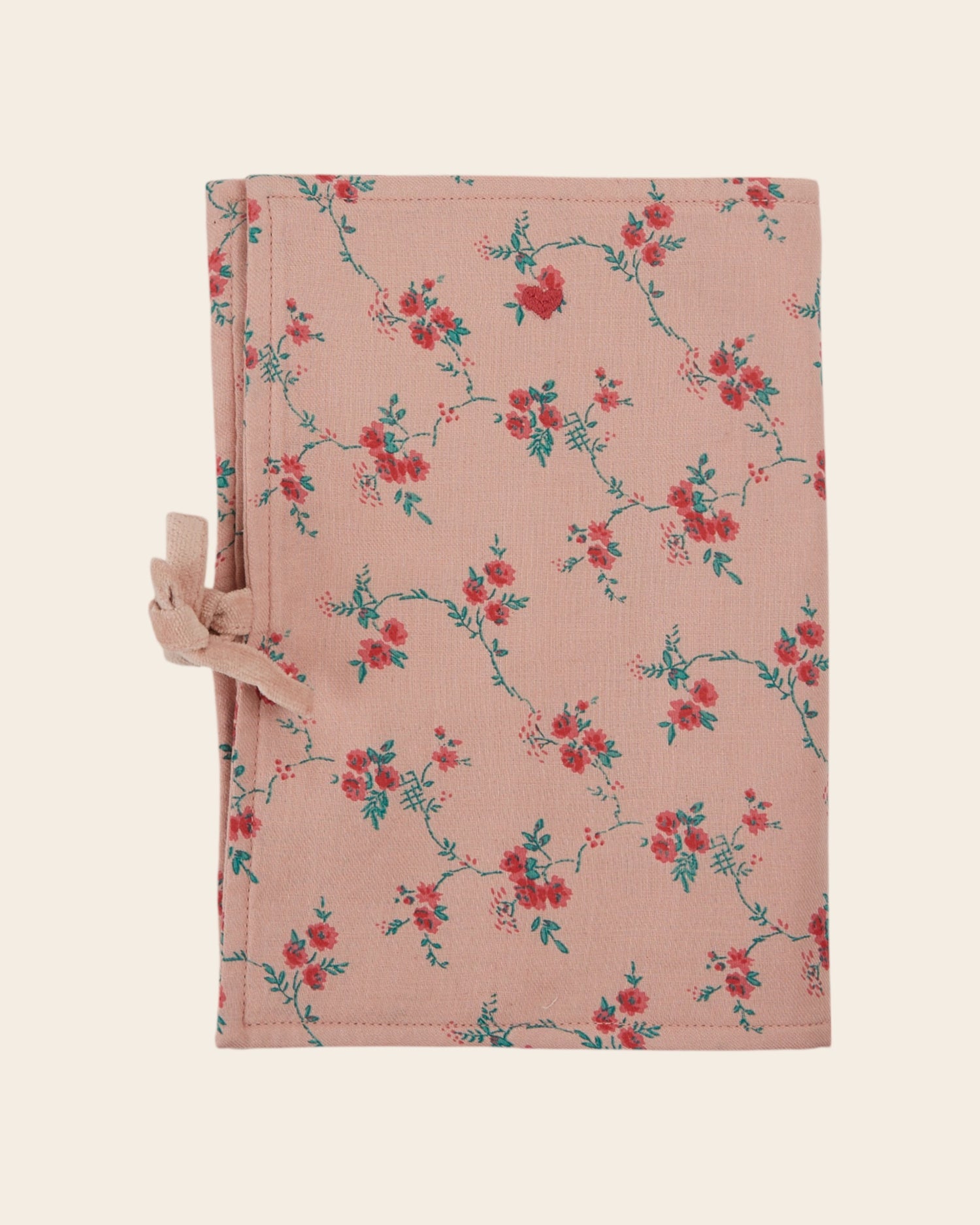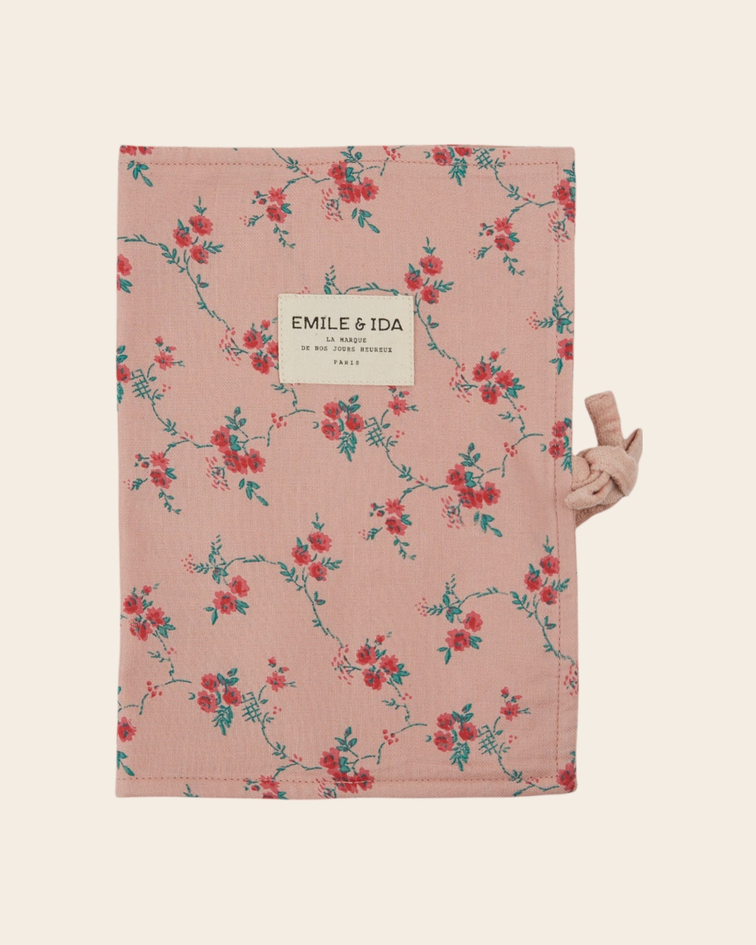 Couverture pour carnet de santé en coton rose parsemé de bouquets fleuris rouges. Elle est doublée en velours de coton rose. Une jolie couverture qui personnalise vos documents.