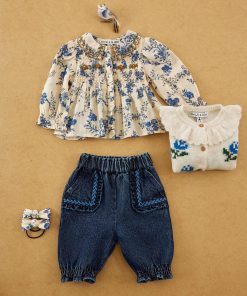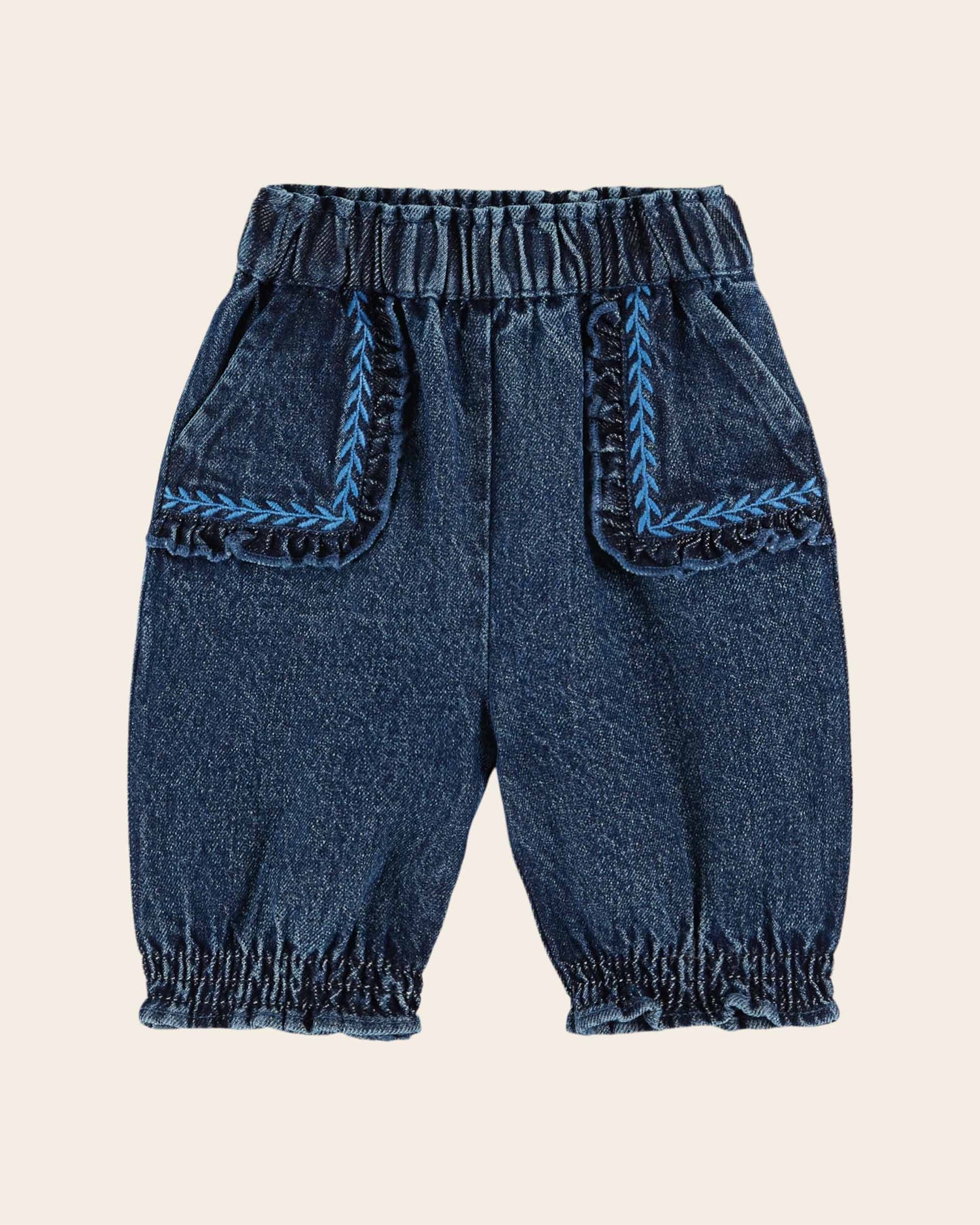 Pantalon en coton denim bleu avec des poches brodées d’une guirlande de fleurs bleues et volantées sur le pourtour.