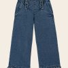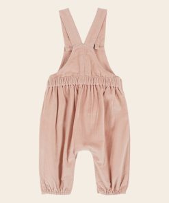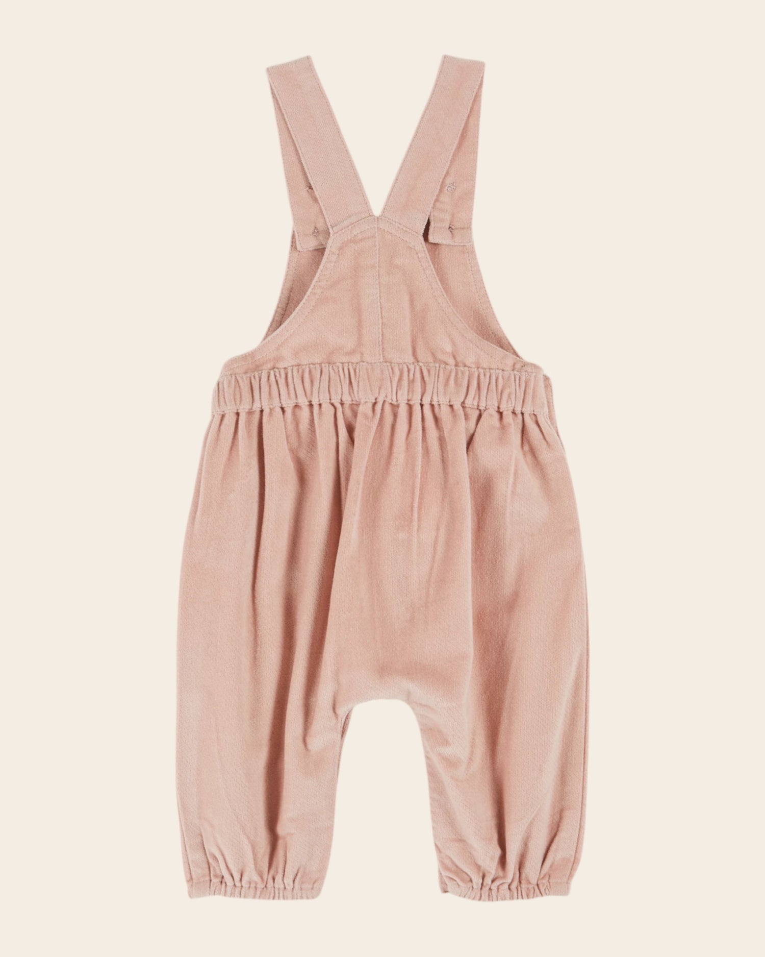 Salopette en velours de coton ras rose poudré animée par deux poches fleurs plaquées.