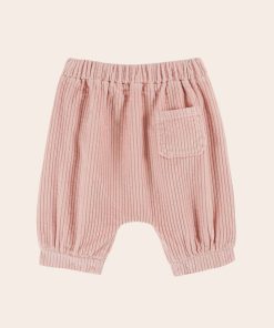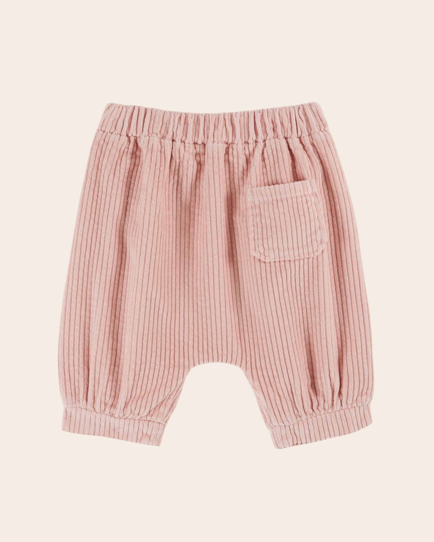 Pantalon sarouel en velours de coton à grosses côtes rose.
