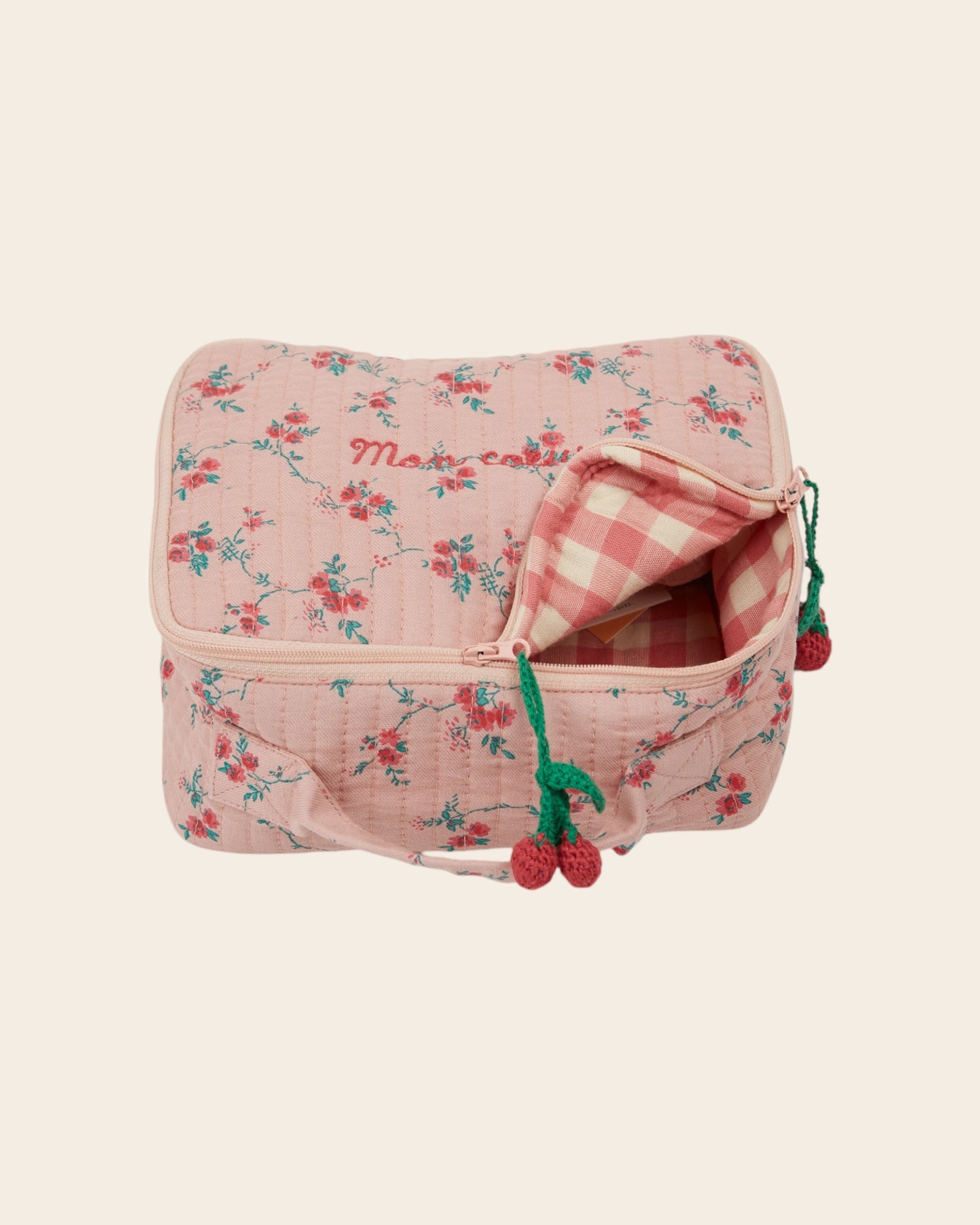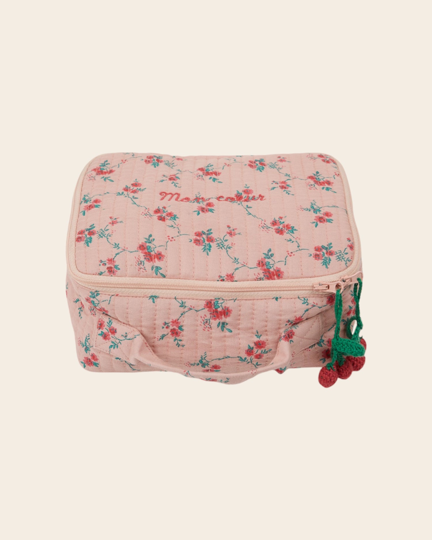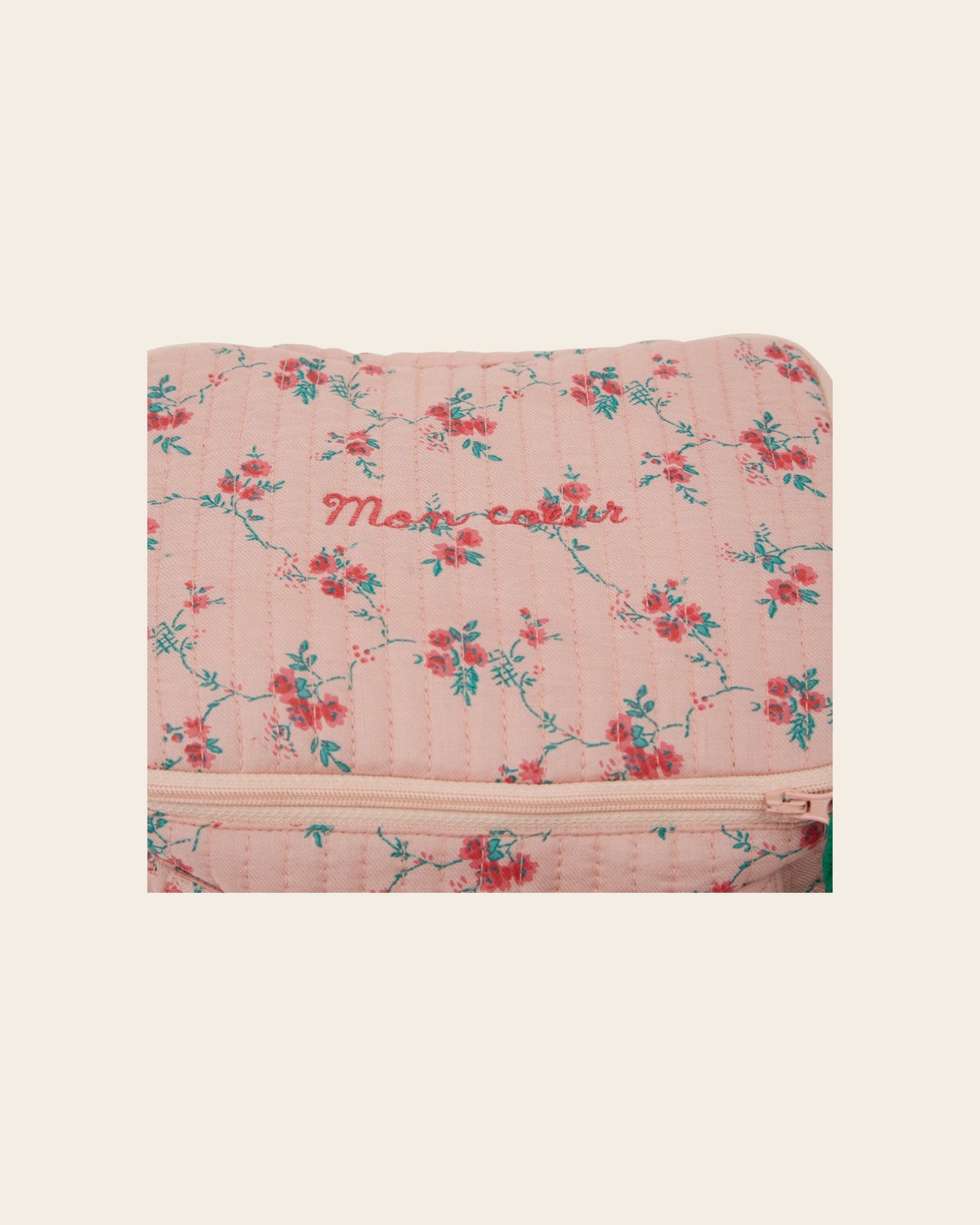 Trousse de naissance en flanelle de coton molletonnée, imprimée de bouquets fleuris sur fond rose. Une broderie rose » Mon Cœur » égaye le dessus de la mallette.