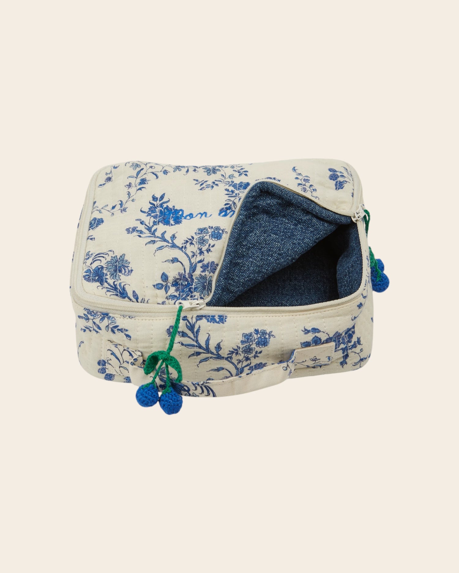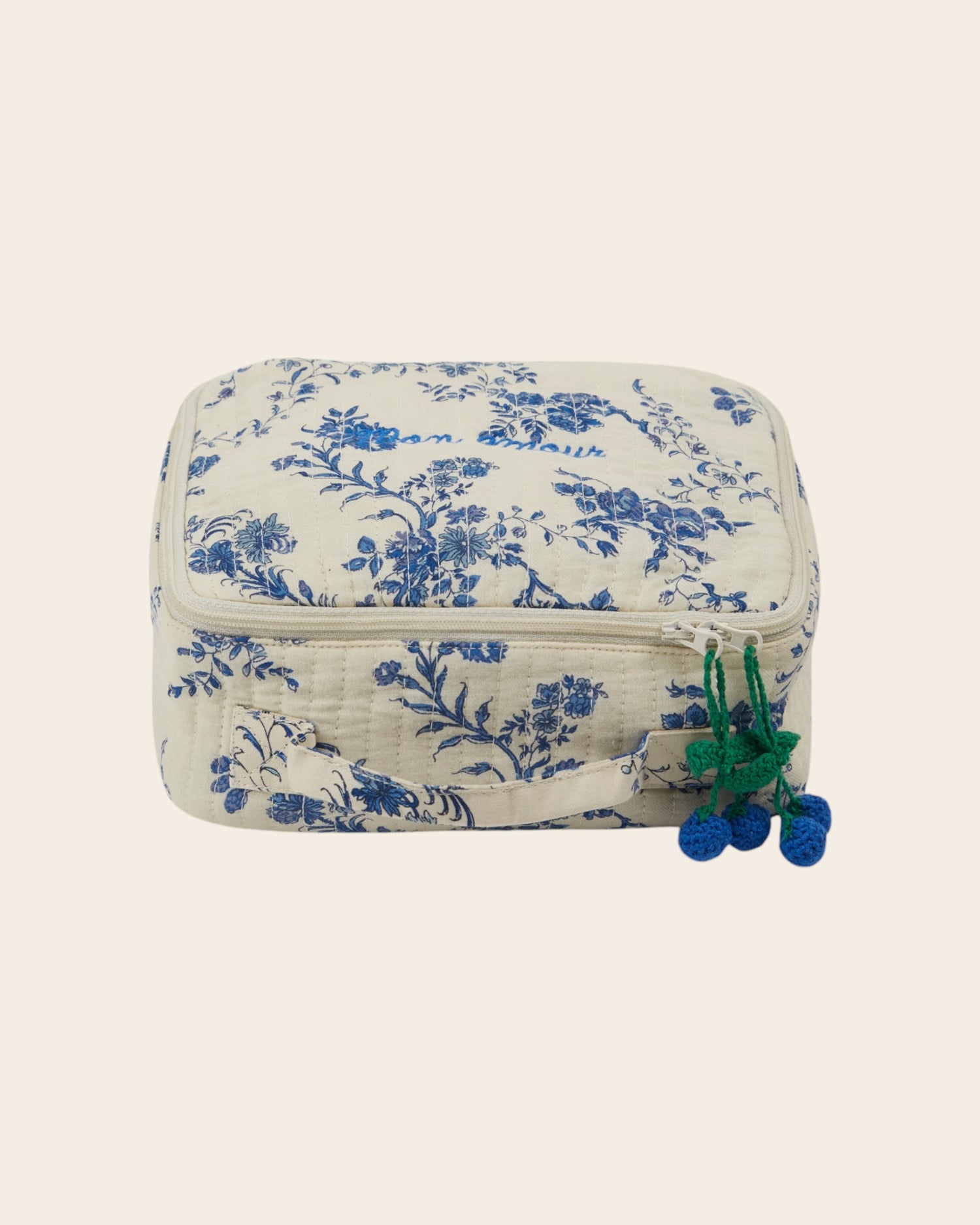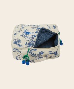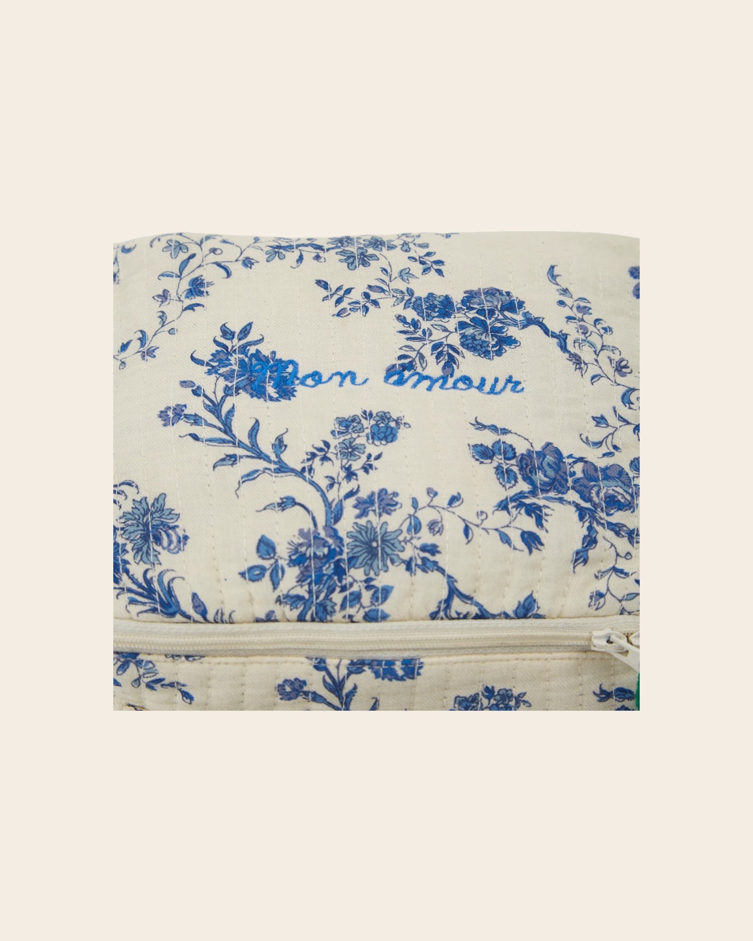 Trousse de naissance en coton molletonnée, écrue parsemée de fleurs bleues. Une broderie bleue » Mon Amour » égaye le dessus de la mallette.