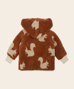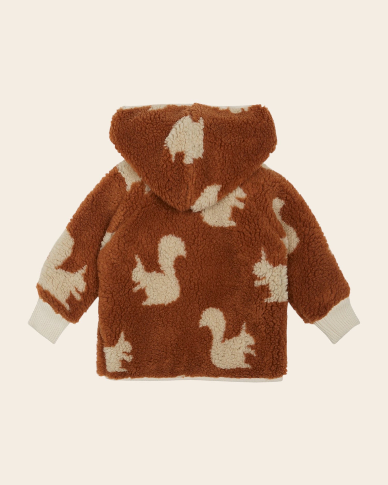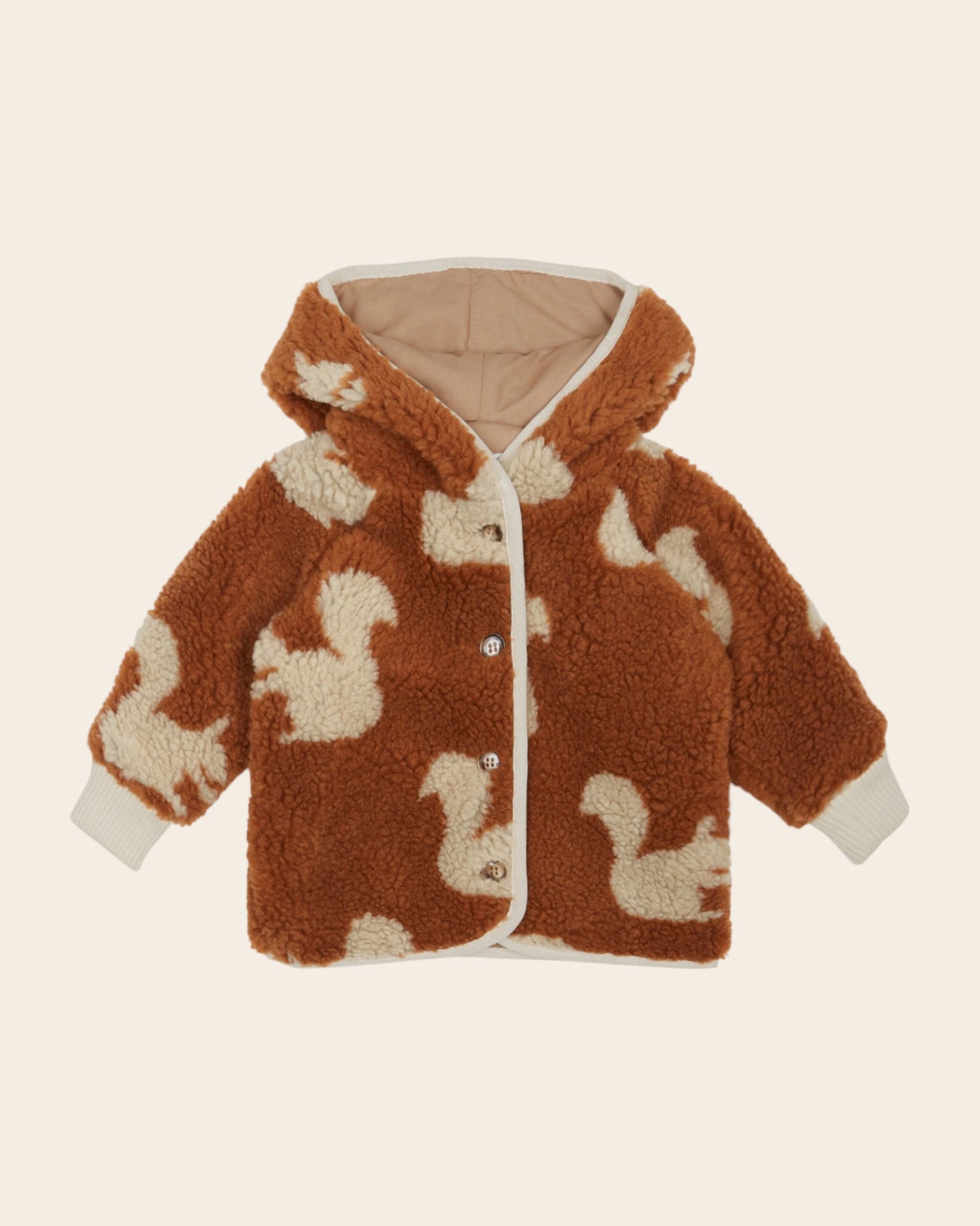 Veste moumoute à capuche en fourrure synthétique caramel imprimées d’écureuils écrus.