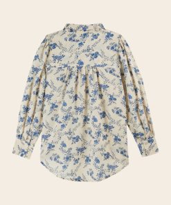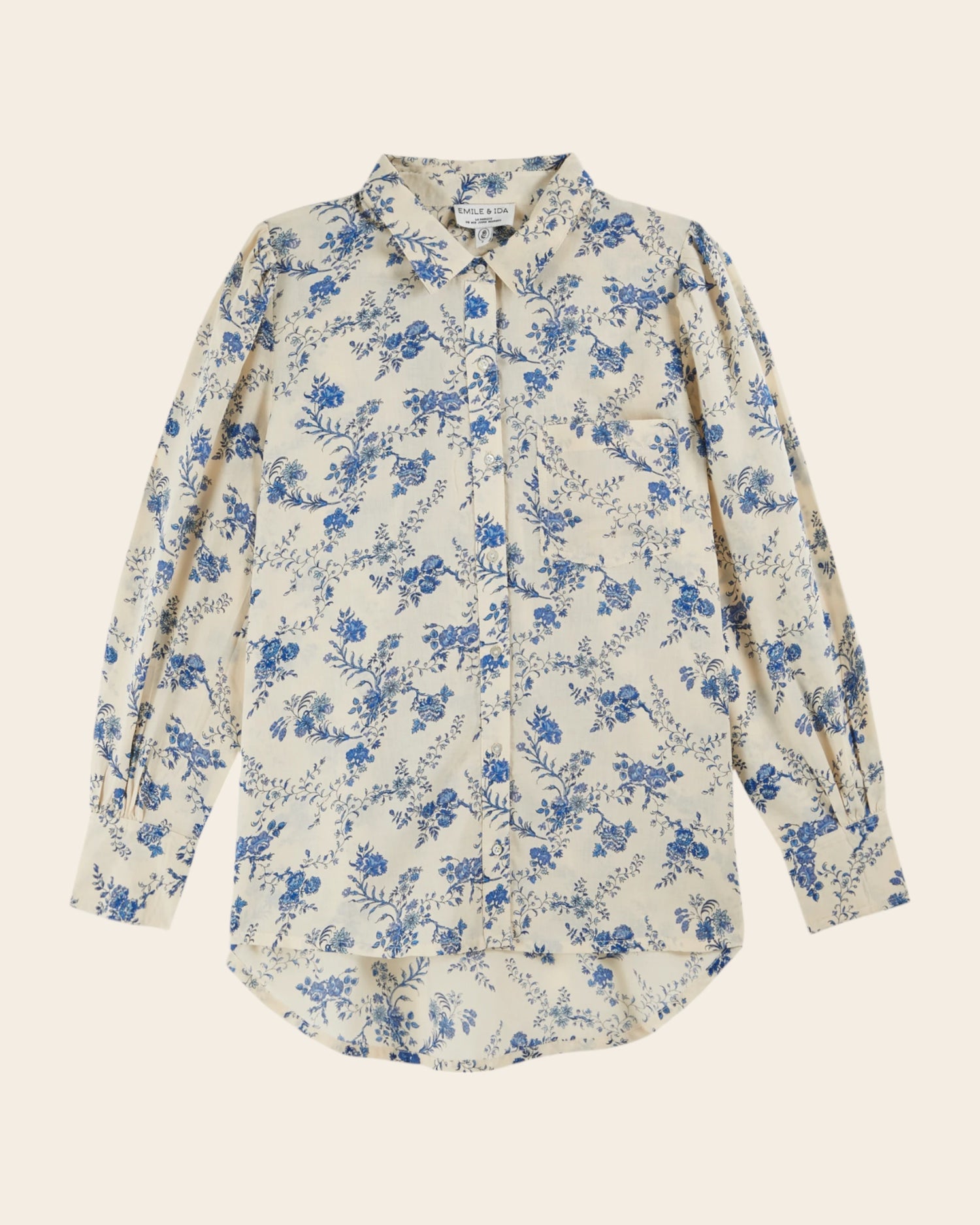 Chemise en coton écru ornée de fleurs bleues sur fond écru. La coupe over-size s’inspire des chemises d’homme.