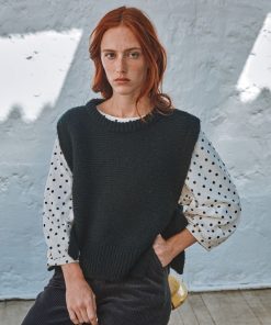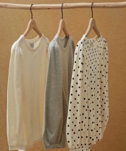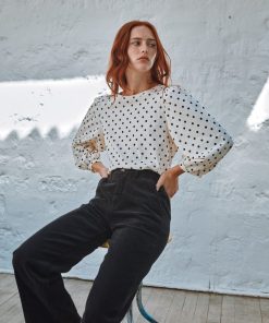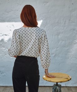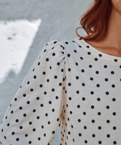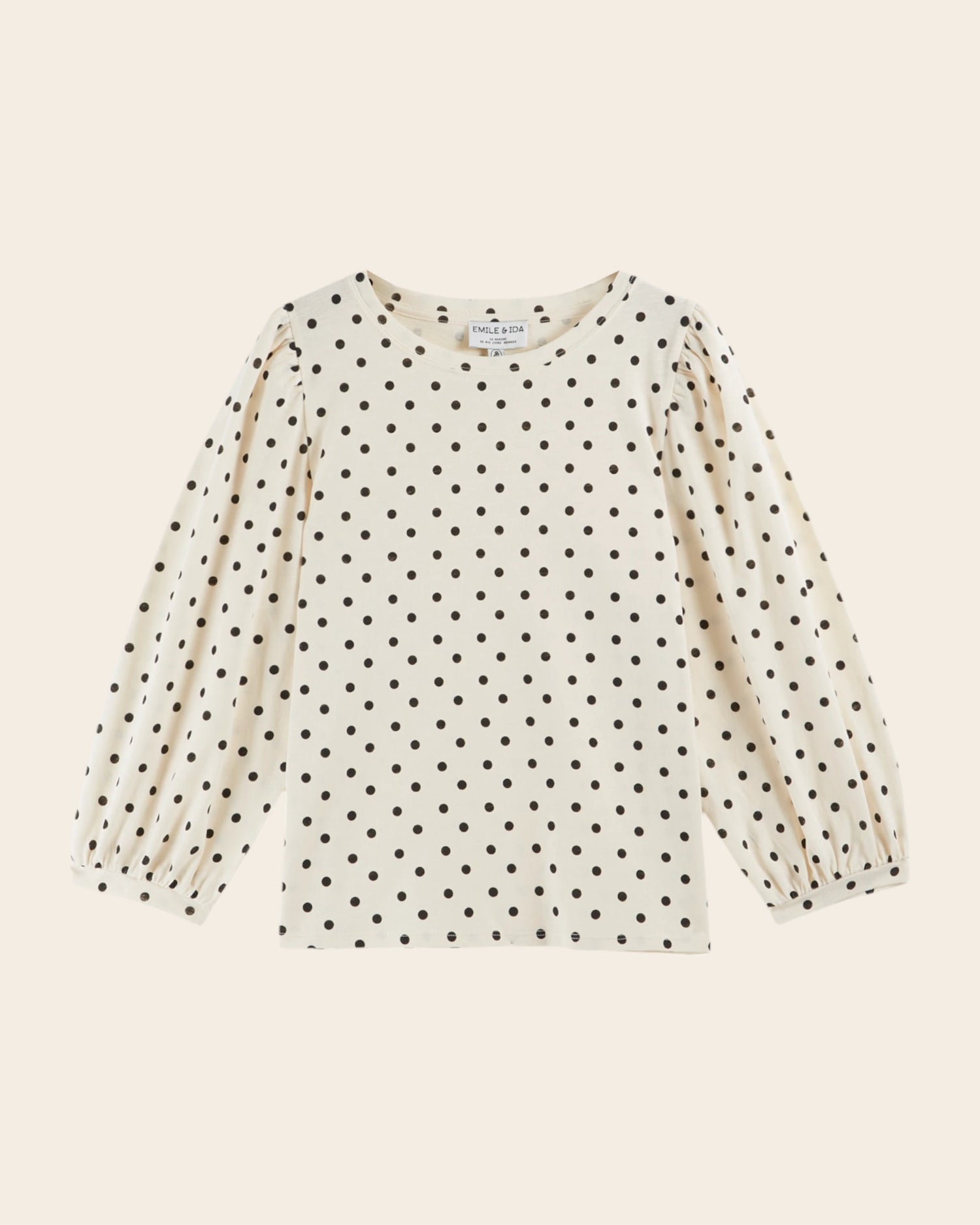 Tee-shirt à manches longues en jersey de coton biologique flammé écru imprimé de pois noirs.