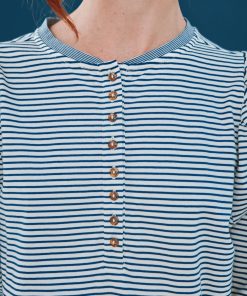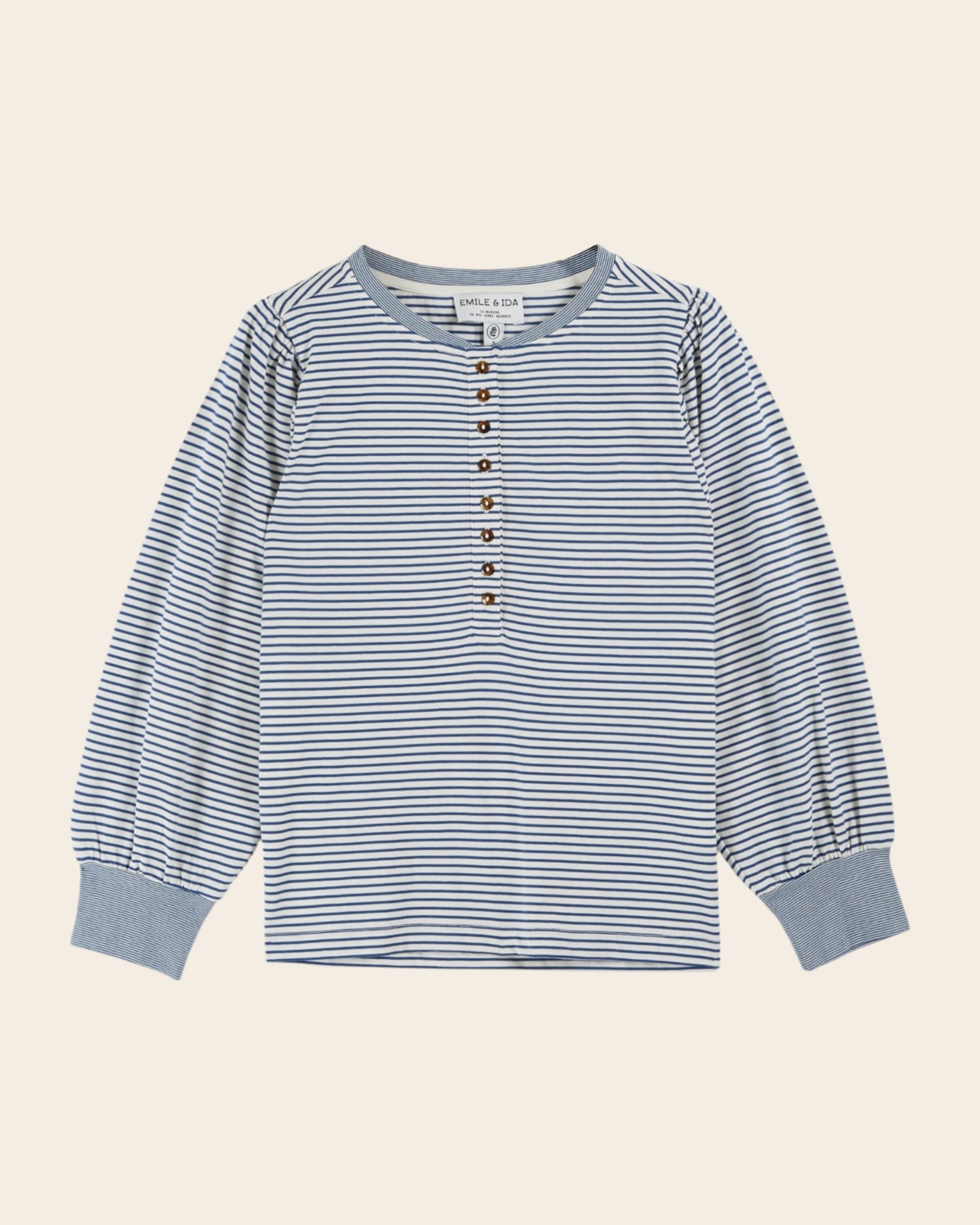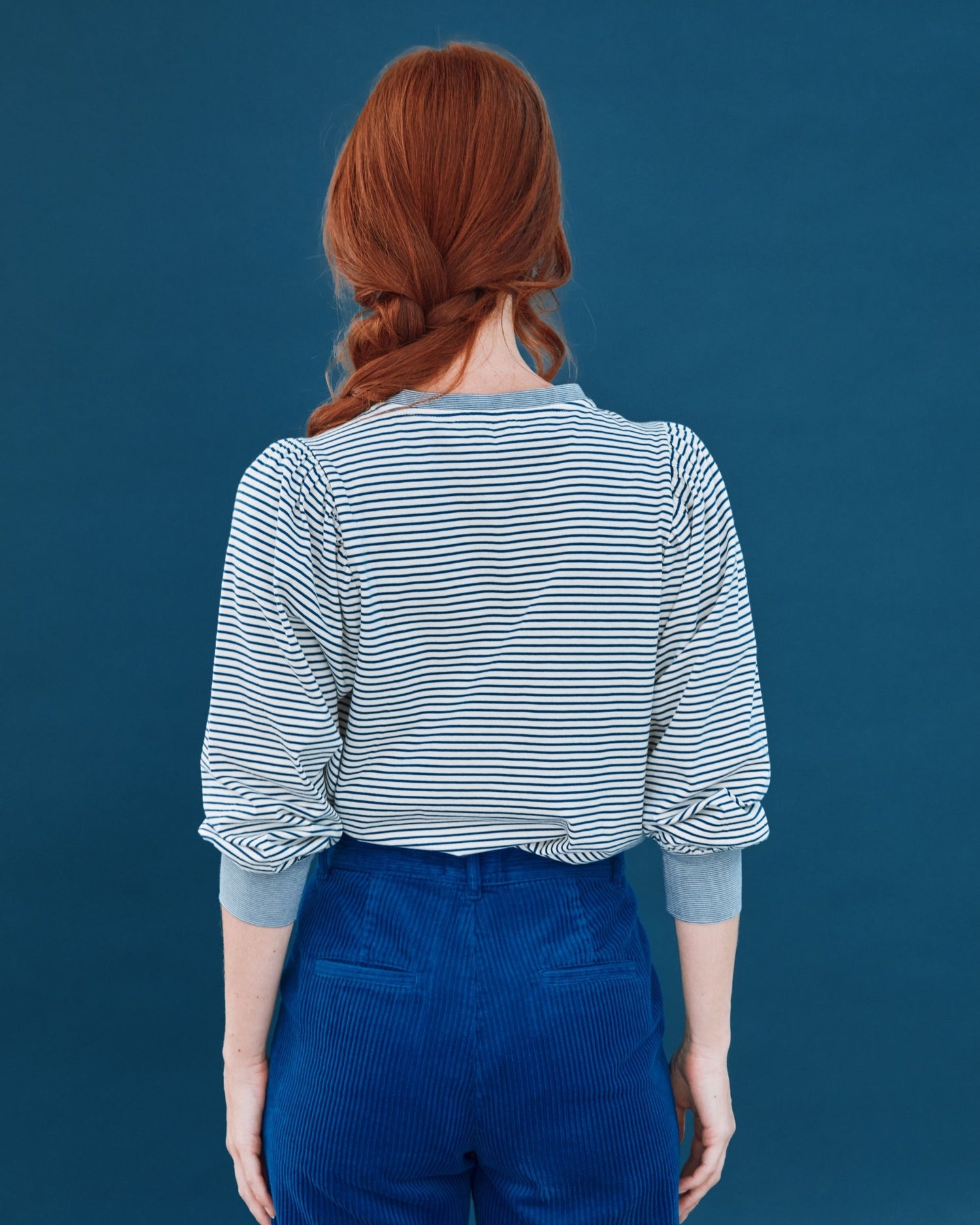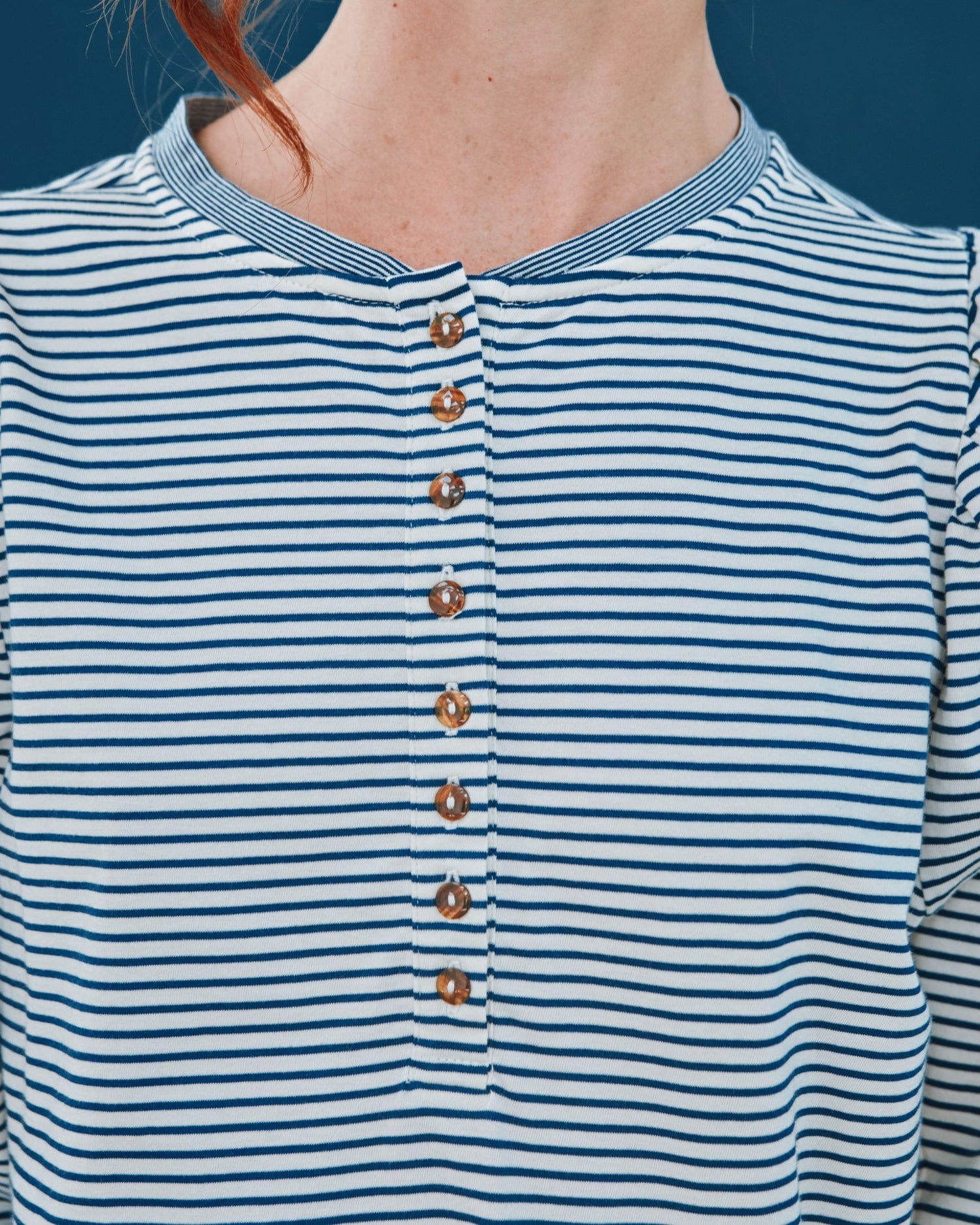 Tee-shirt tunisien en jersey de coton biologique écru rayé de lignes bleues.