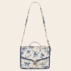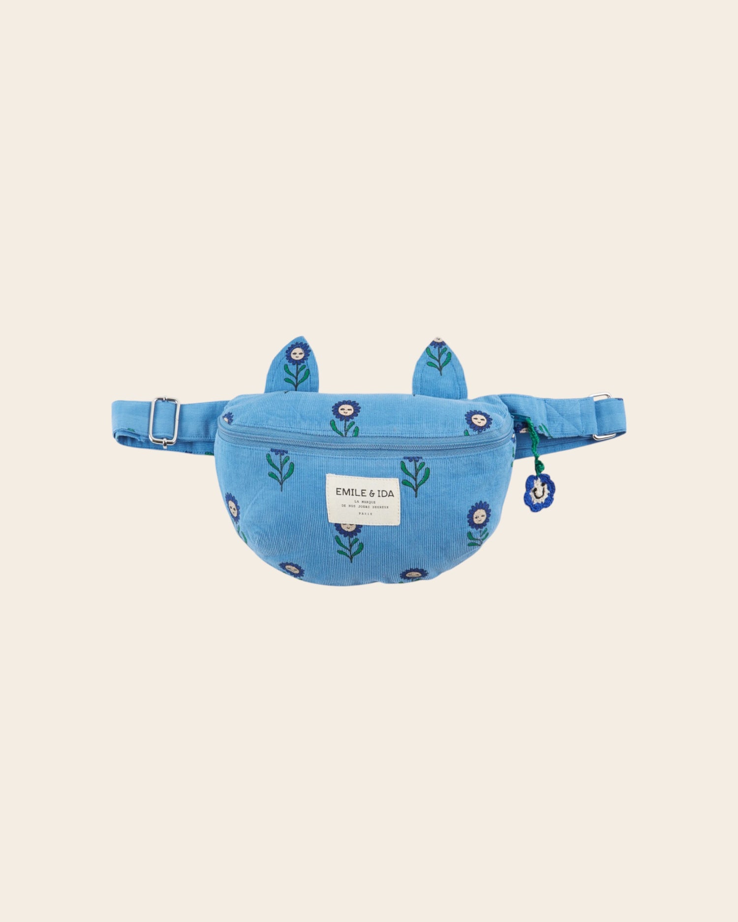 Banane en velours de coton bleu parsemé en all-over de marguerites bleu foncé. Elle est ornée de deux petites oreilles de chat qui écoutent et gardent secrètes les confidences qui lui sont faites.