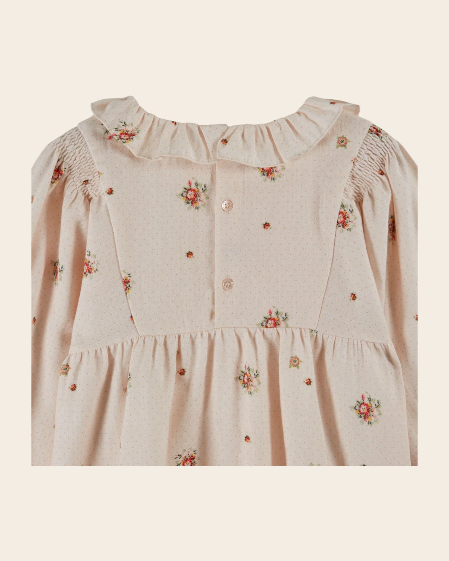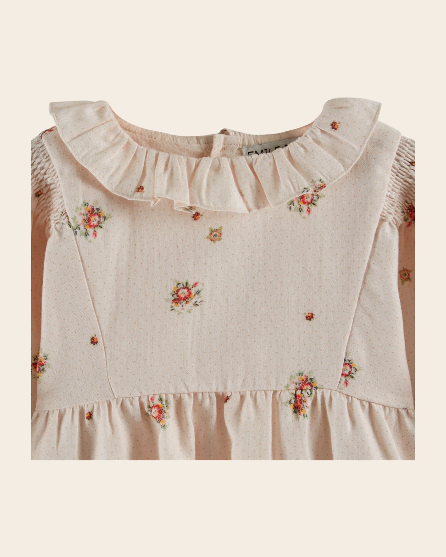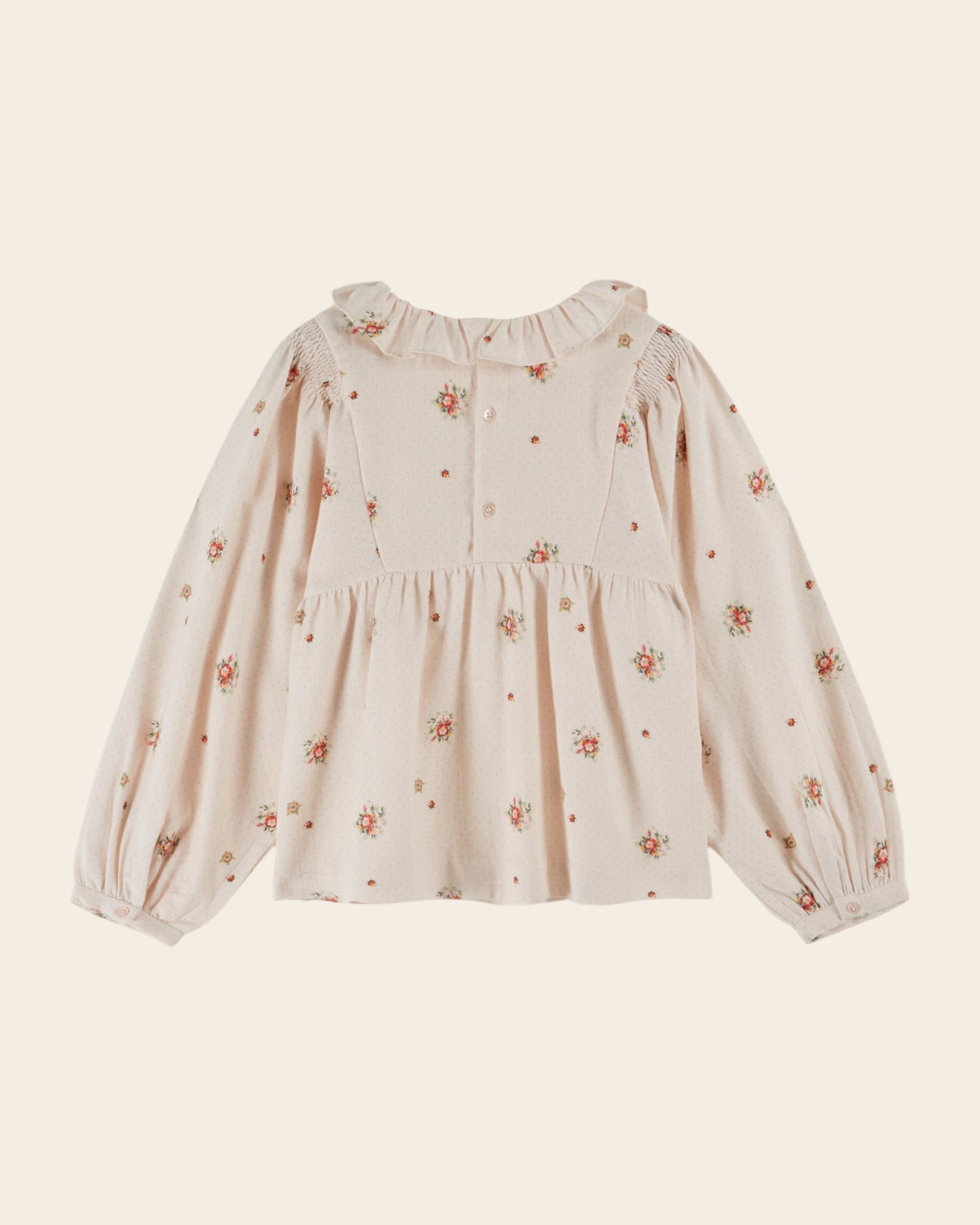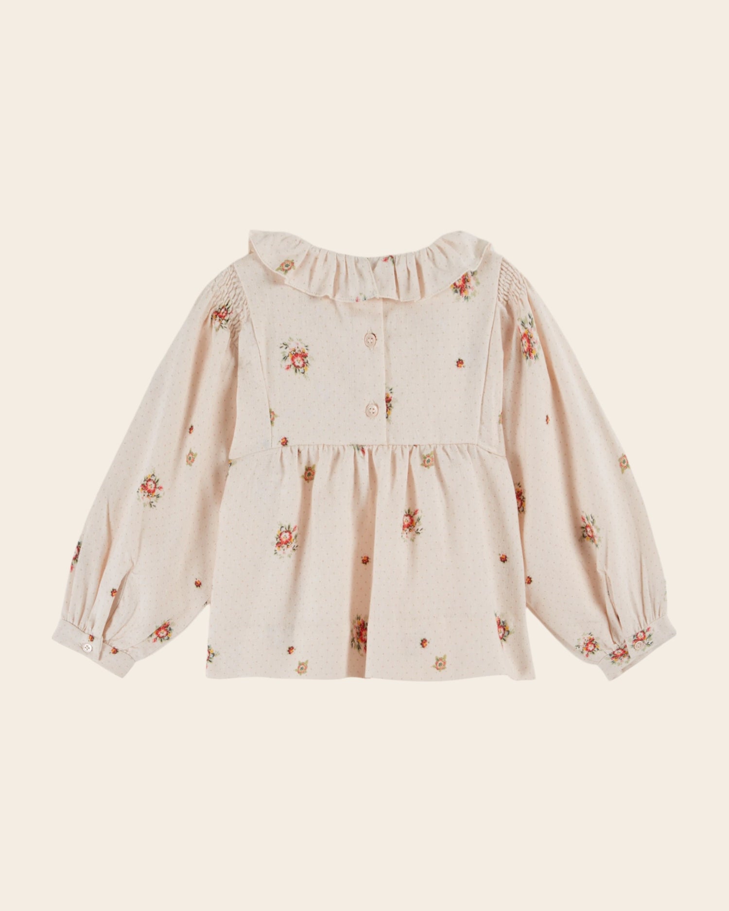 Blouse flanelle de coton toute douce, imprimée de grains de bouquets de fleurettes multicolores sur un fond rose très pâle.