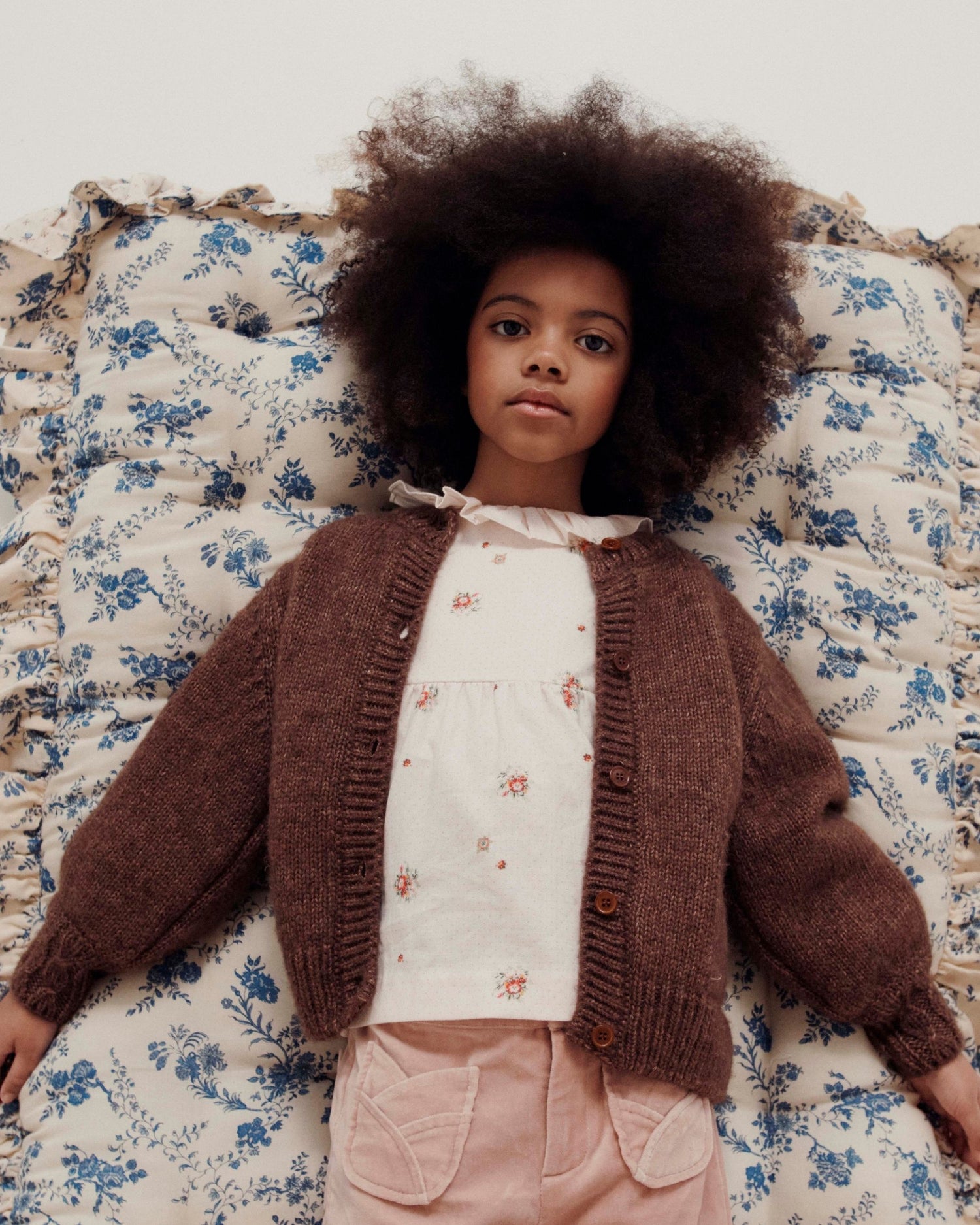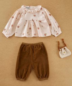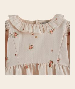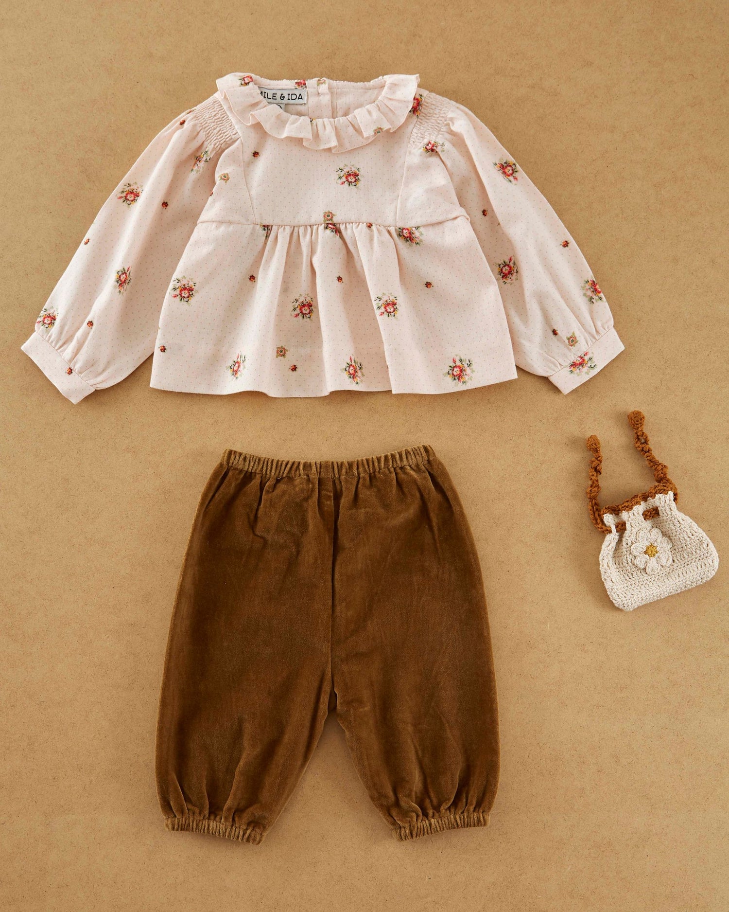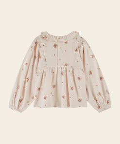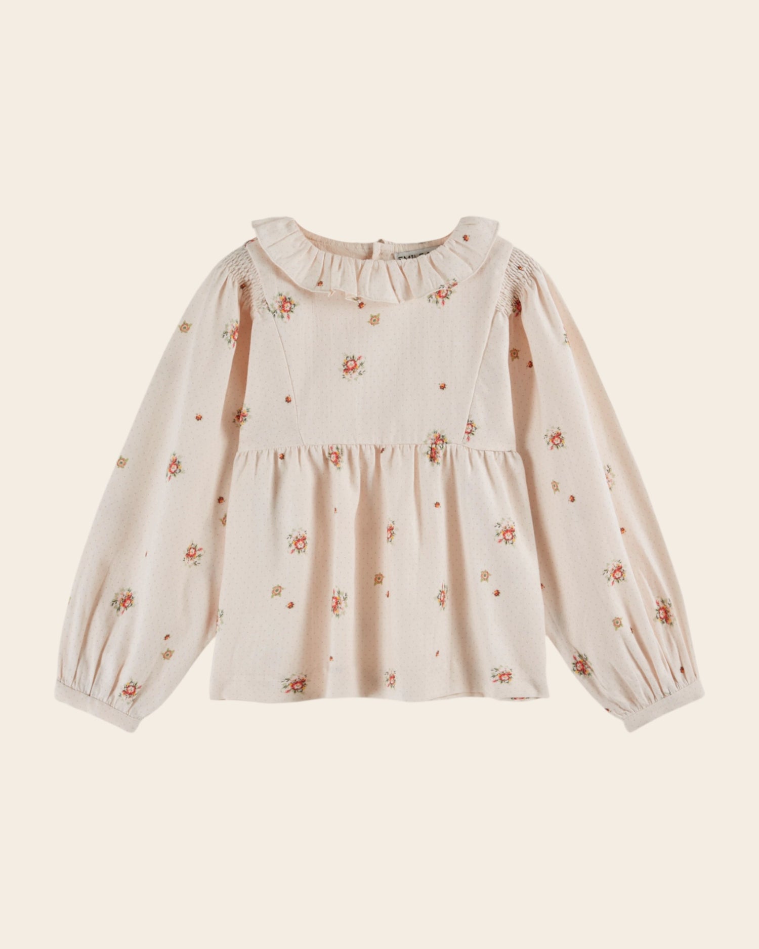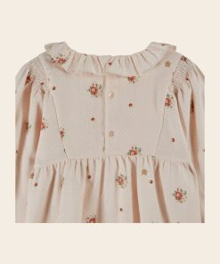 Blouse flanelle de coton toute douce, imprimée de grains de bouquets de fleurettes multicolores sur un fond rose très pâle.