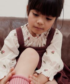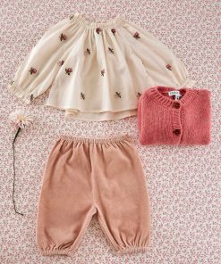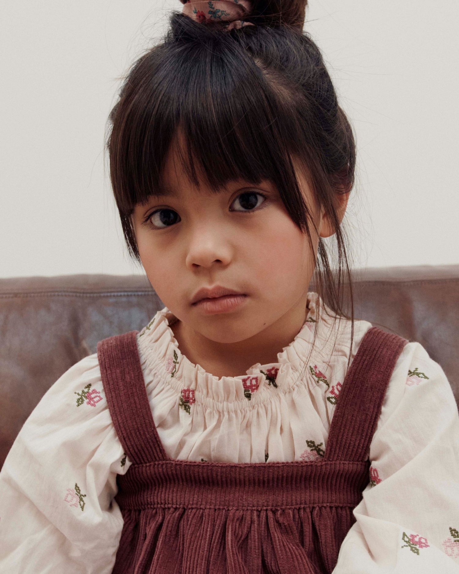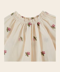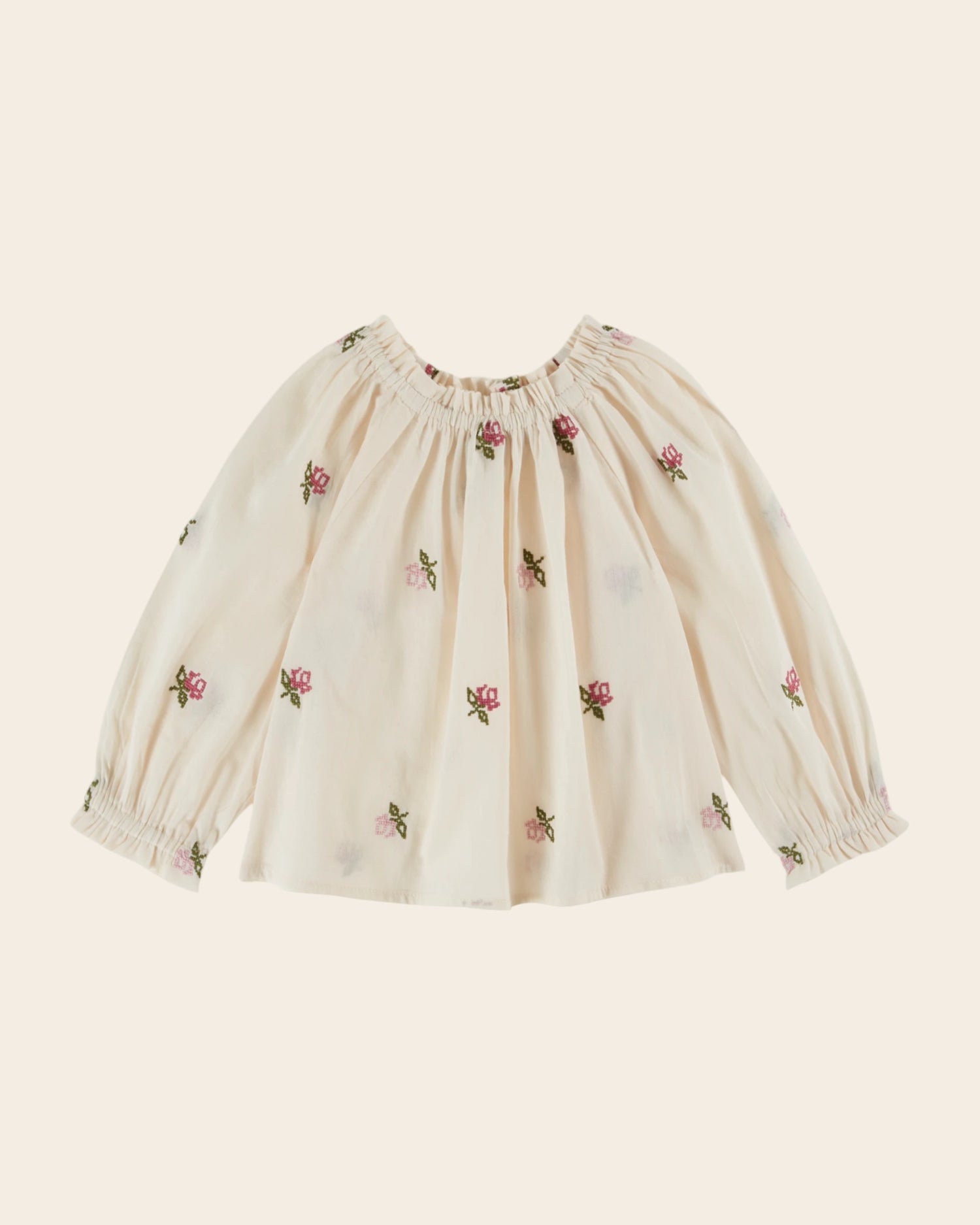 Blouse en coton écru parsemé de fleurs roses et vertes brodées au point de croix.