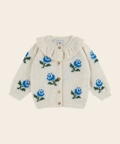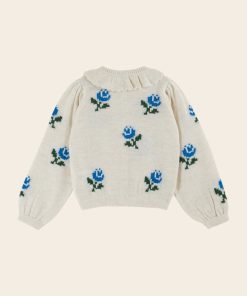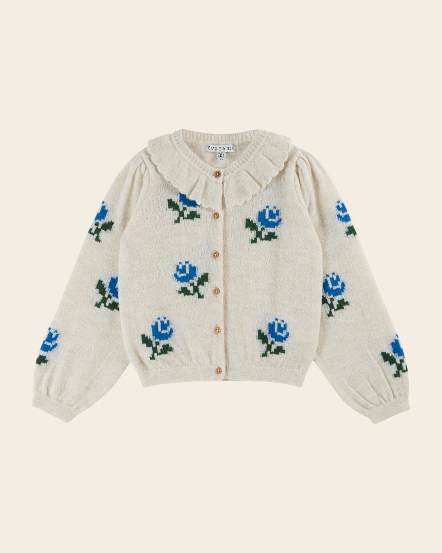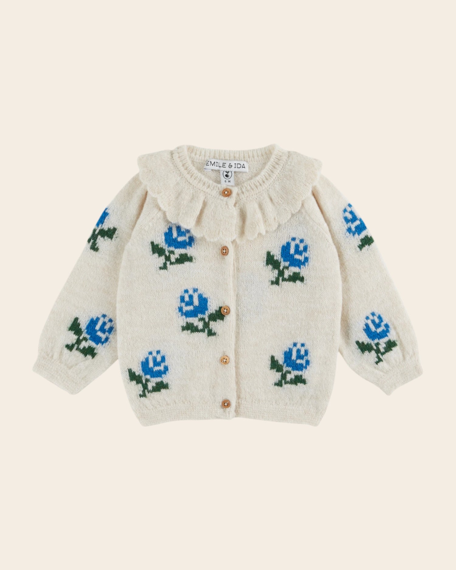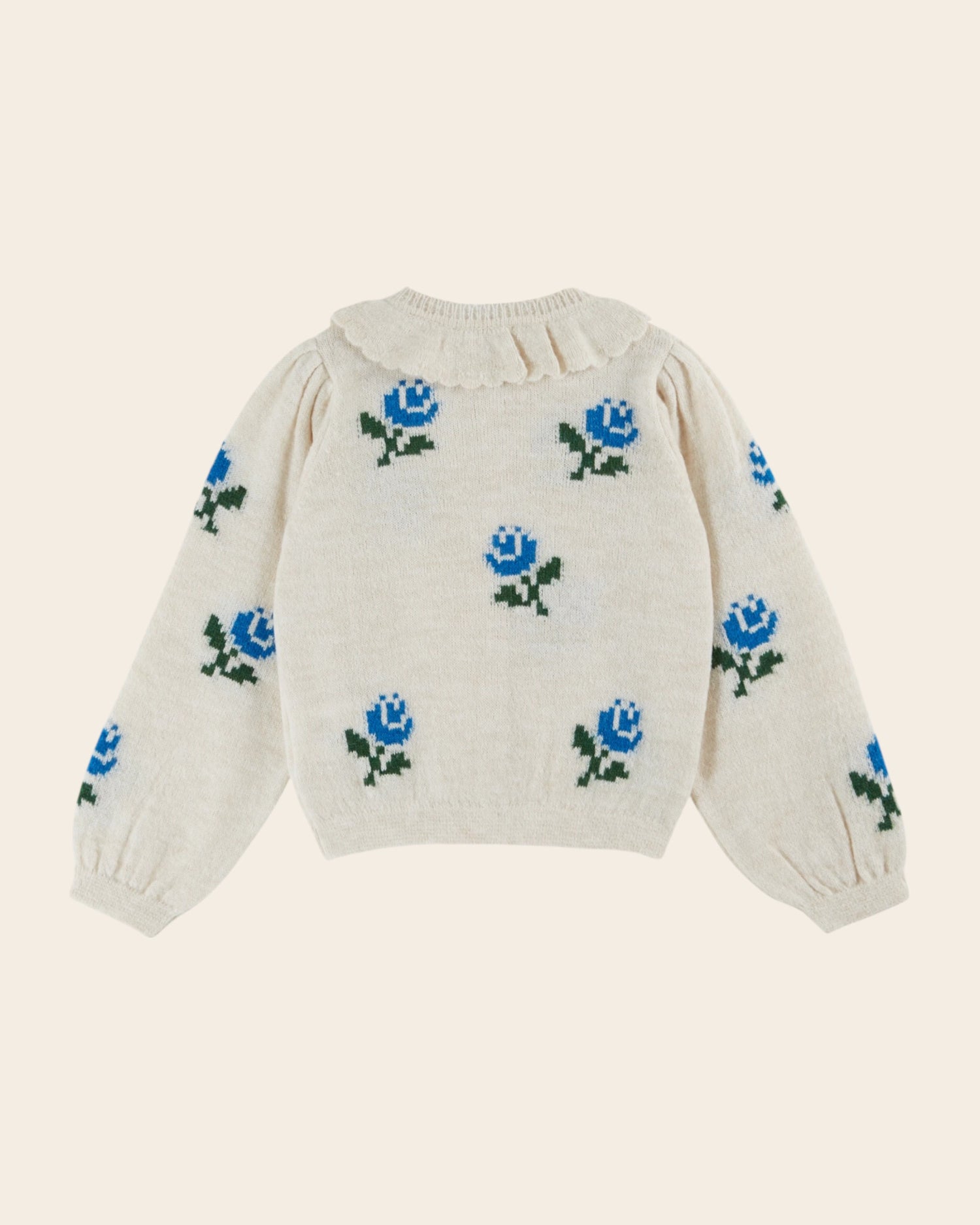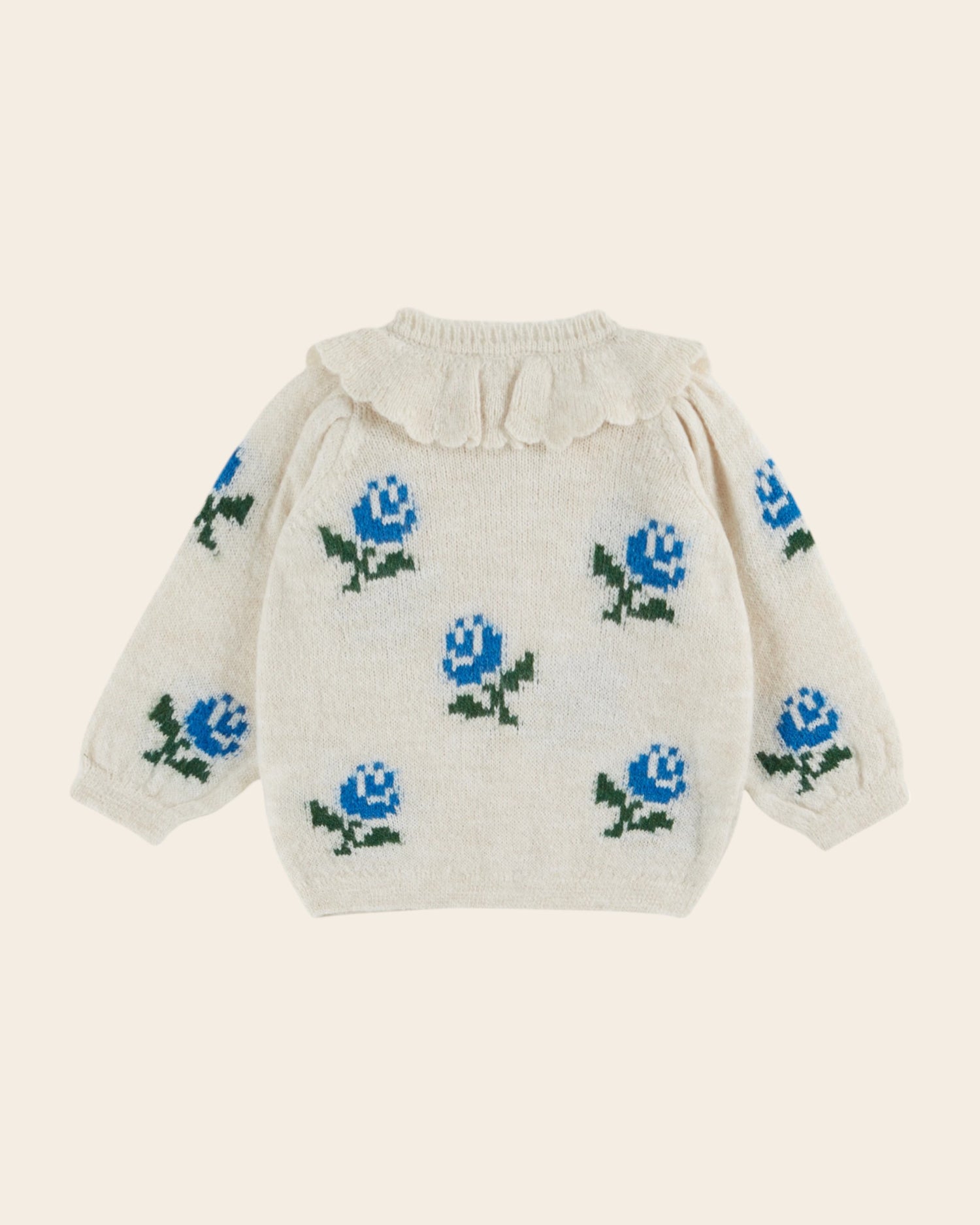 Cardigan en laine mohair écru parsemé de grosses roses bleues.