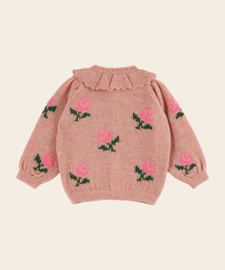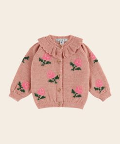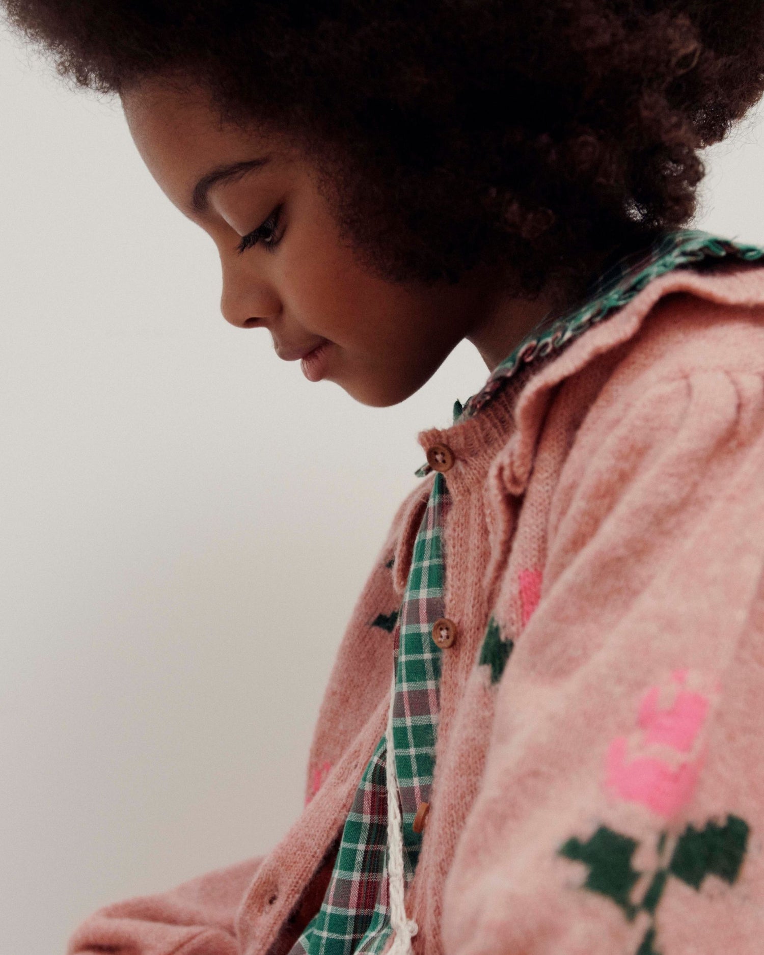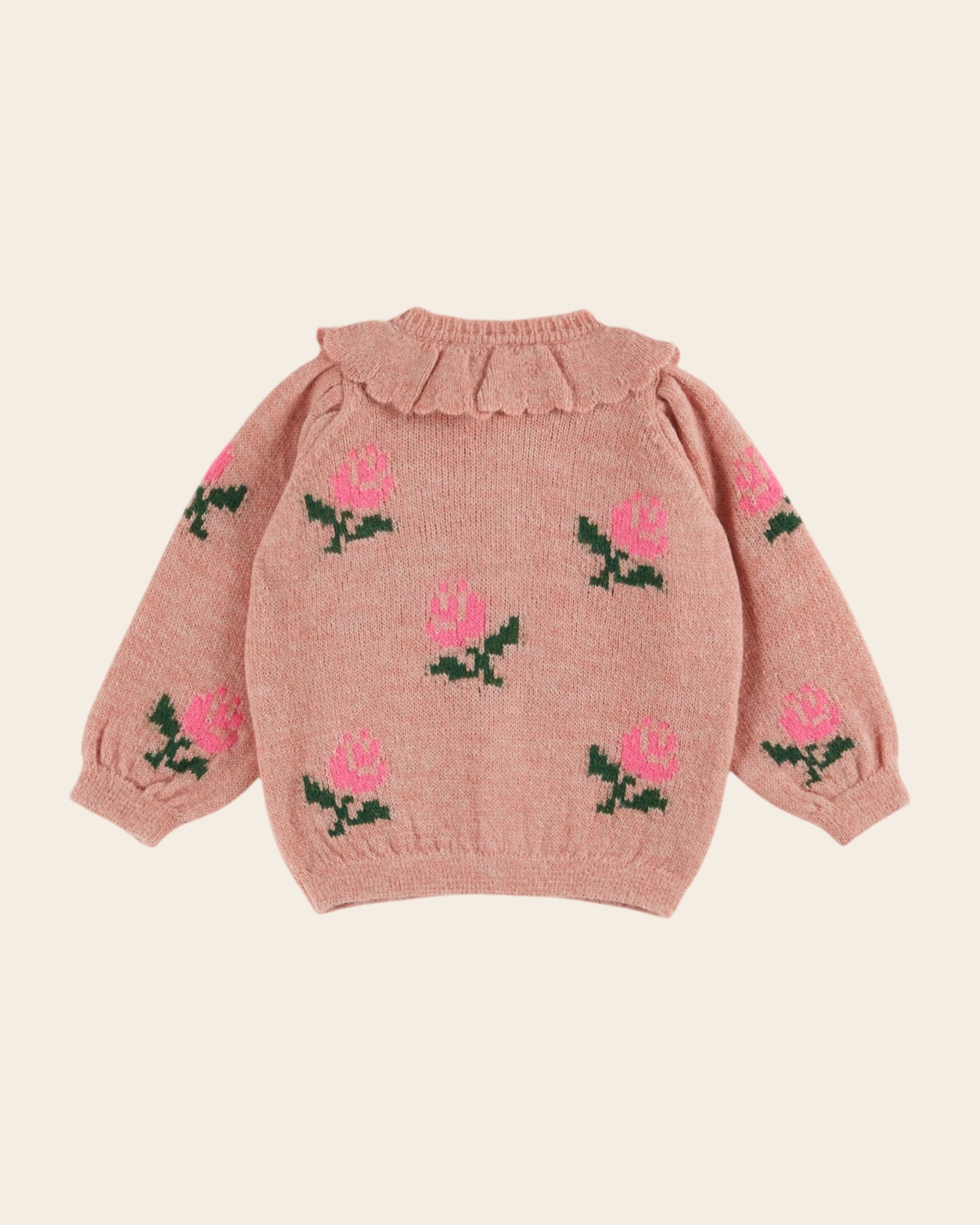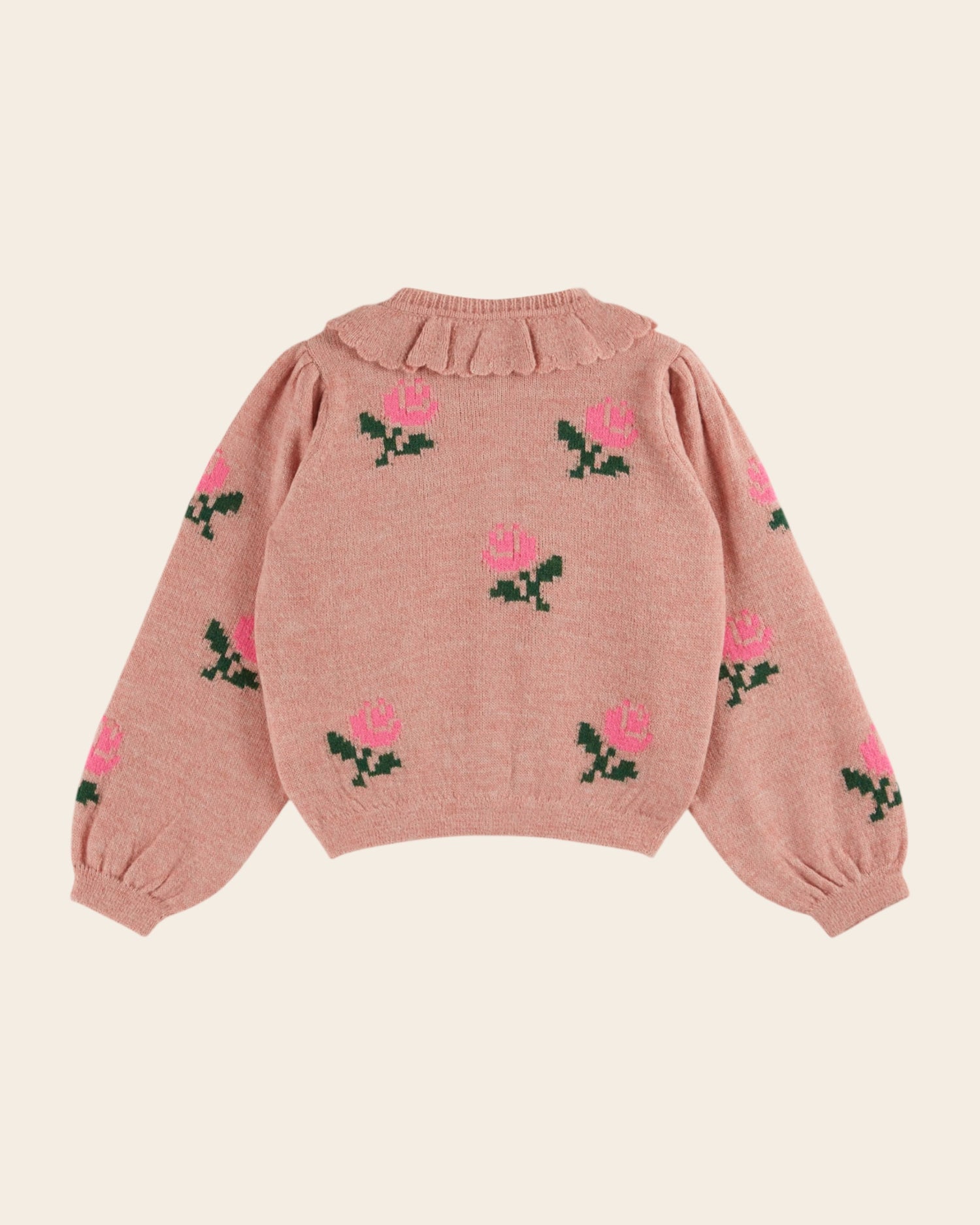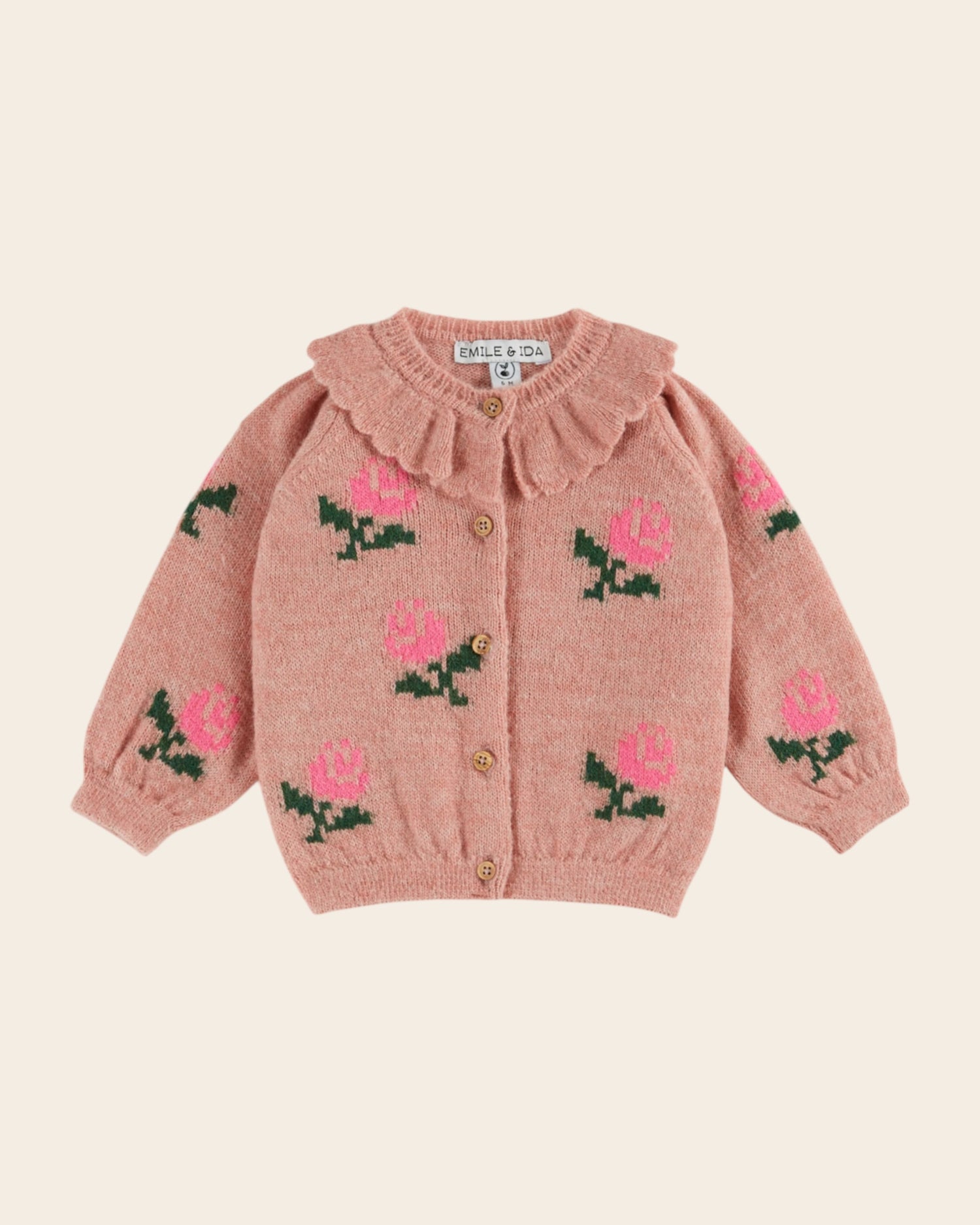 Cardigan en laine mohair rose parsemé de grosses roses rose fluo.