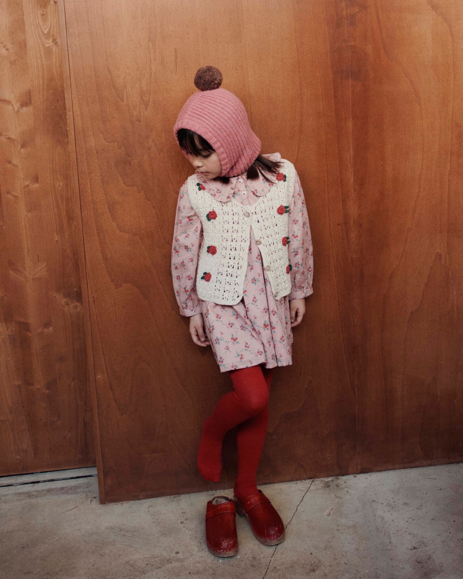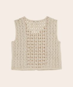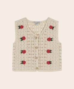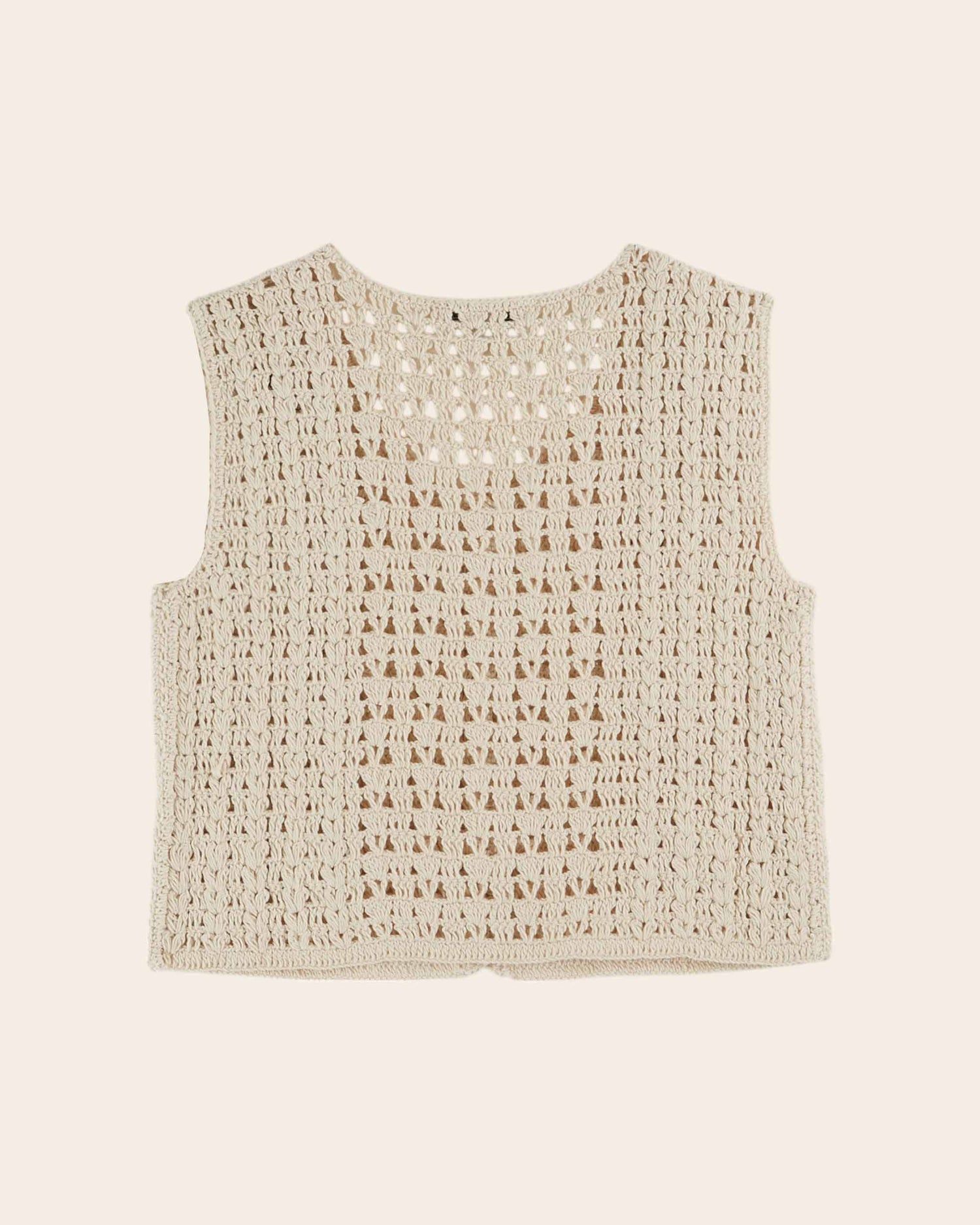 Gilet sans manches crocheté en coton écru. Un joli travail en mailles fantaisie rehaussé de fleurs rouges crochetées à la main par des artisans.