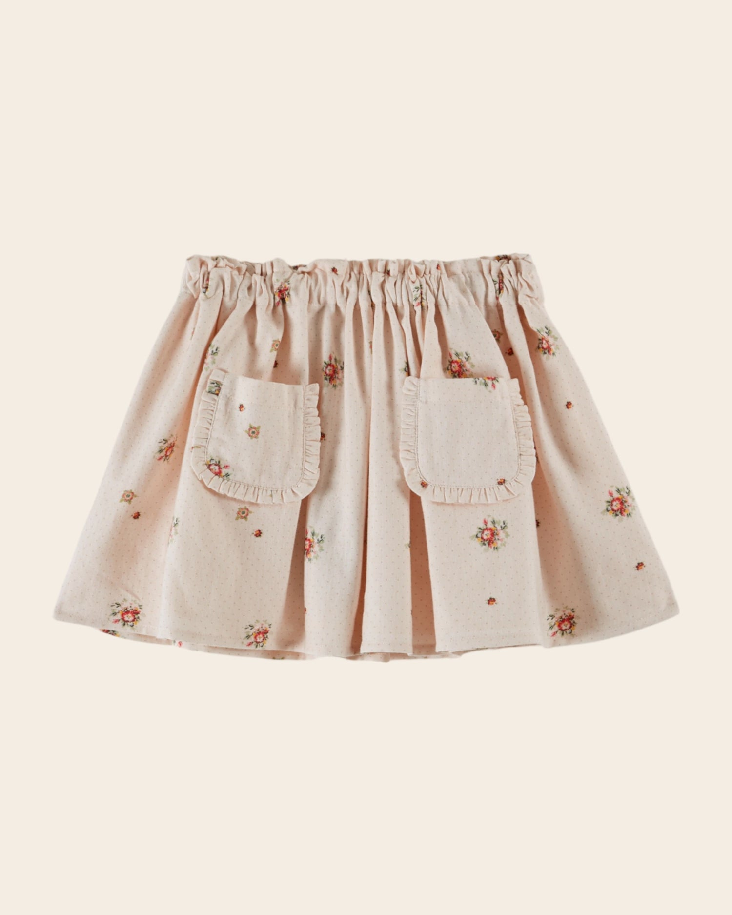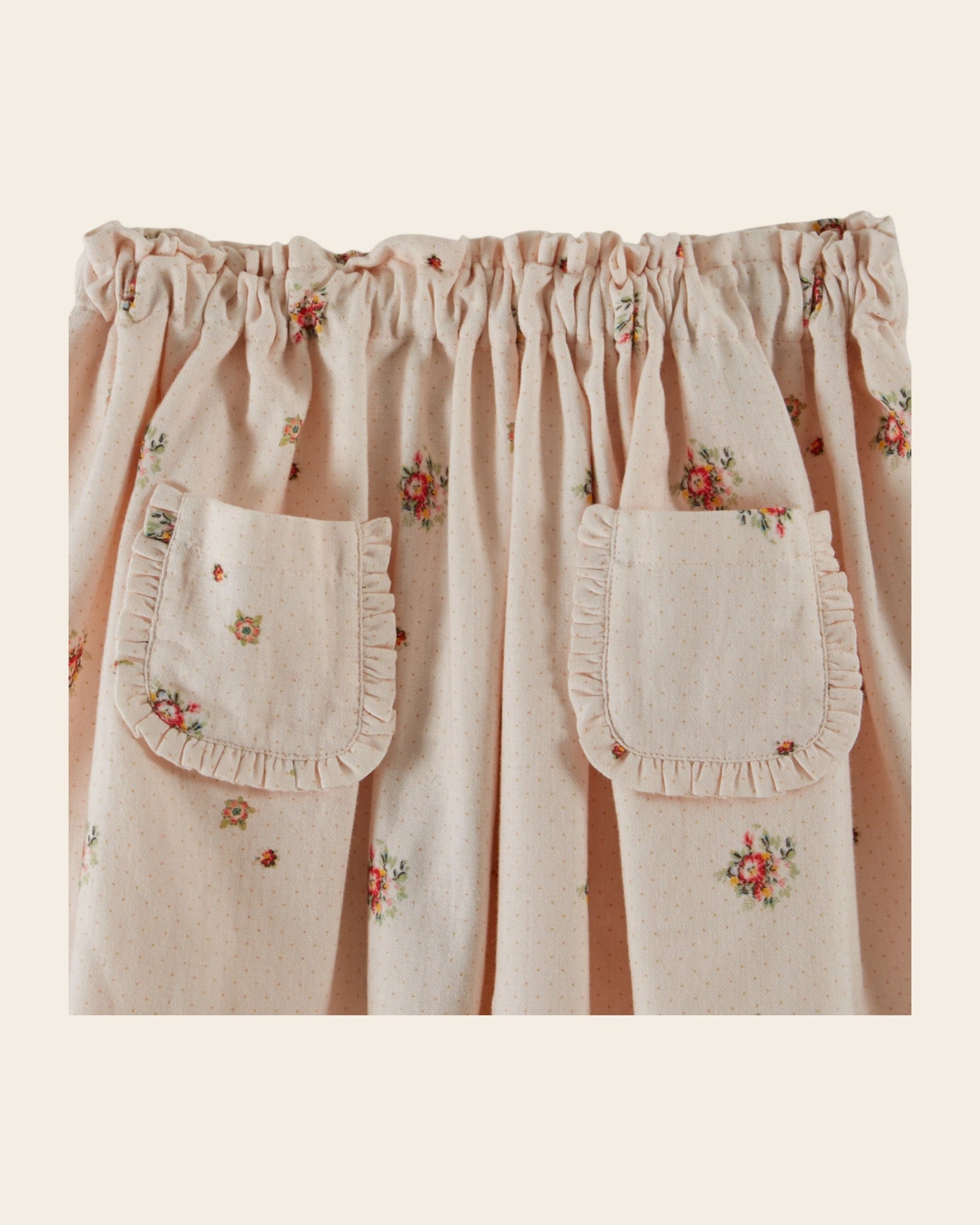 Jupe en flanelle de coton toute douce, imprimée de bouquets de fleurettes multicolores sur un fond rose très pâle.