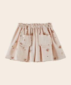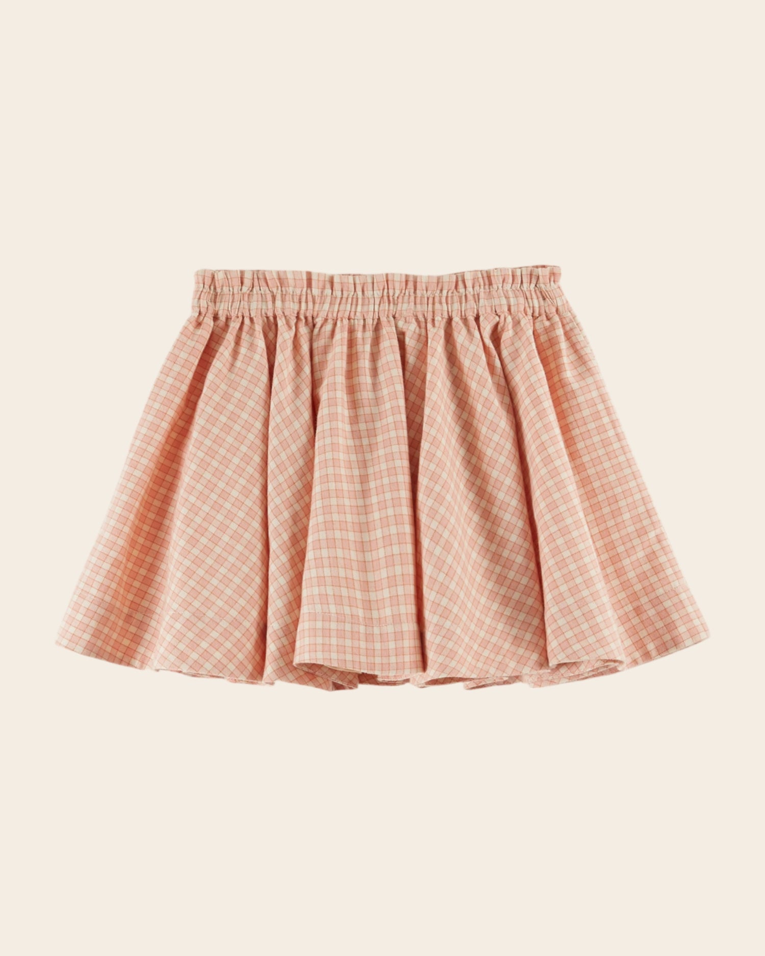 Jupe froncée à carreaux roses et blancs cernés de fines lignes orange.