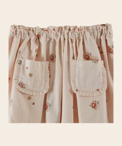 Jupe froncée à carreaux roses et blancs cernés de fines lignes orange.
