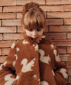 Veste moumoute en fourrure synthétique caramel imprimées d’écureuils écrus.
