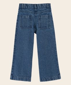 Pantalon en coton denim bleu brodé sur les jambes des slogans des années 70 : Peace and Love, sigle de la paix, smiley souriant…