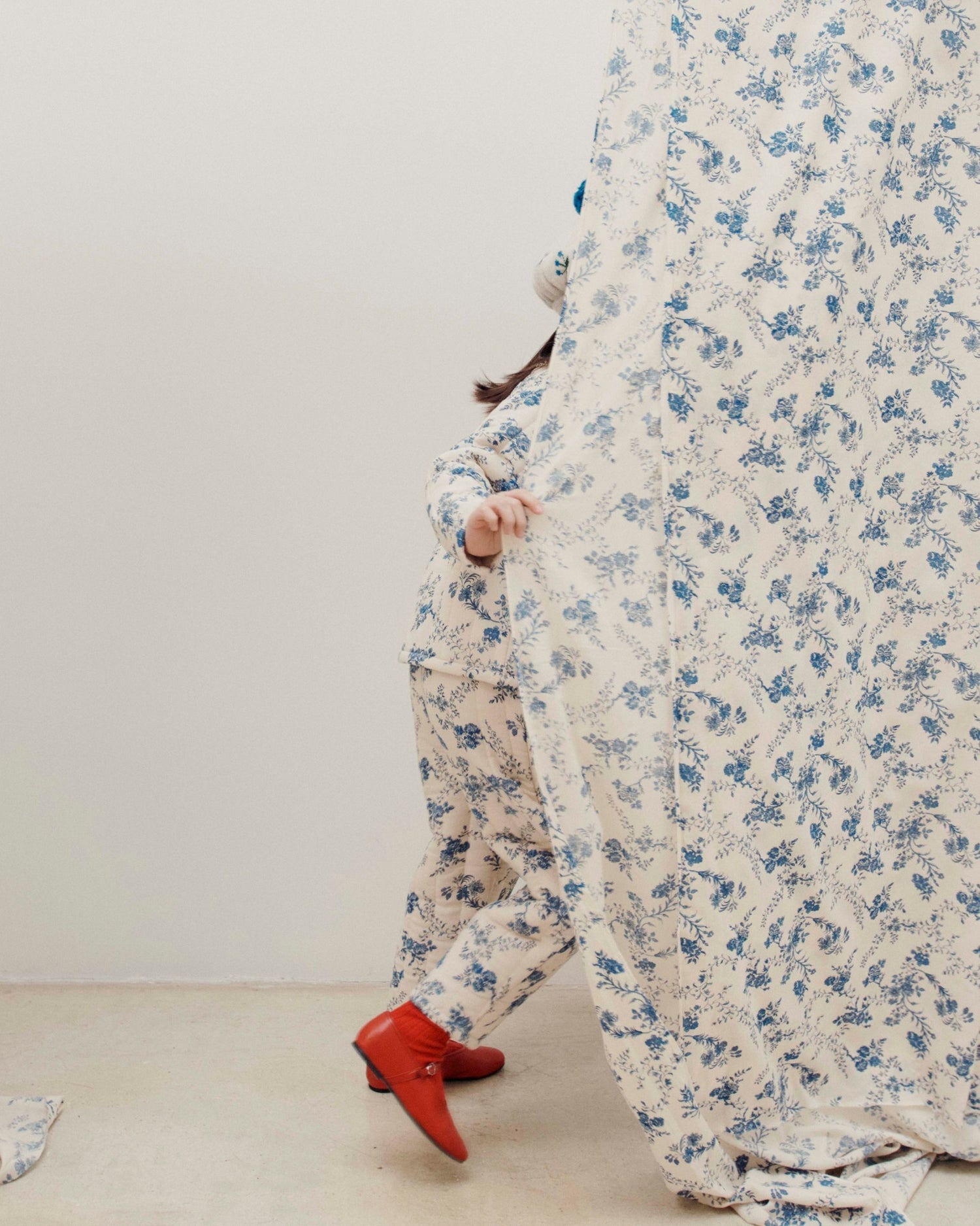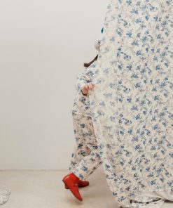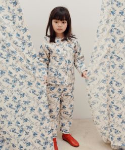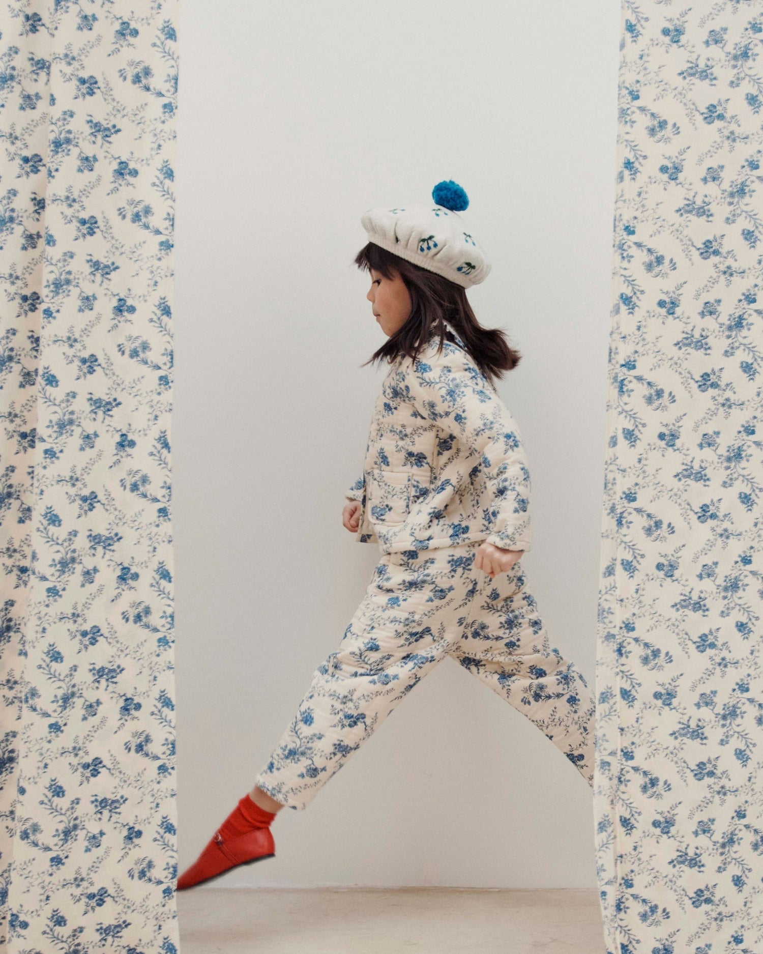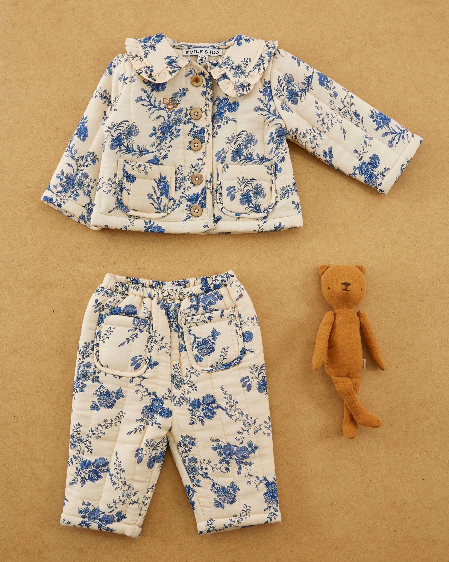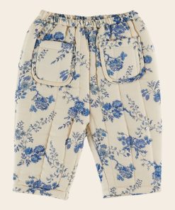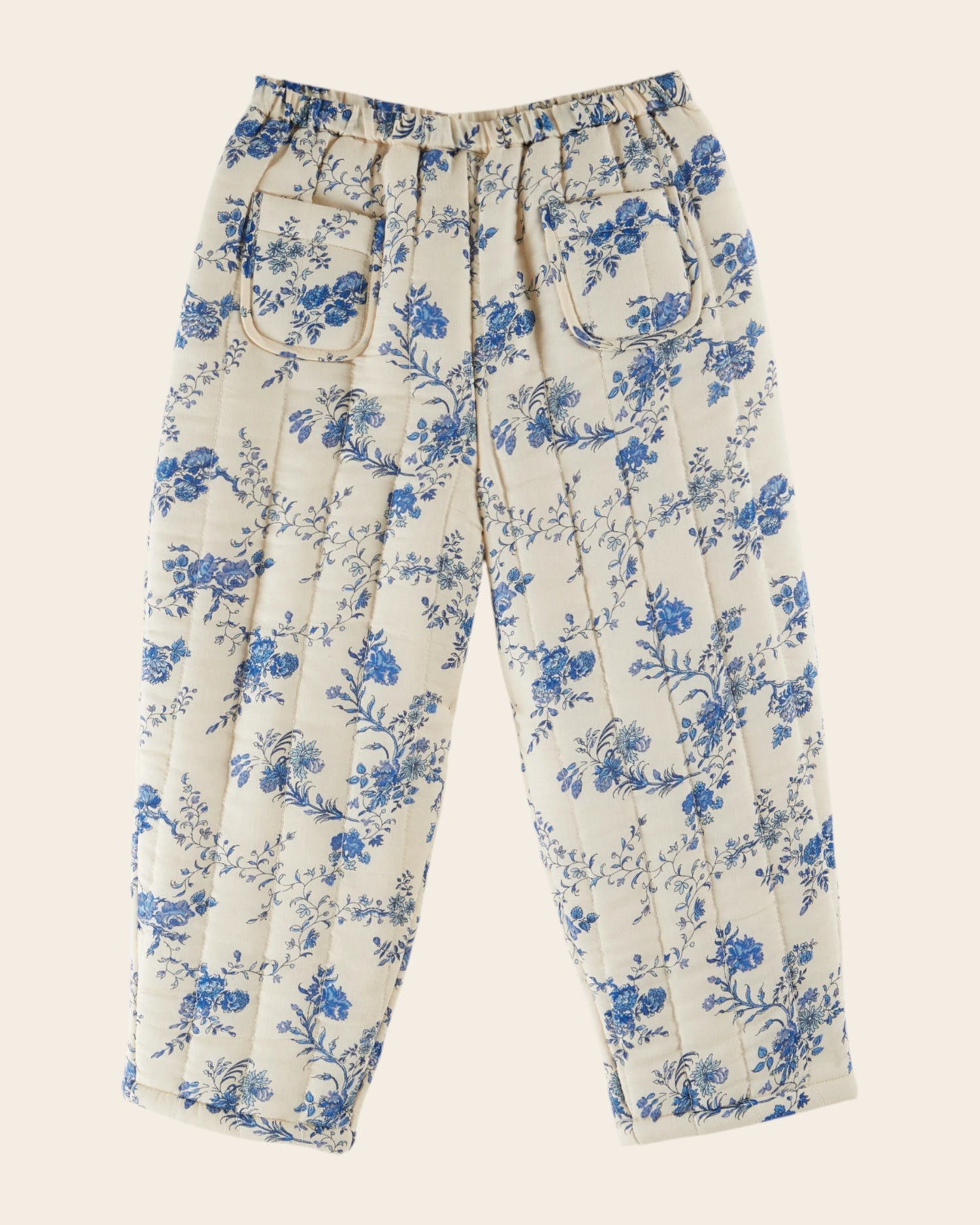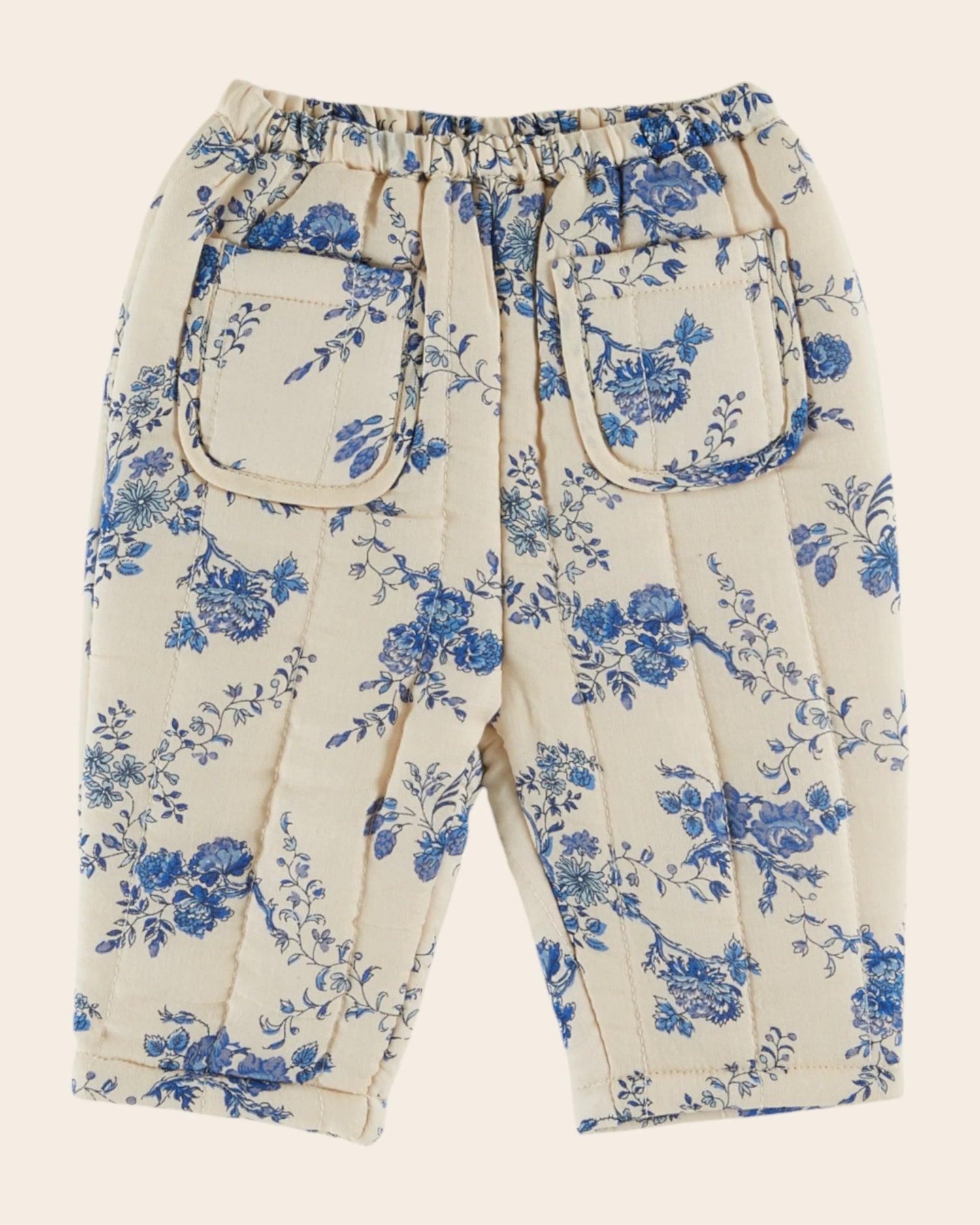 Pantalon matelassé en coton écru orné de fleurs bleues sur fond écru.