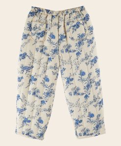 Pantalon matelassé en coton écru orné de fleurs bleues sur fond écru.