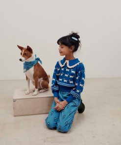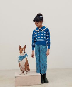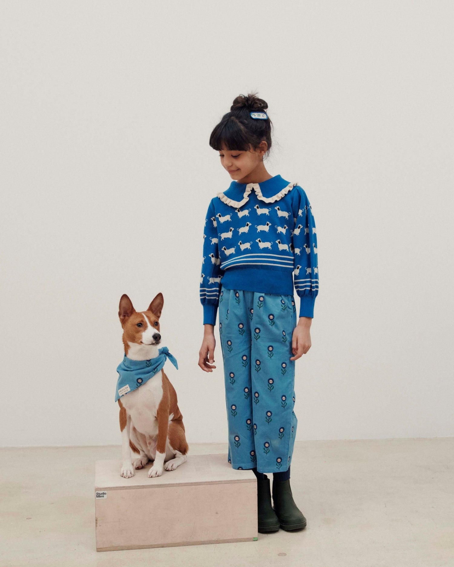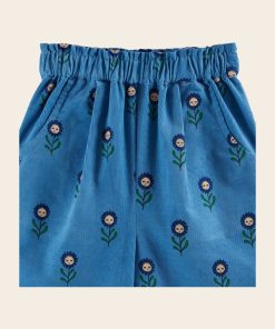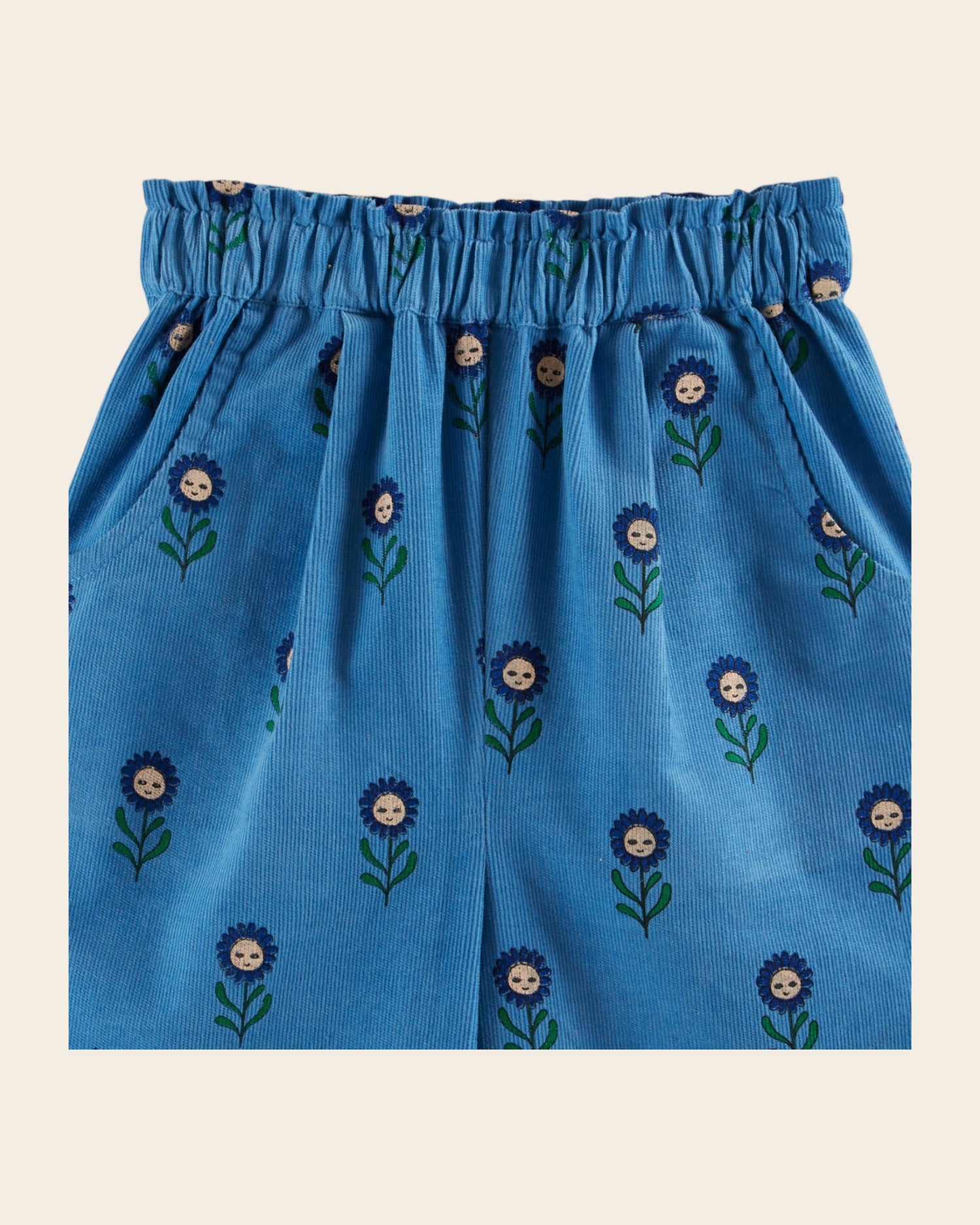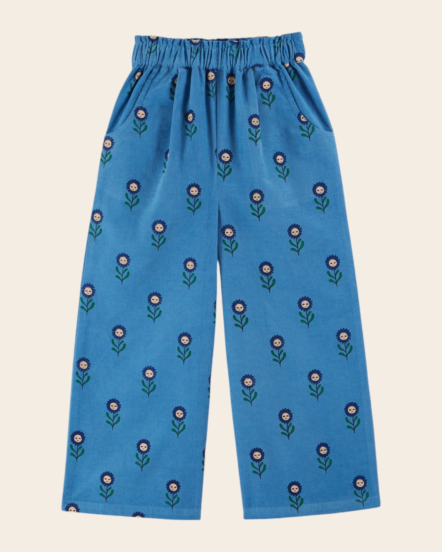Pantalon à pinces en velours de coton bleu parsemé en all-over de marguerites bleu foncé.