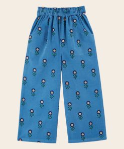 Pantalon à pinces en velours de coton bleu parsemé en all-over de marguerites bleu foncé.