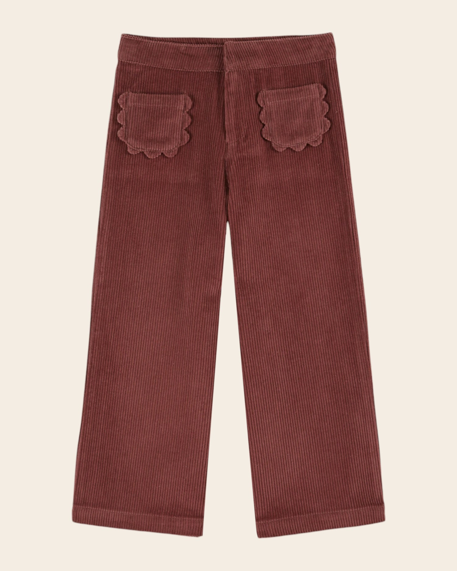 Pantalon en velours de coton à grosses côtes violine.
