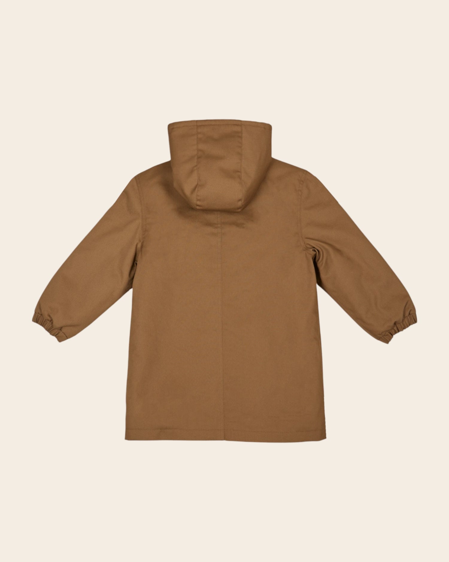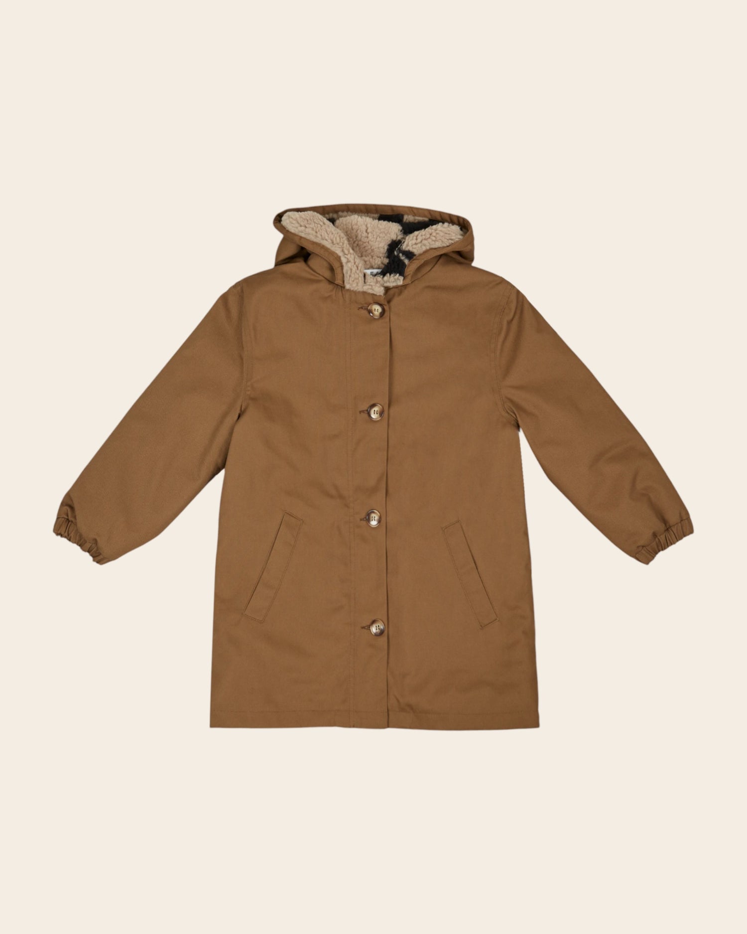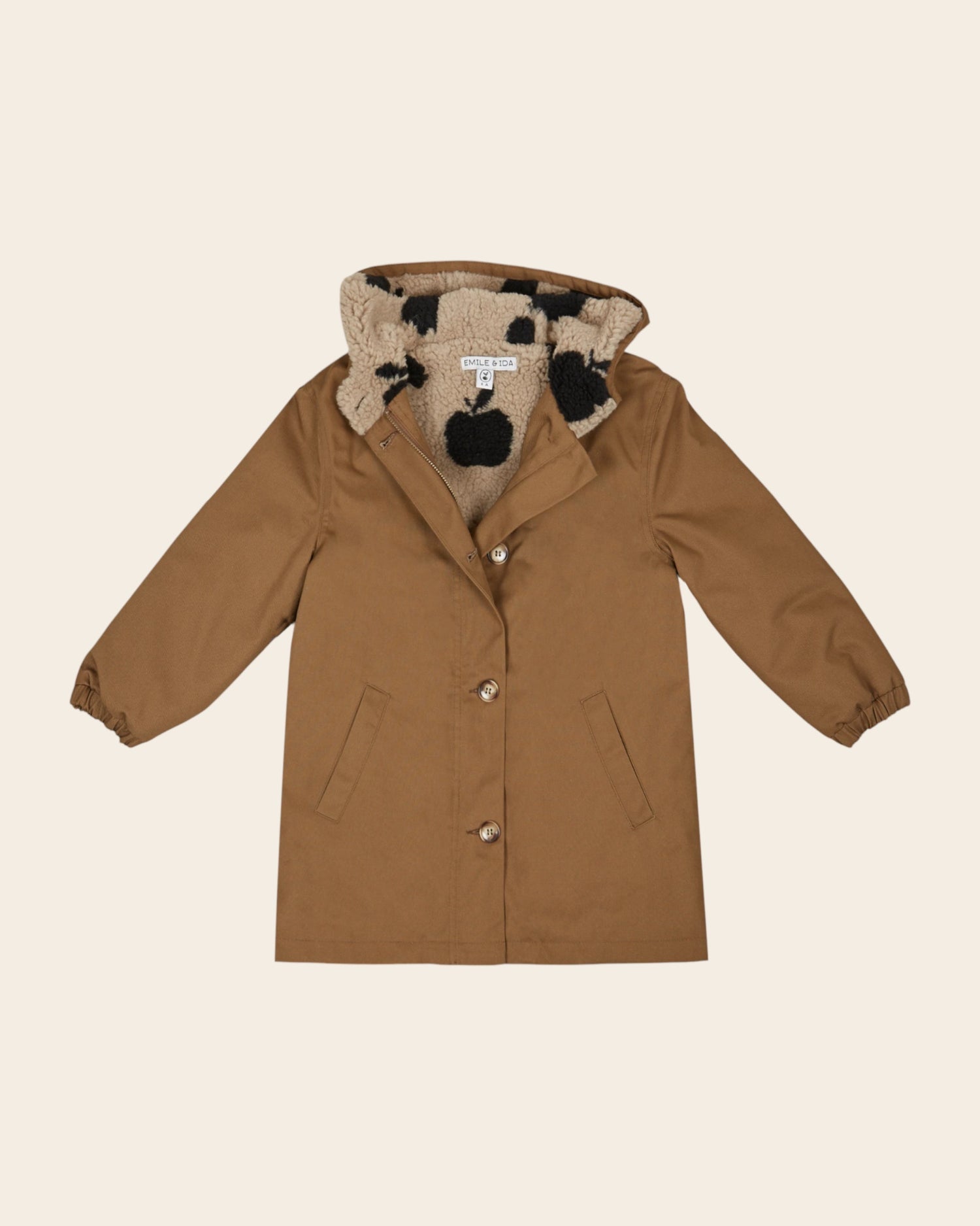Parka à capuche en toile de coton taupe doublée de moumoute grège imprimée de grosses pommes noires.