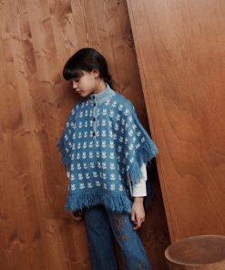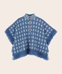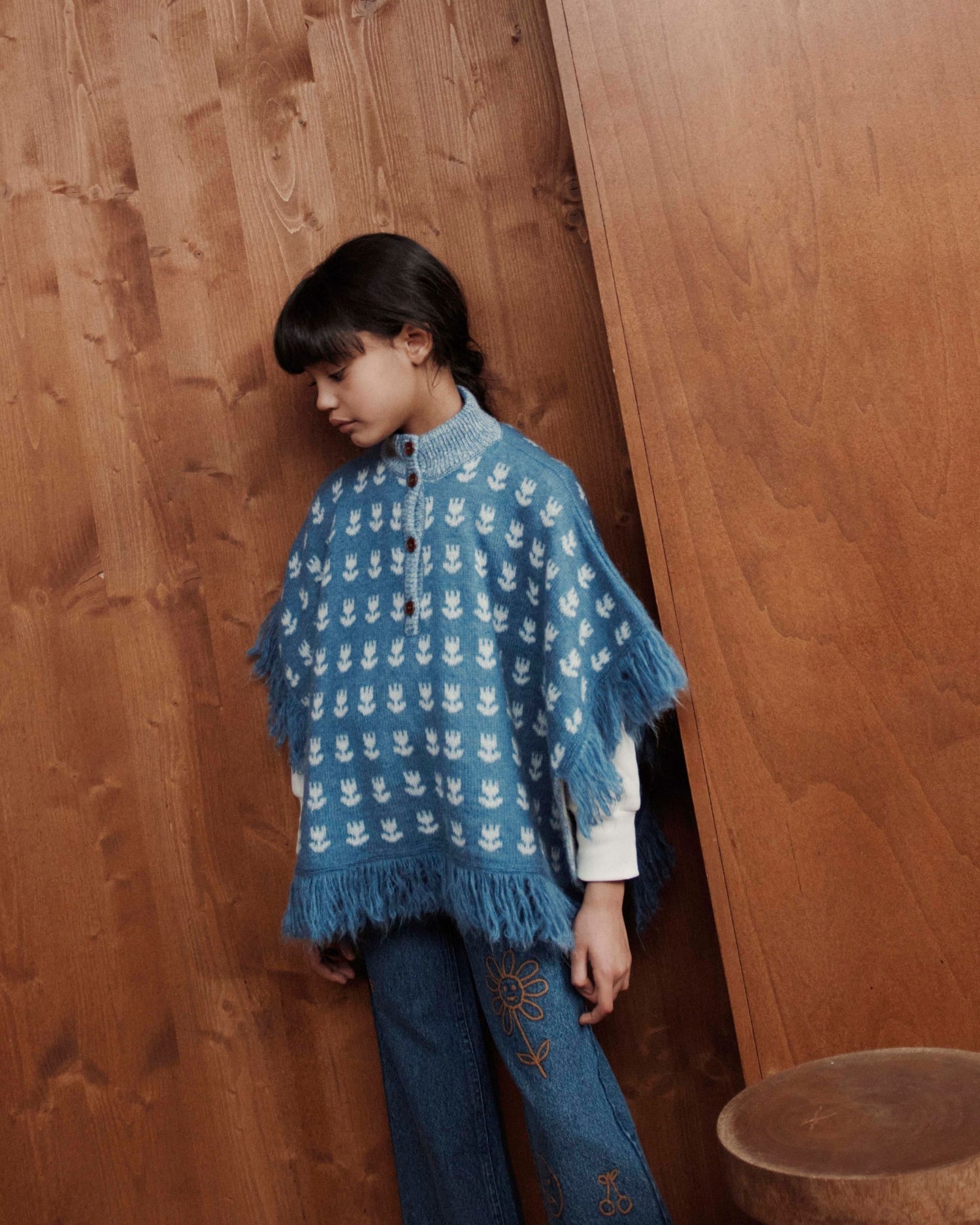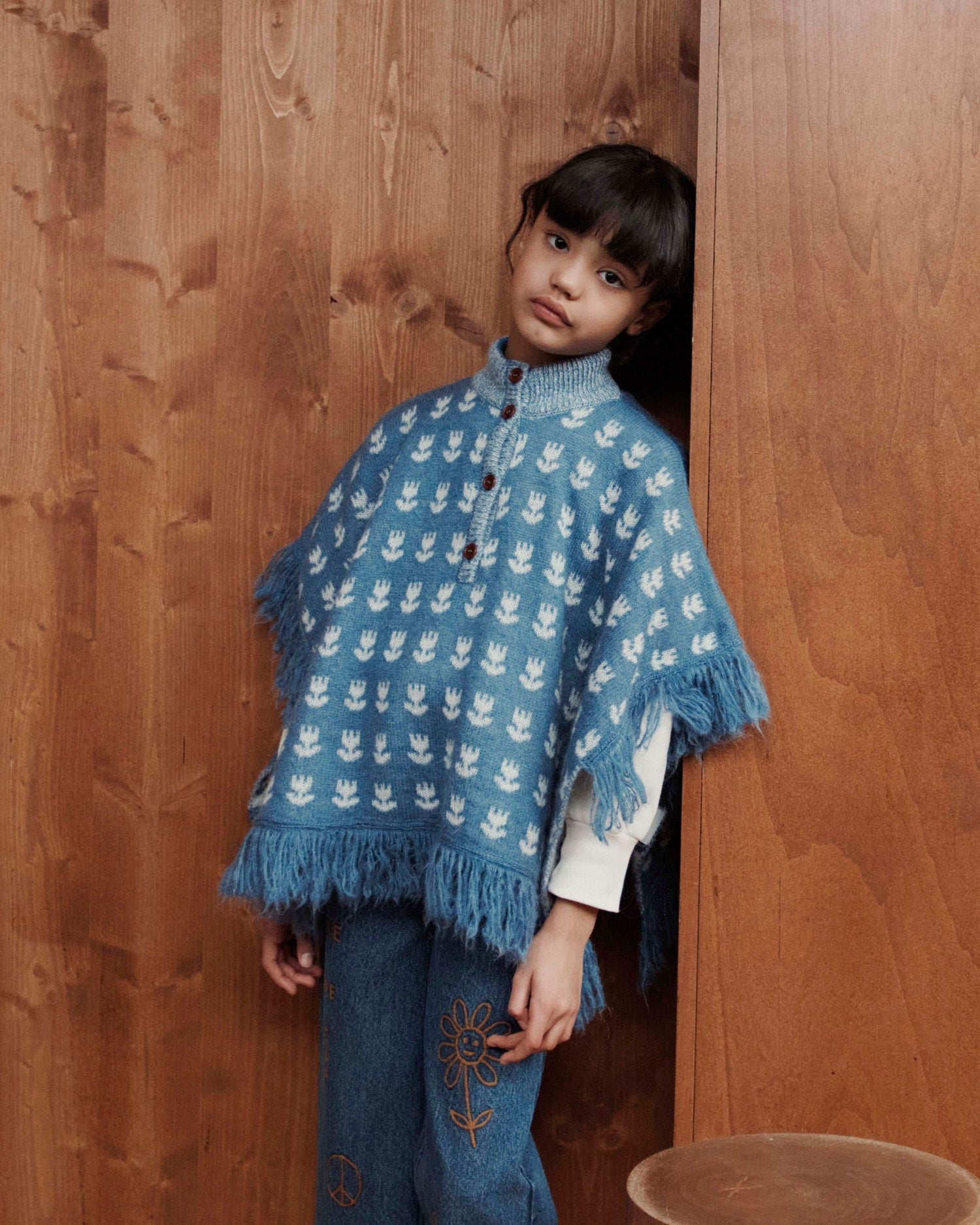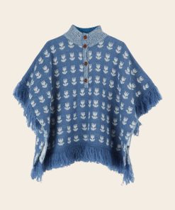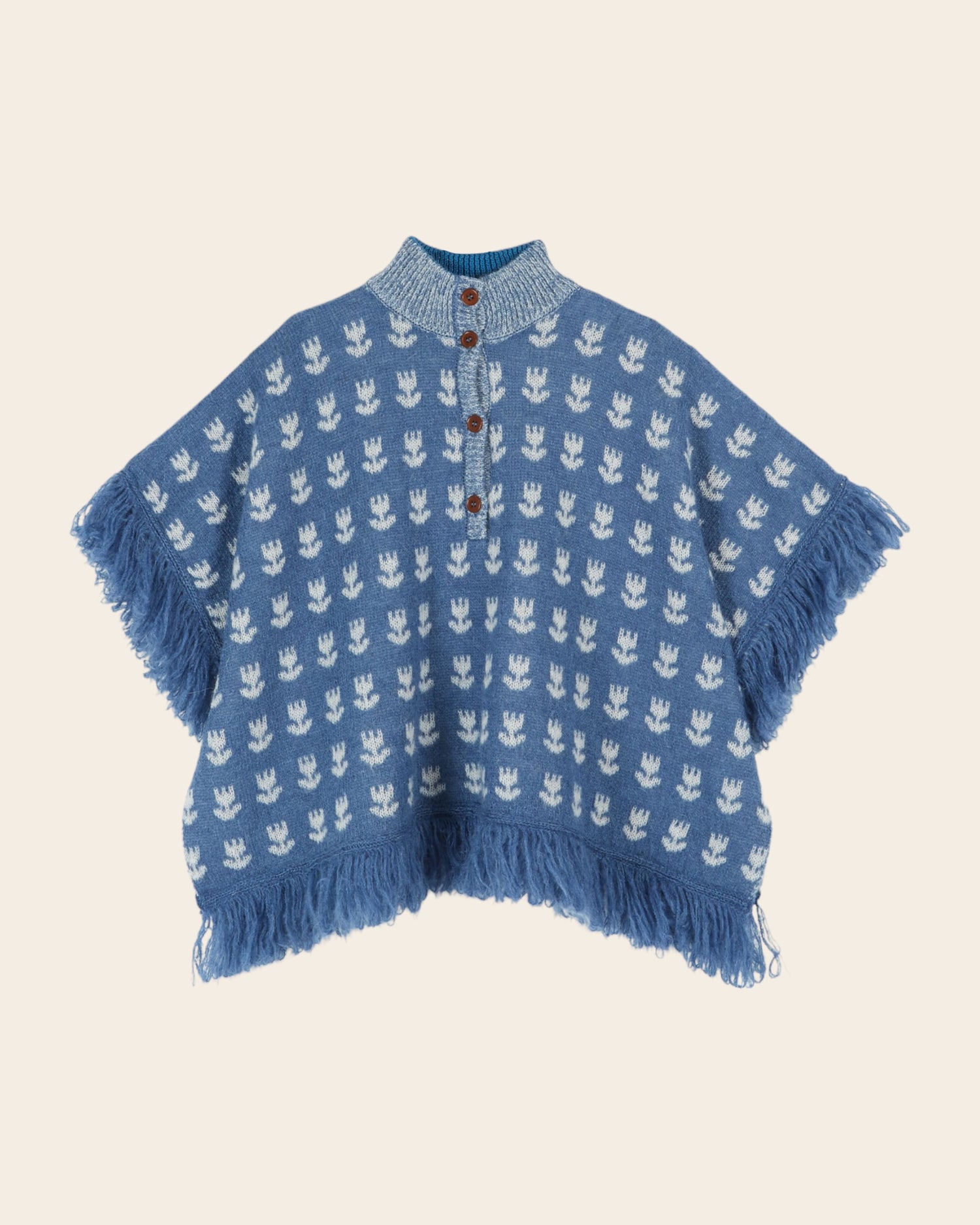 Poncho en laine mélangée bleu parsemé de tulipes blanches. Tricoté en jersey jacquard intarsia, ce poncho vous gardera dans le moelleux et la douceur tout au long de l’hiver.