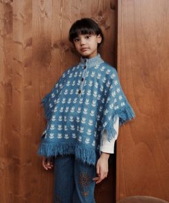 Poncho en laine mélangée bleu parsemé de tulipes blanches. Tricoté en jersey jacquard intarsia, ce poncho vous gardera dans le moelleux et la douceur tout au long de l’hiver.