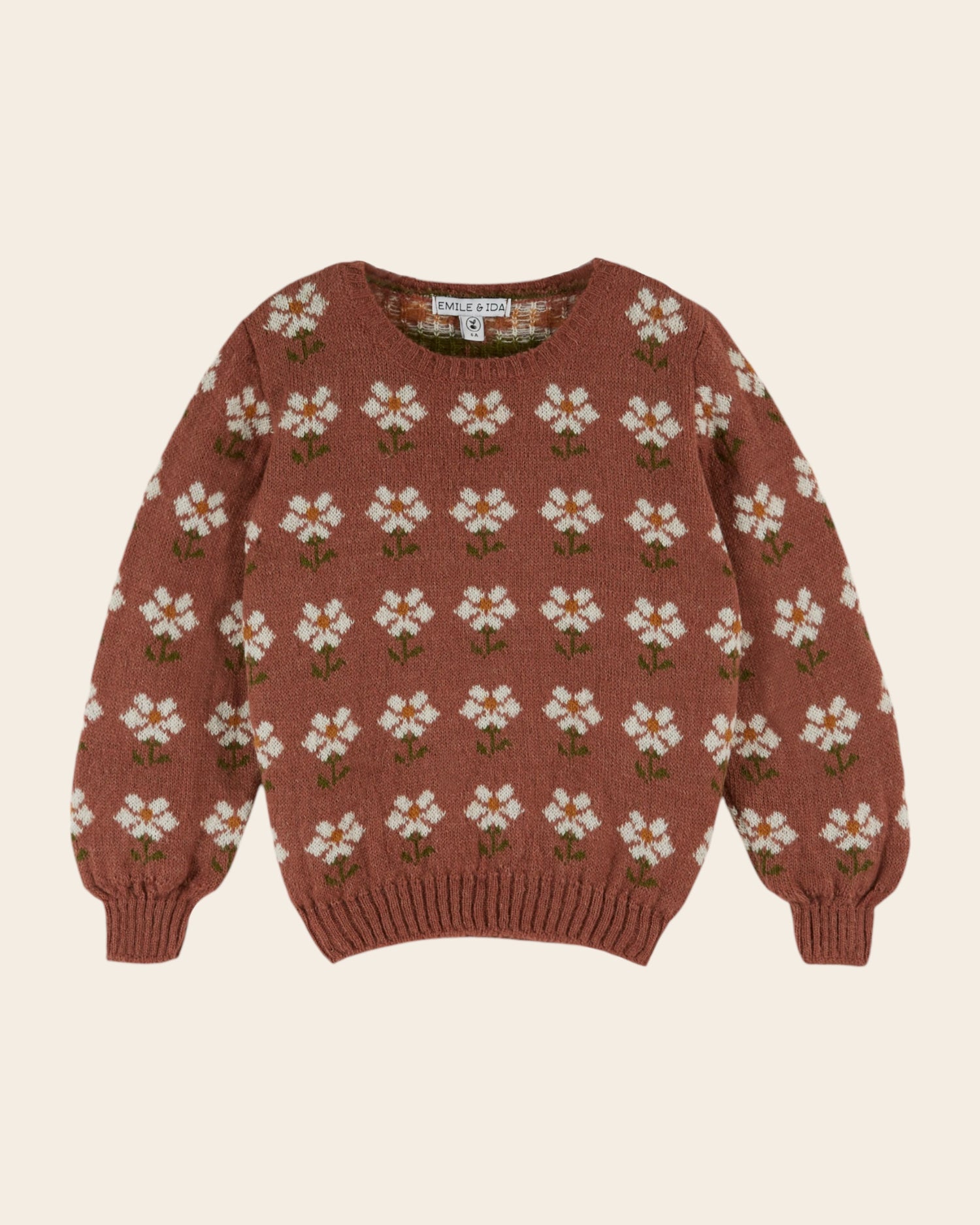 Pull-over jacquard bois de rose en laine d’alpaga parsemé de belles marguerites blanches aussi bien alignées que dans un jardin à la française. Ce lainage est tricoté au point de jersey dans un fil plutôt fin.