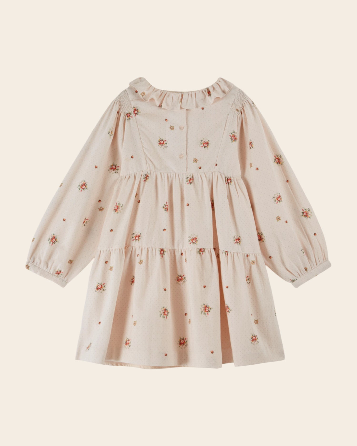 Robe à étages en flanelle de coton toute douce, imprimée de grains de bouquets de fleurettes multicolores sur un fond rose très pâle. Les découpes du corsage et les bouillonnés en tête de manches structurent la forme.