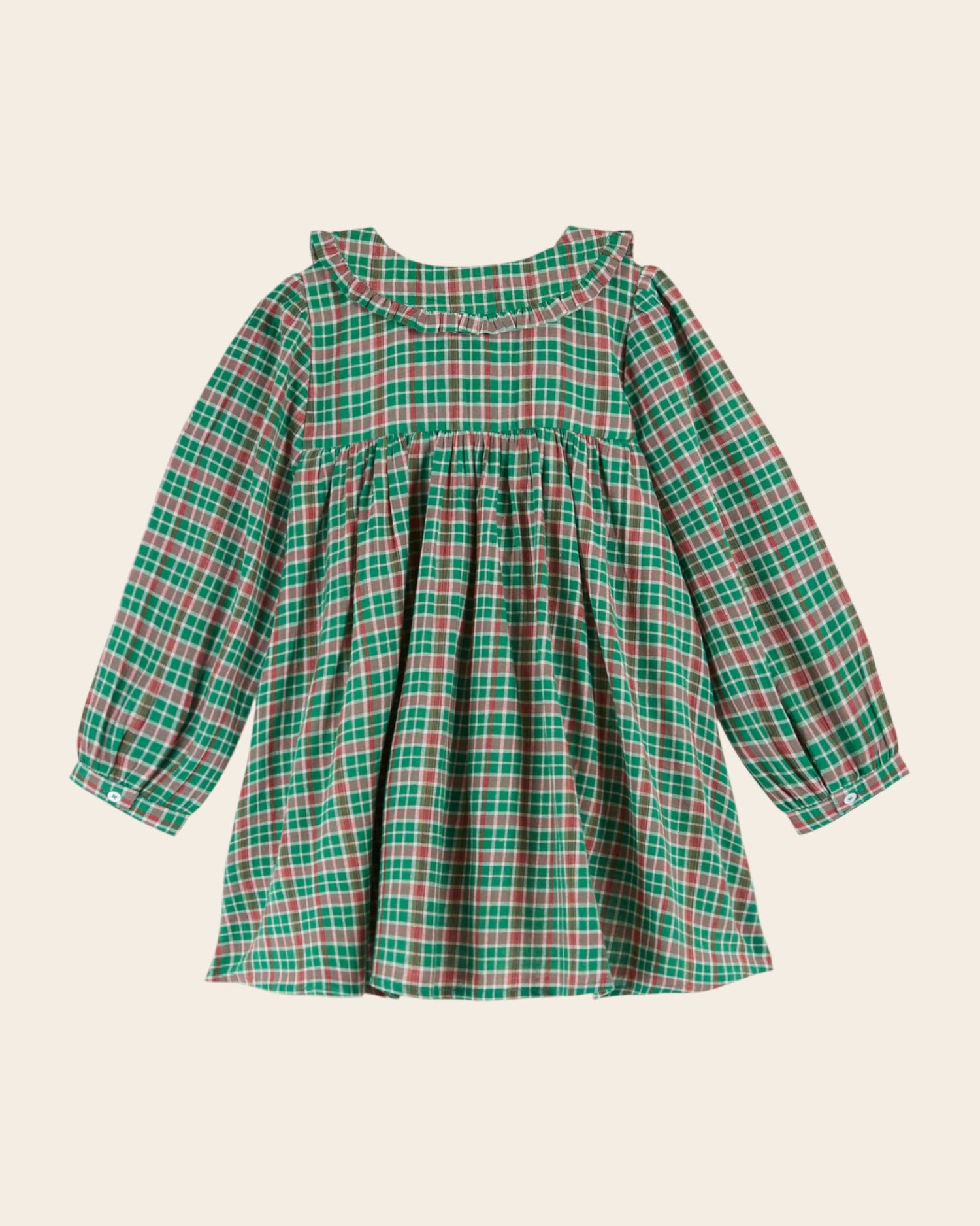 Robe en coton à carreaux vert, rouge et blanc, qui évoque le charme intemporel des tartans écossais.
