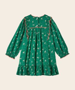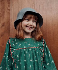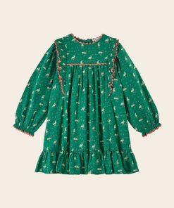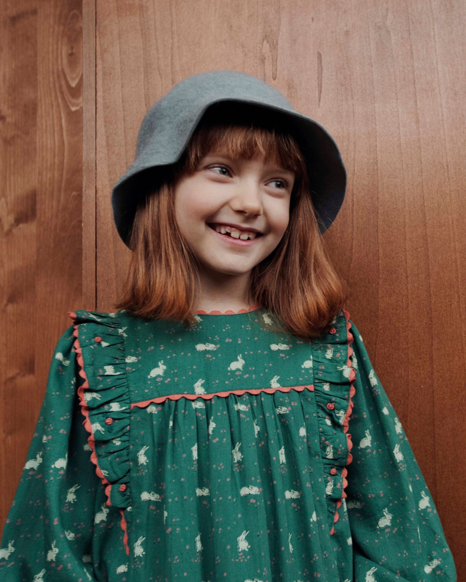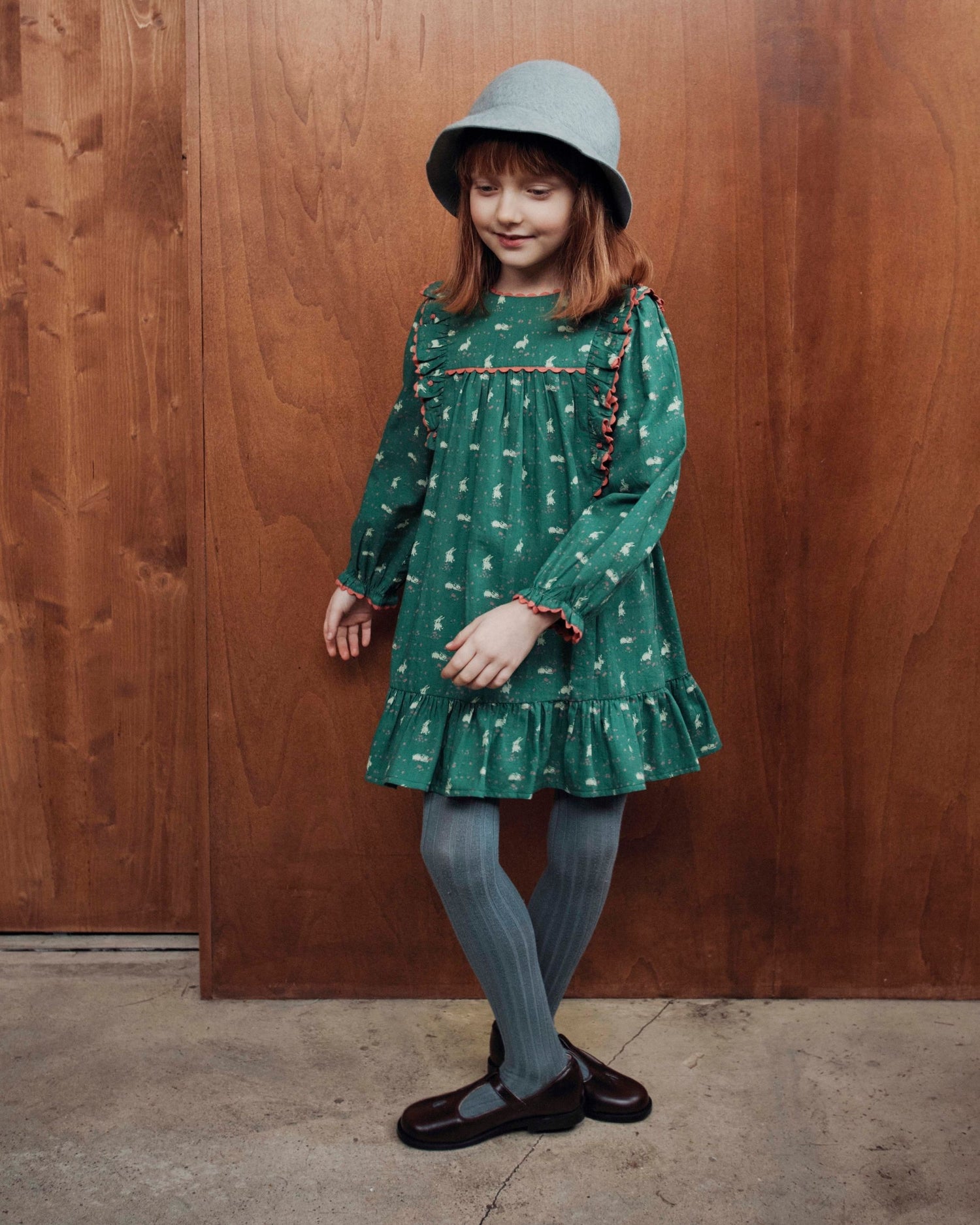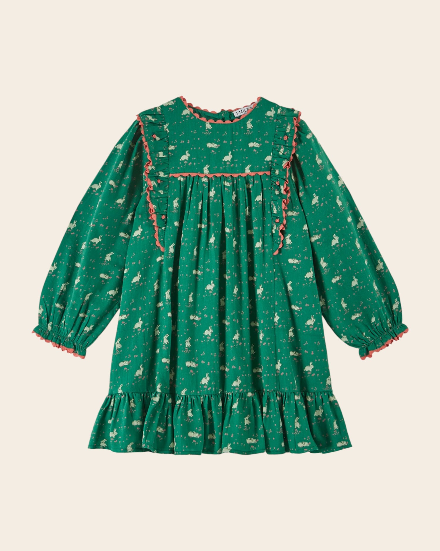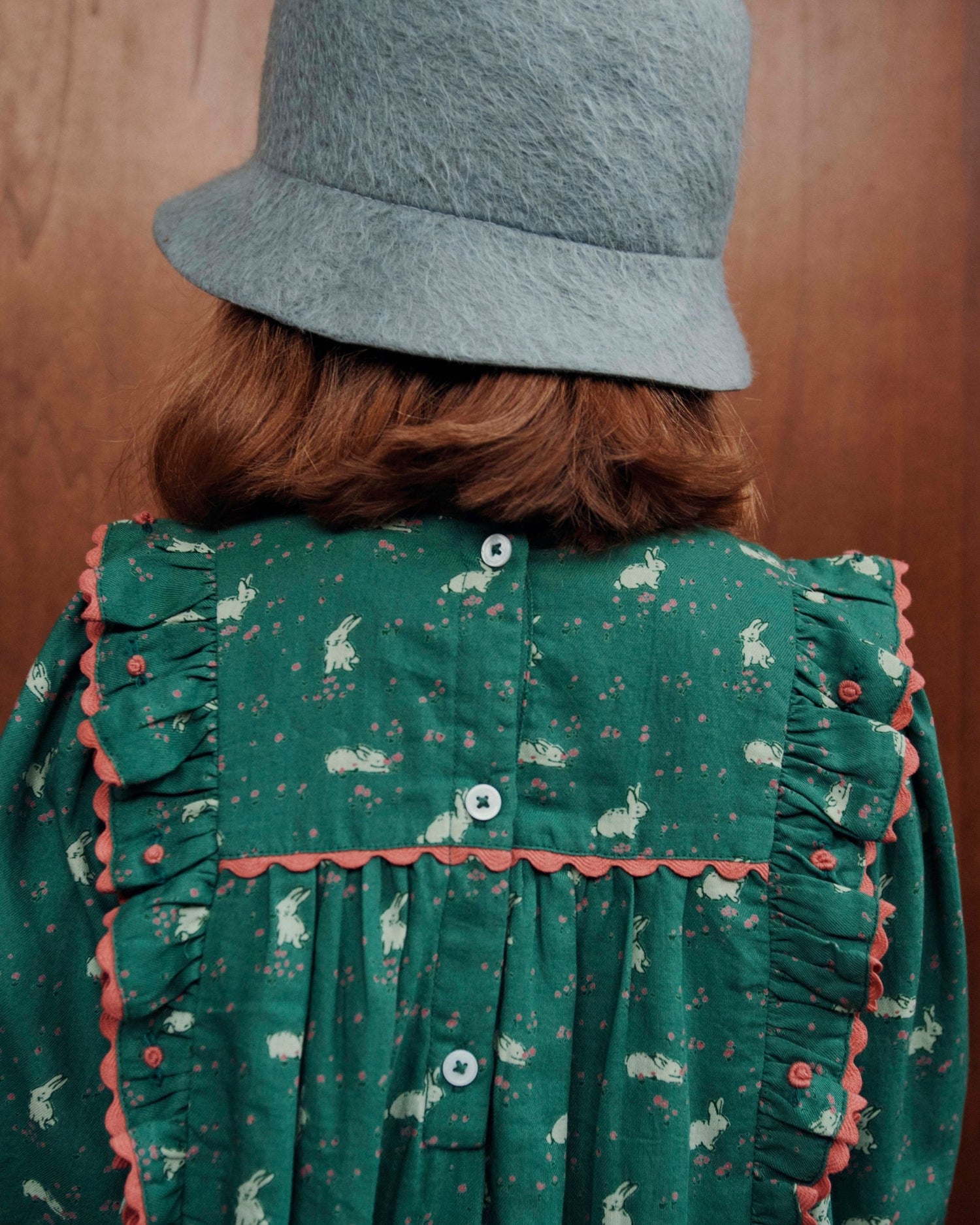 Robe volantée en coton vert où se promènent de petits lapins blancs.
