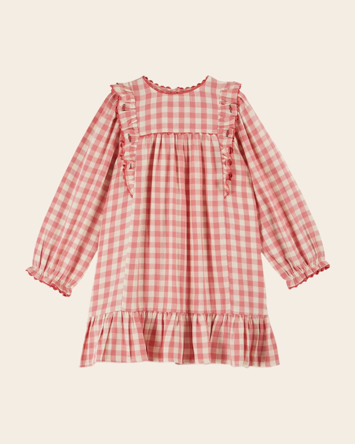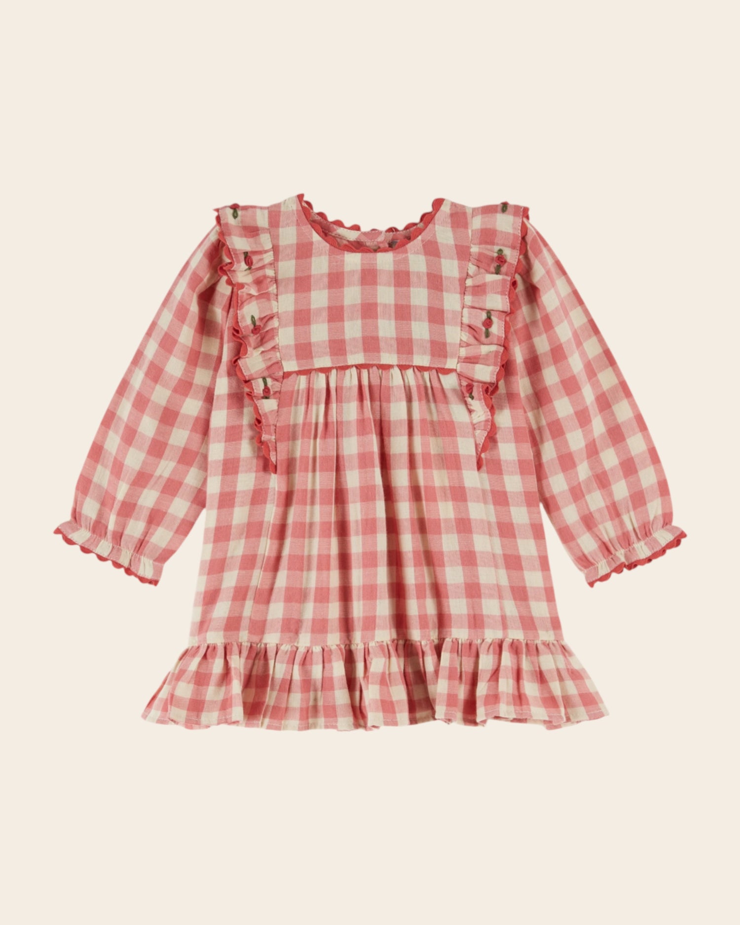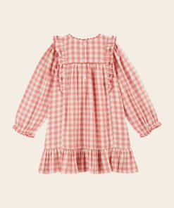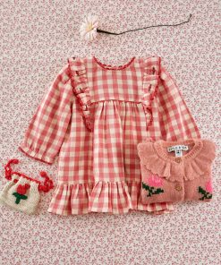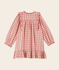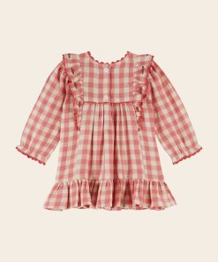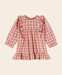 Robe volantée en gaze coton vichy rose et écru.