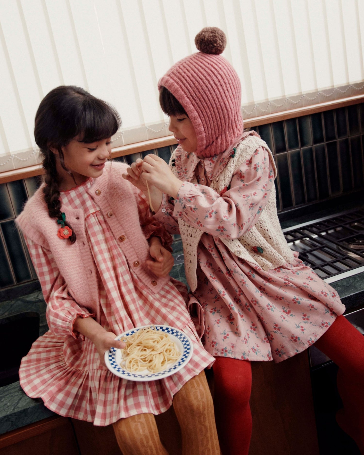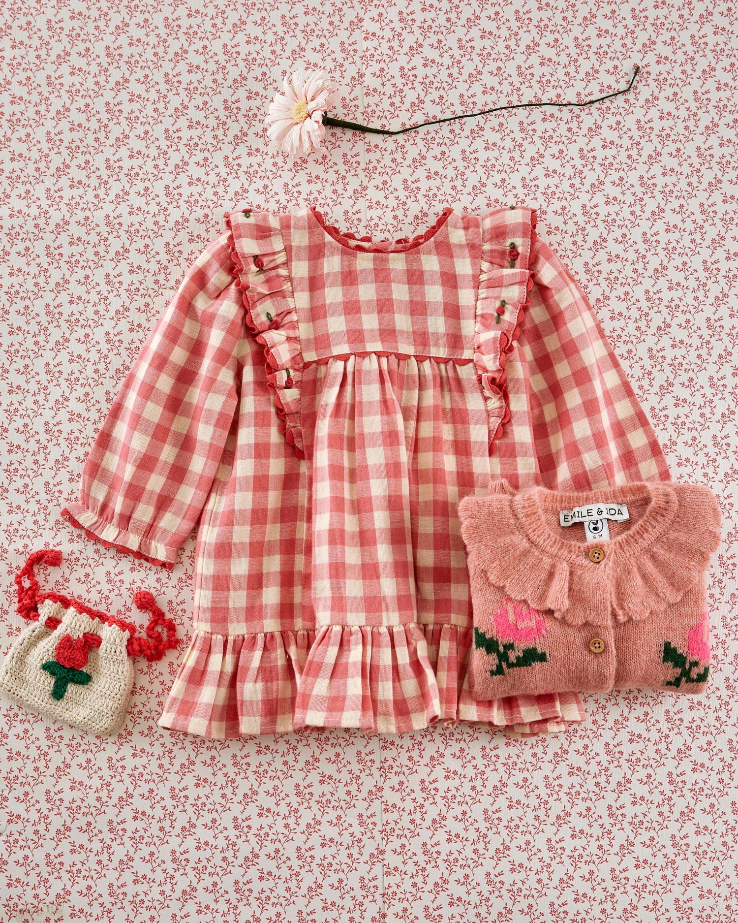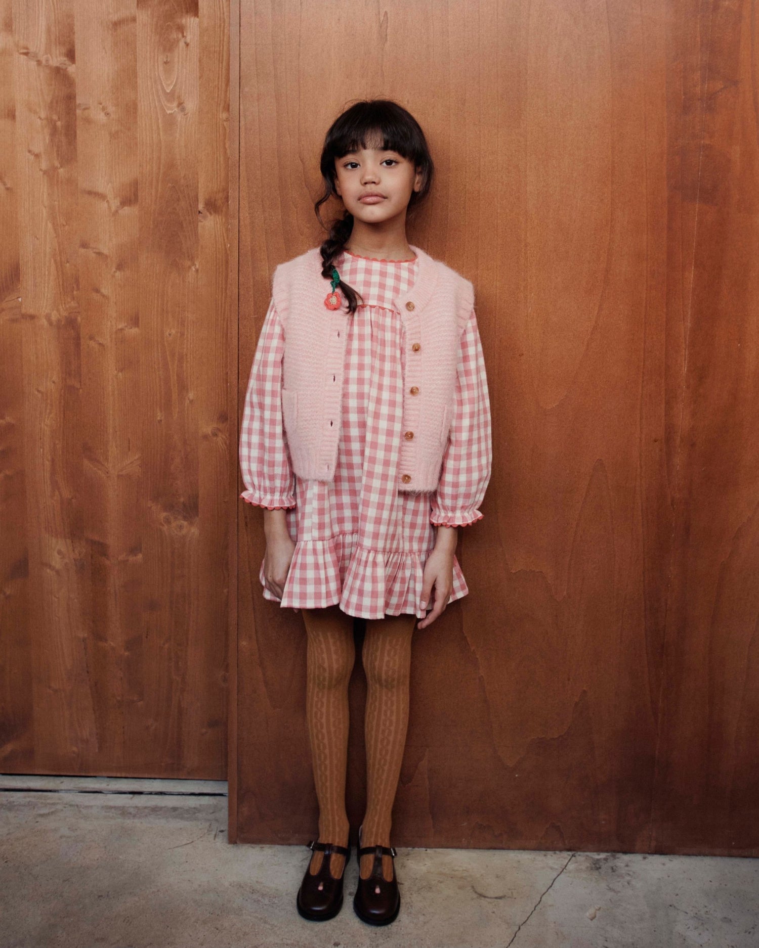 Robe volantée en gaze coton vichy rose et écru.