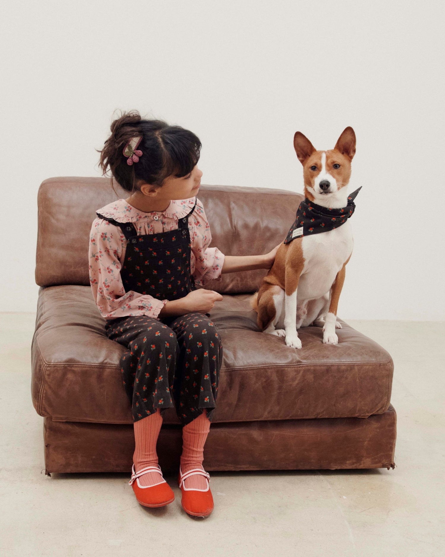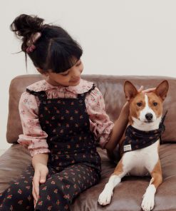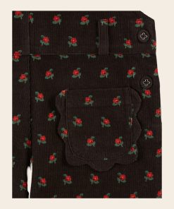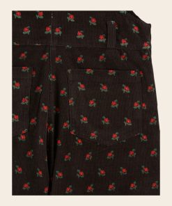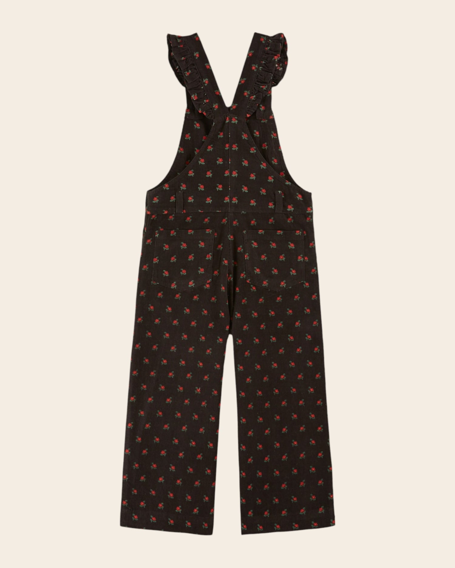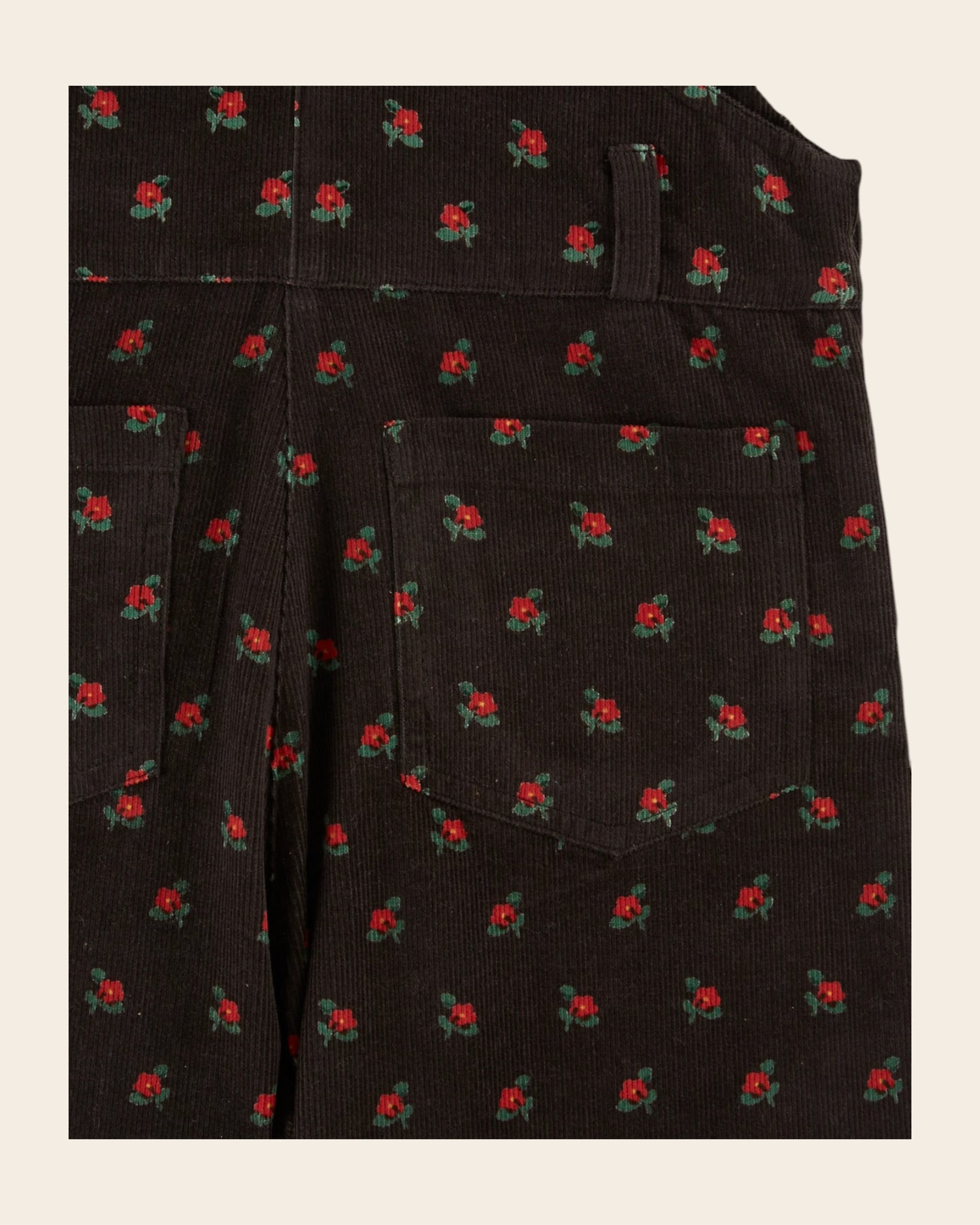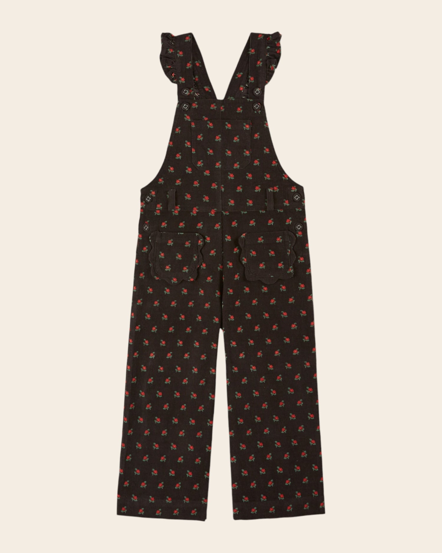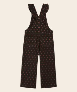 Salopette en velours de coton milleraie noir parsemé de coquelicots rouges en all-over.