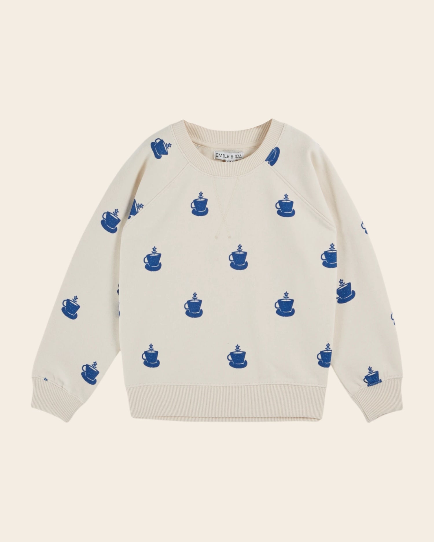 Sweatshirt en jersey de coton biologique molletonné et gratté écru imprimé en all-over de tasses fleuries bleues.