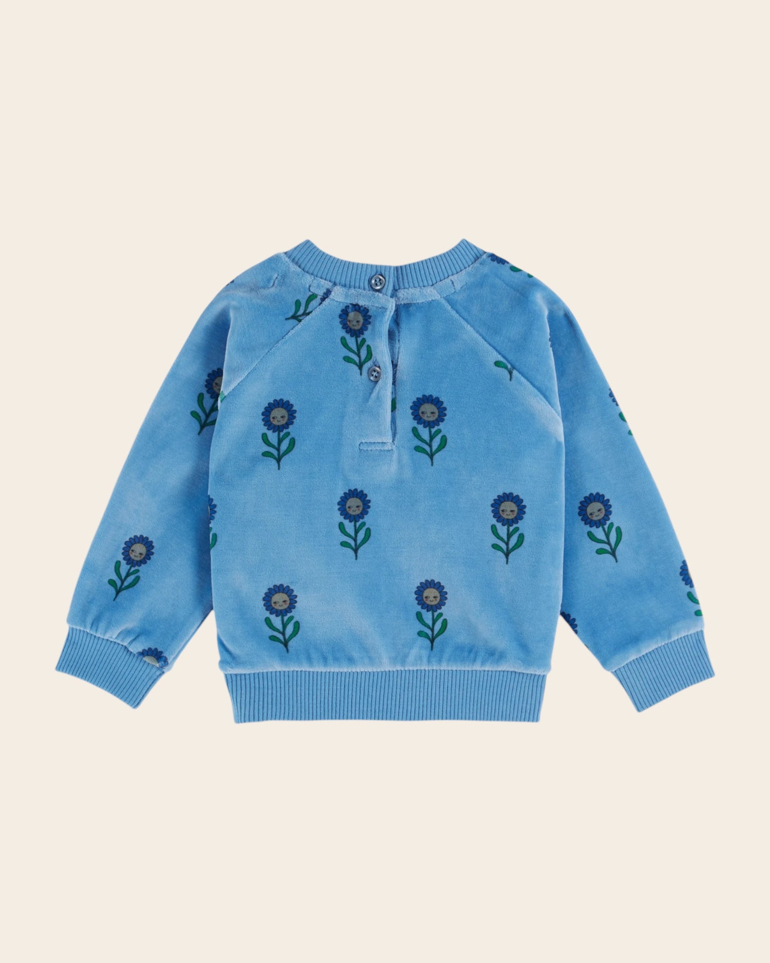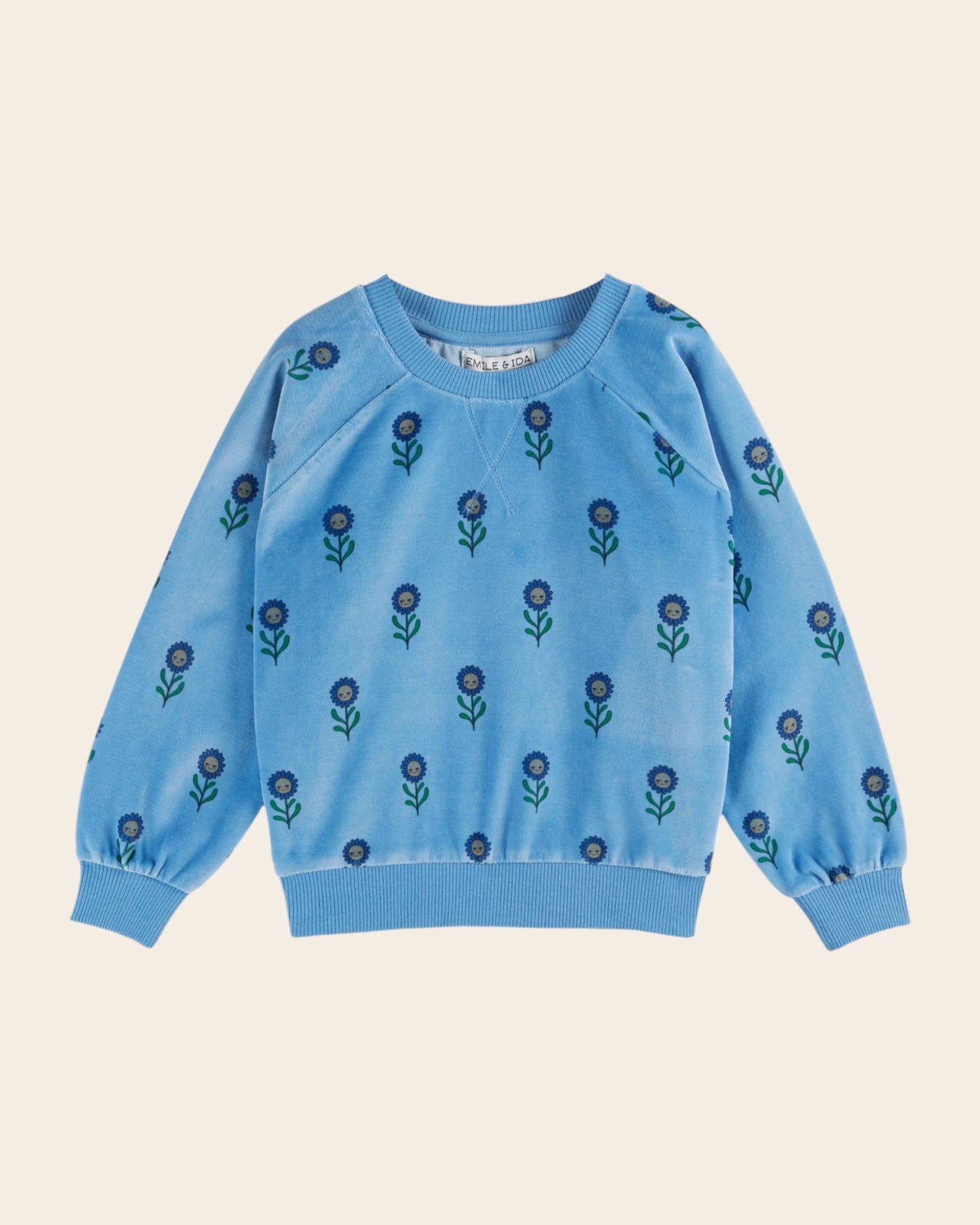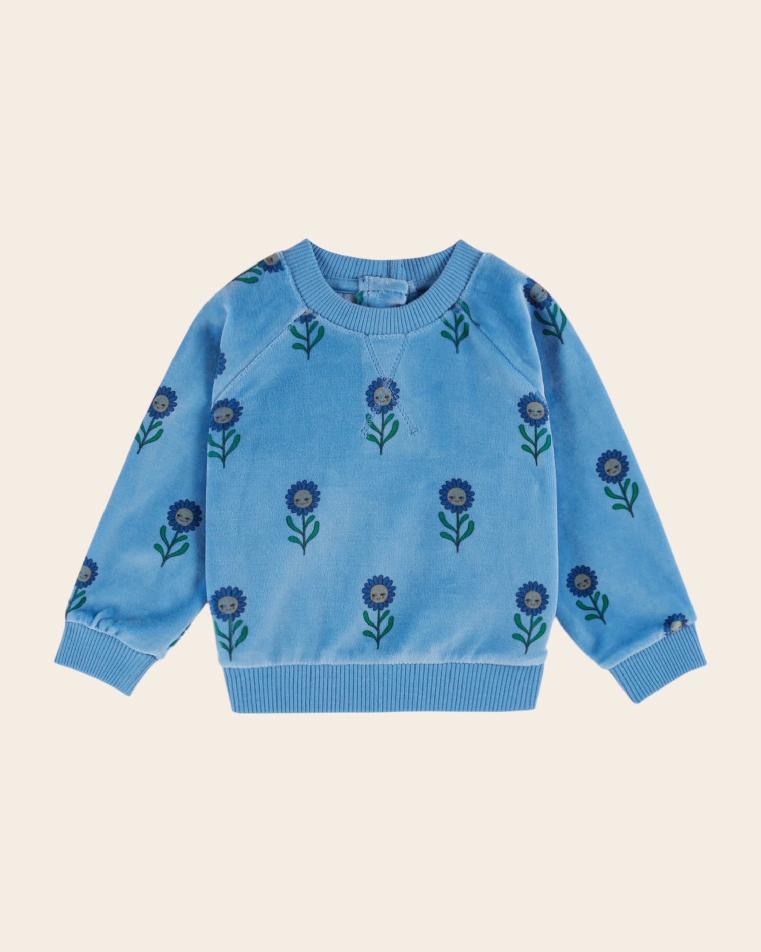 Sweatshirt en velours éponge bleu parsemé en all-over de marguerites bleu foncé.
