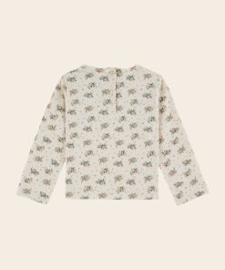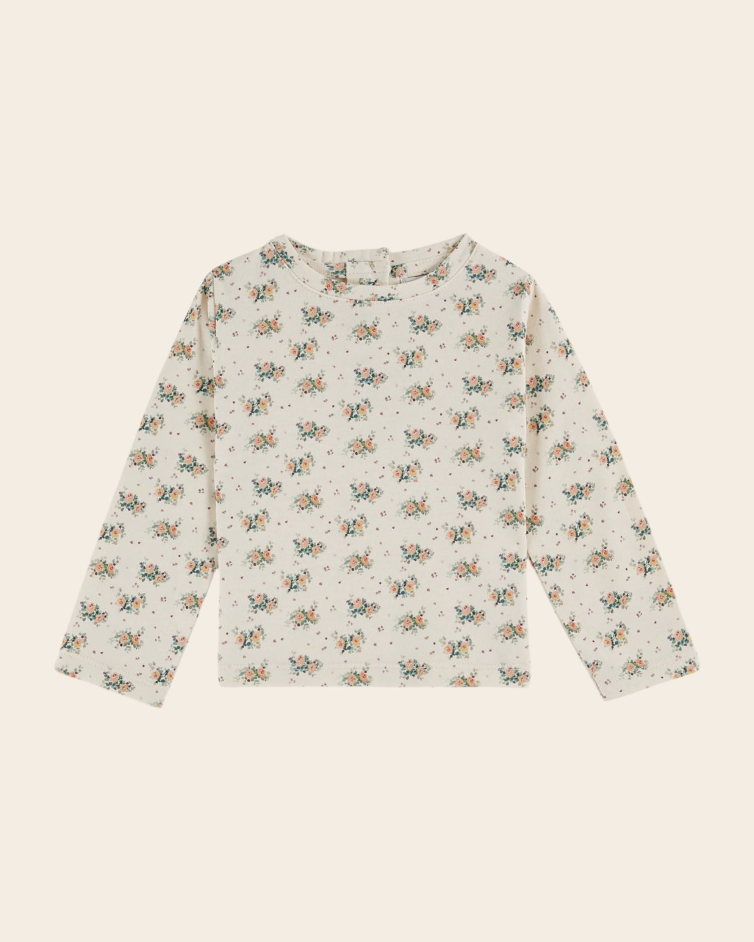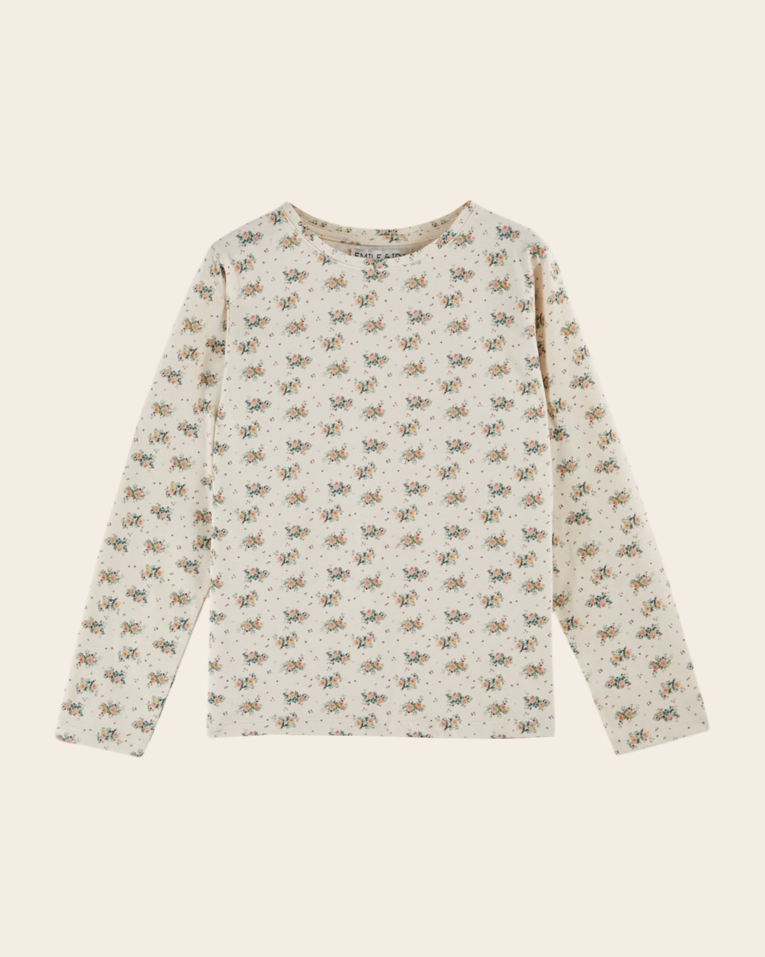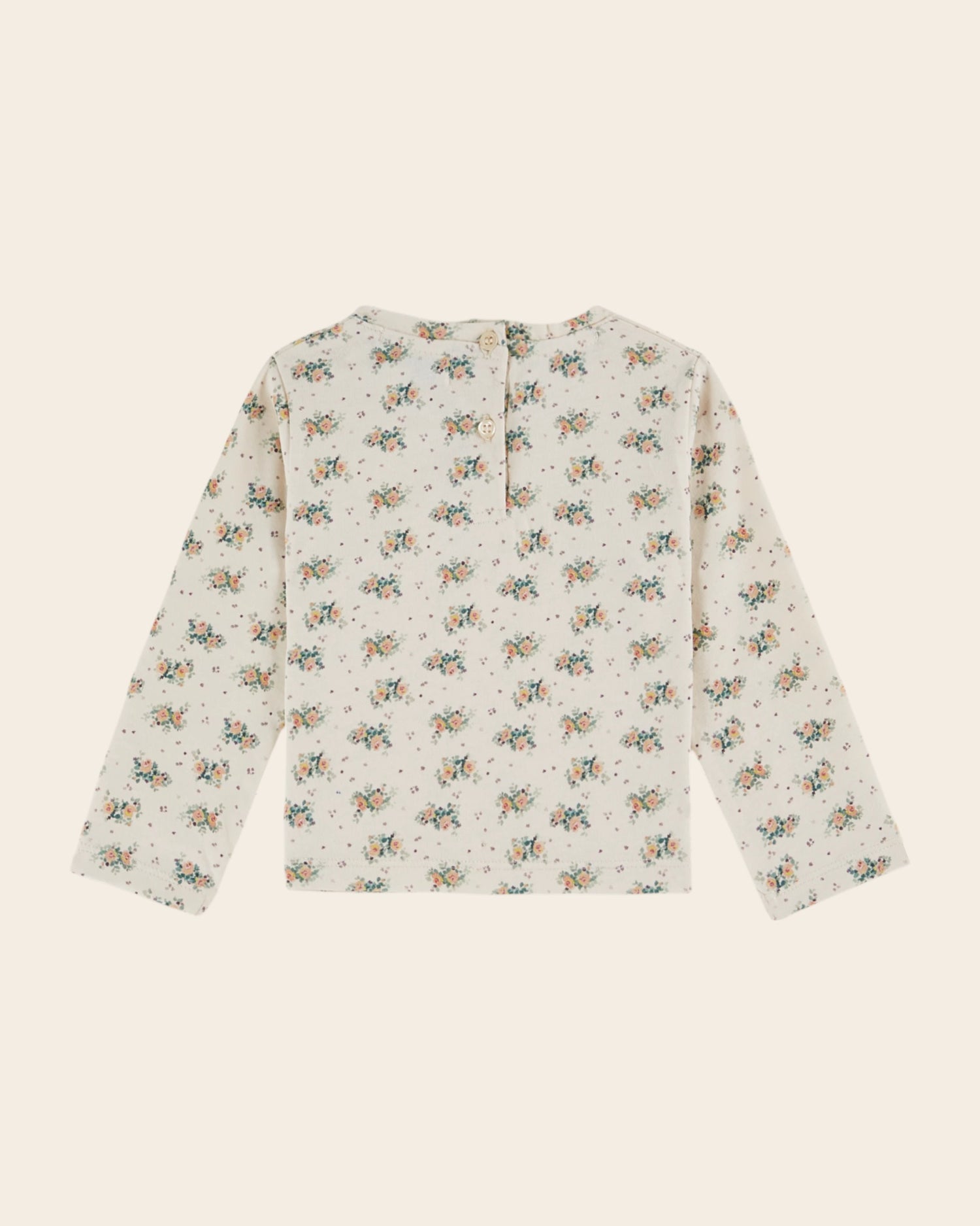 Tee-shirt en jersey de coton biologique écru sur lequel sont imprimées des bouquets de fleurs aux couleurs aussi douces que la matière.
