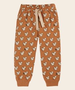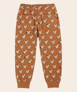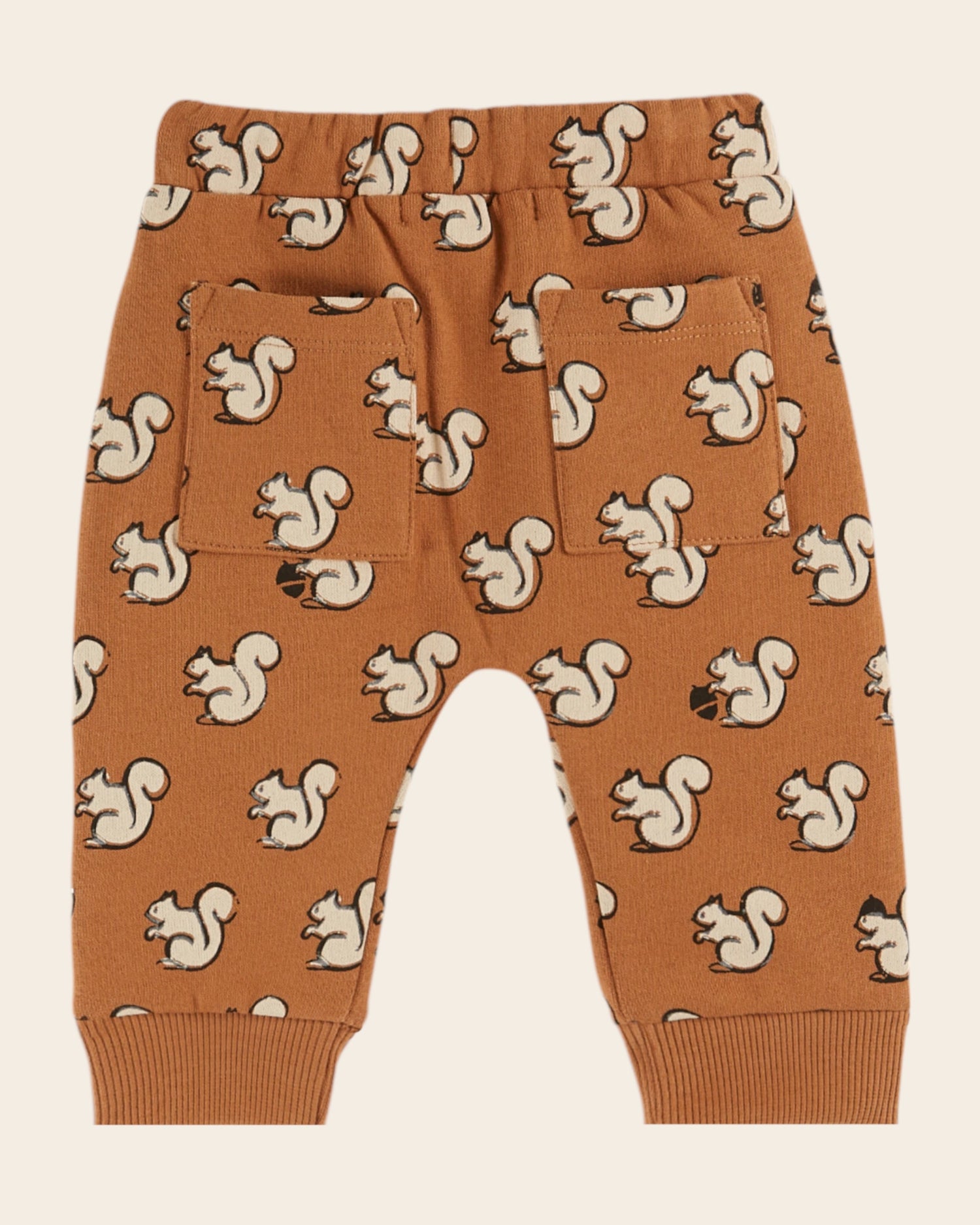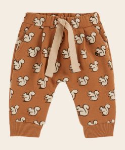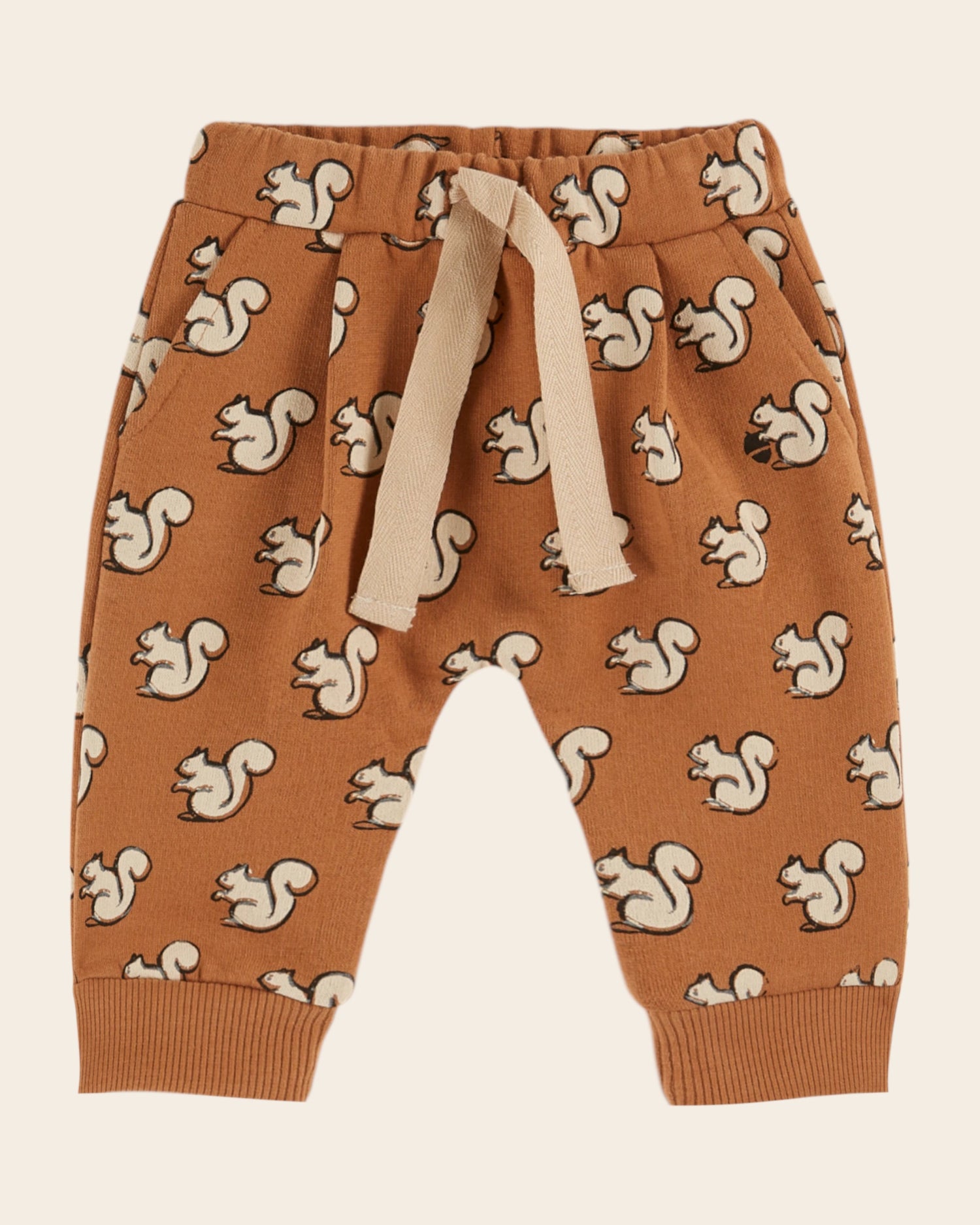 Jogger en jersey de coton biologique marron imprimé d’écureuils crème en all-over. Le coton est molletonné et gratté pour plus de douceur et de chaleur.