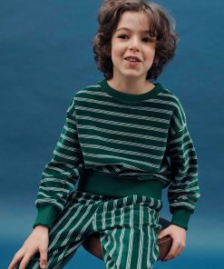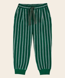 Jogger en velours ras de coton et polyester à rayures blanches sur fond vert.
