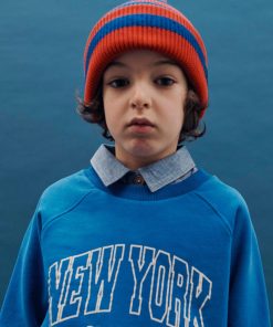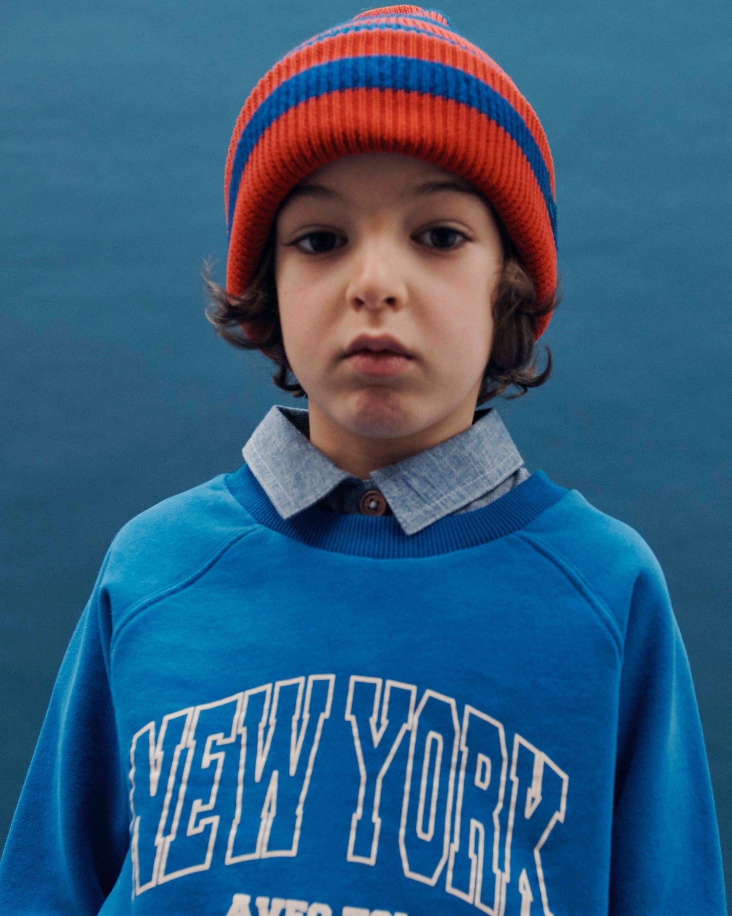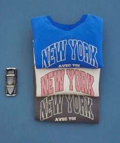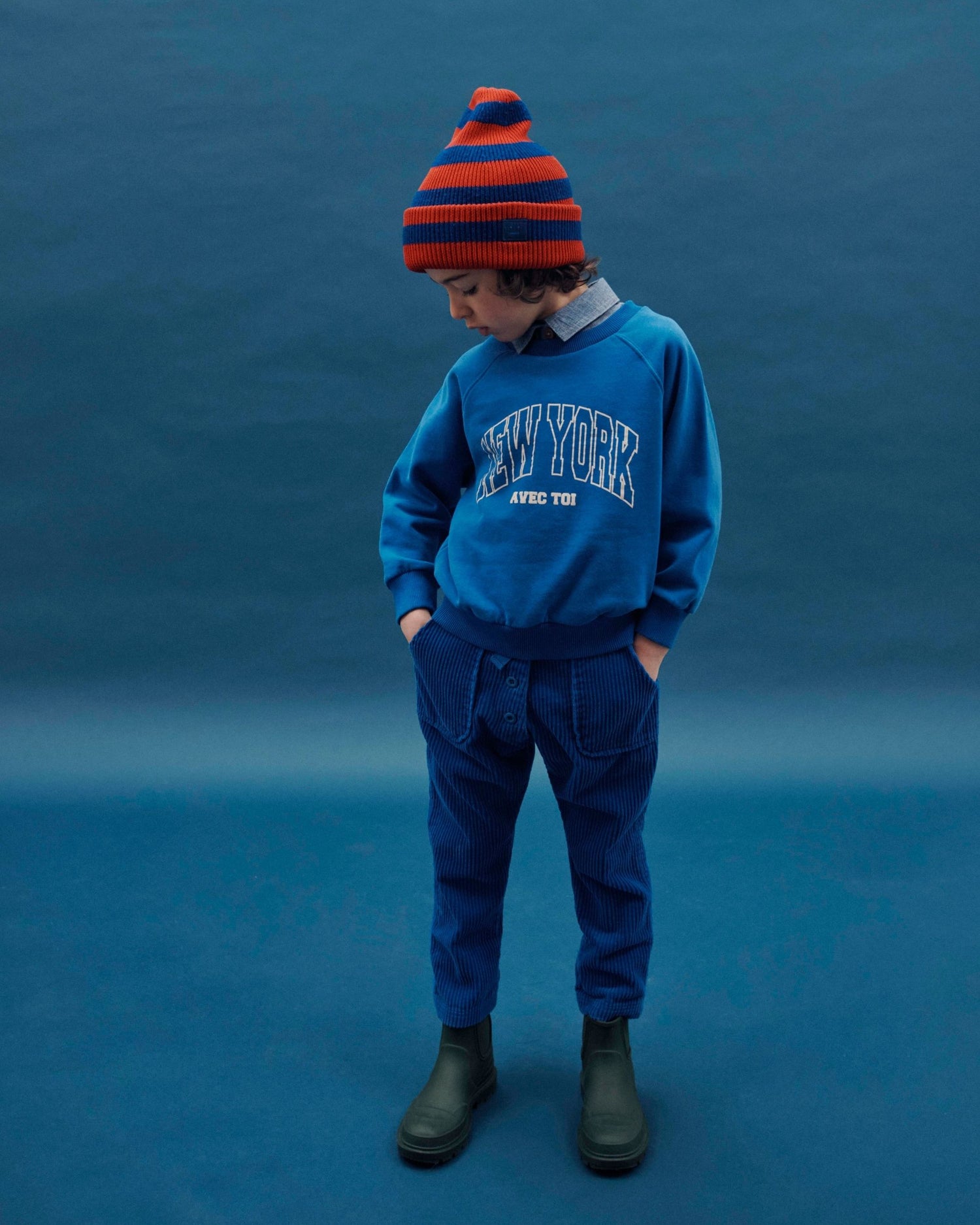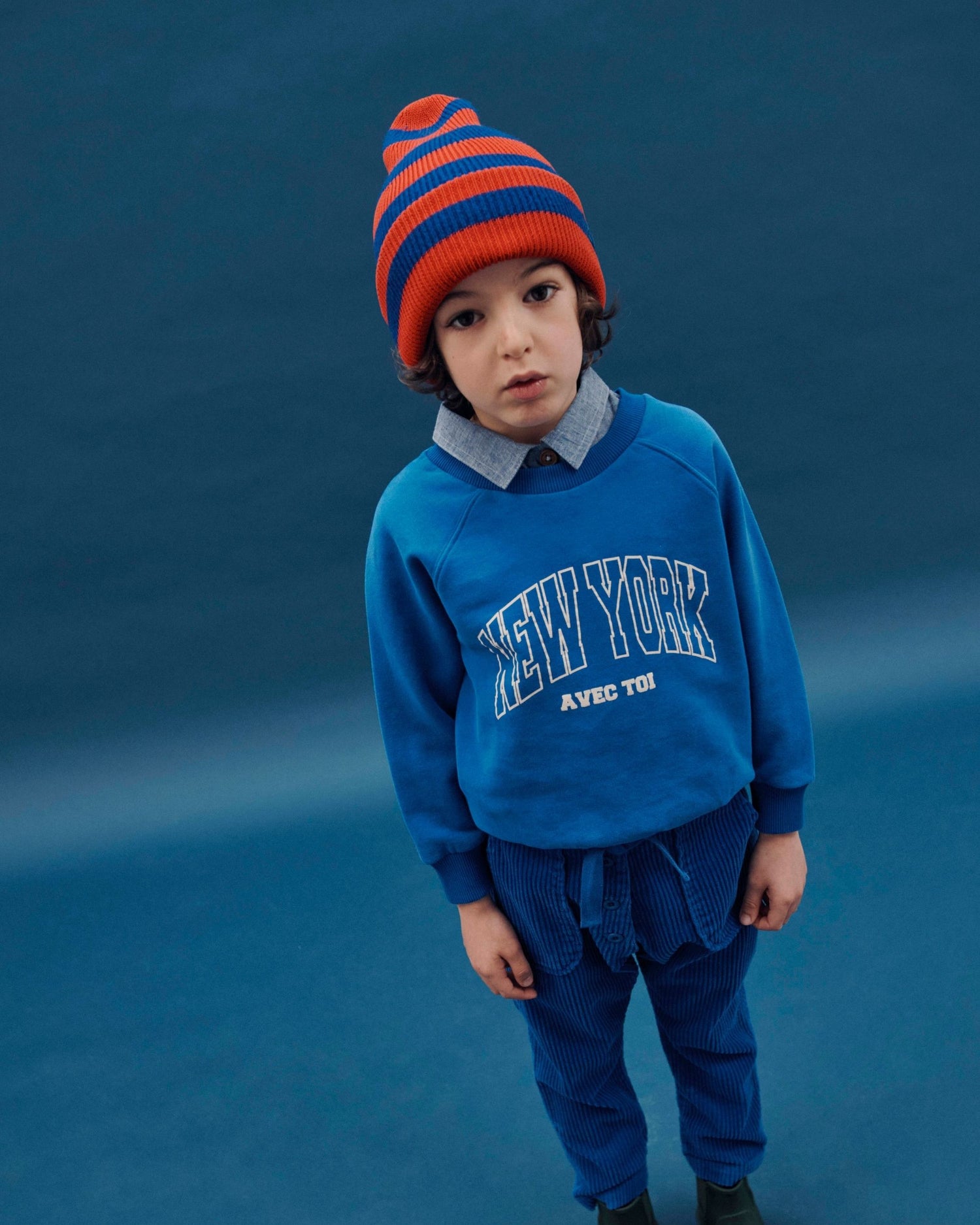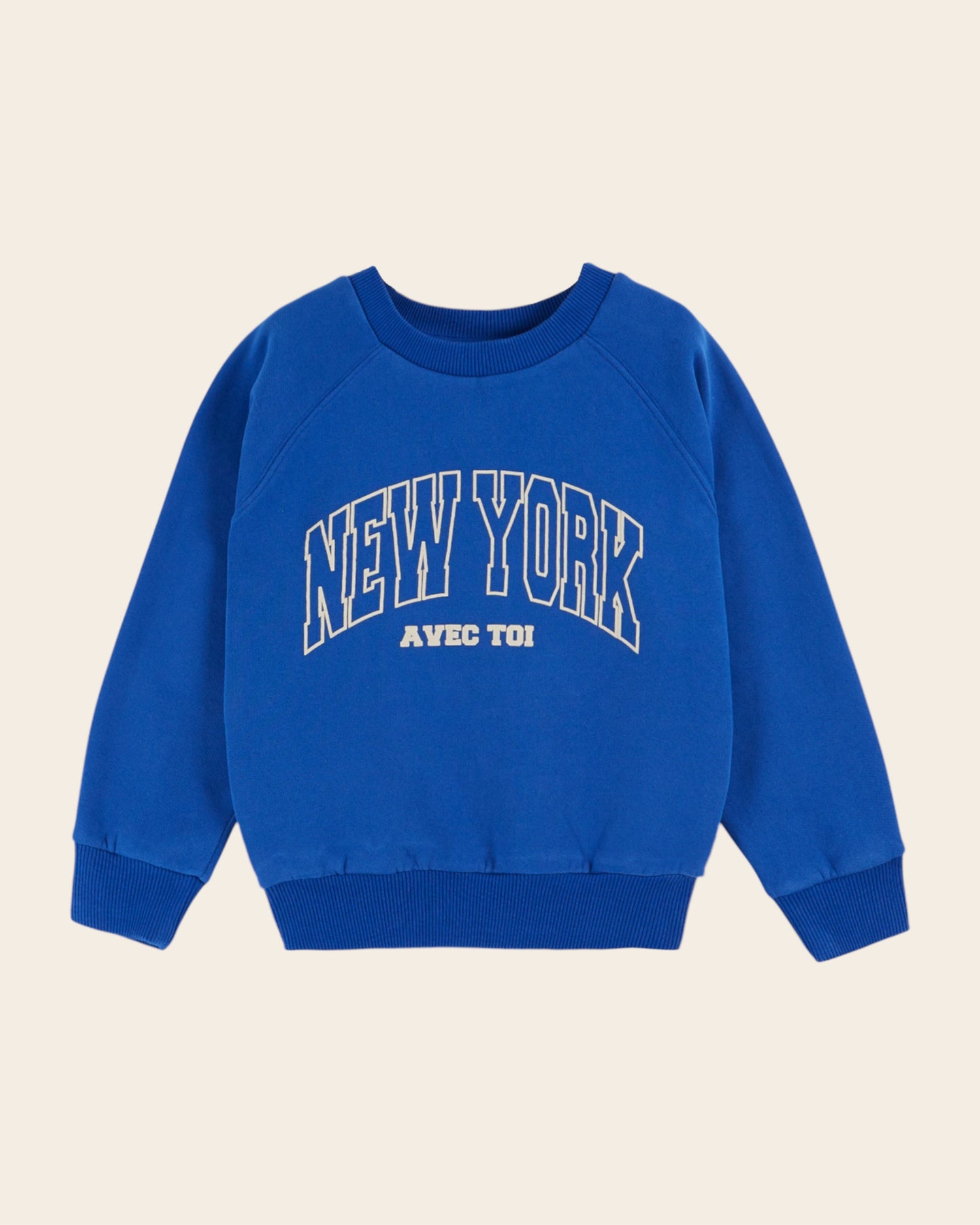 Sweatshirt en jersey de coton biologique molletonné et gratté bleu France imprimé » New York avec toi » sur la poitrine.